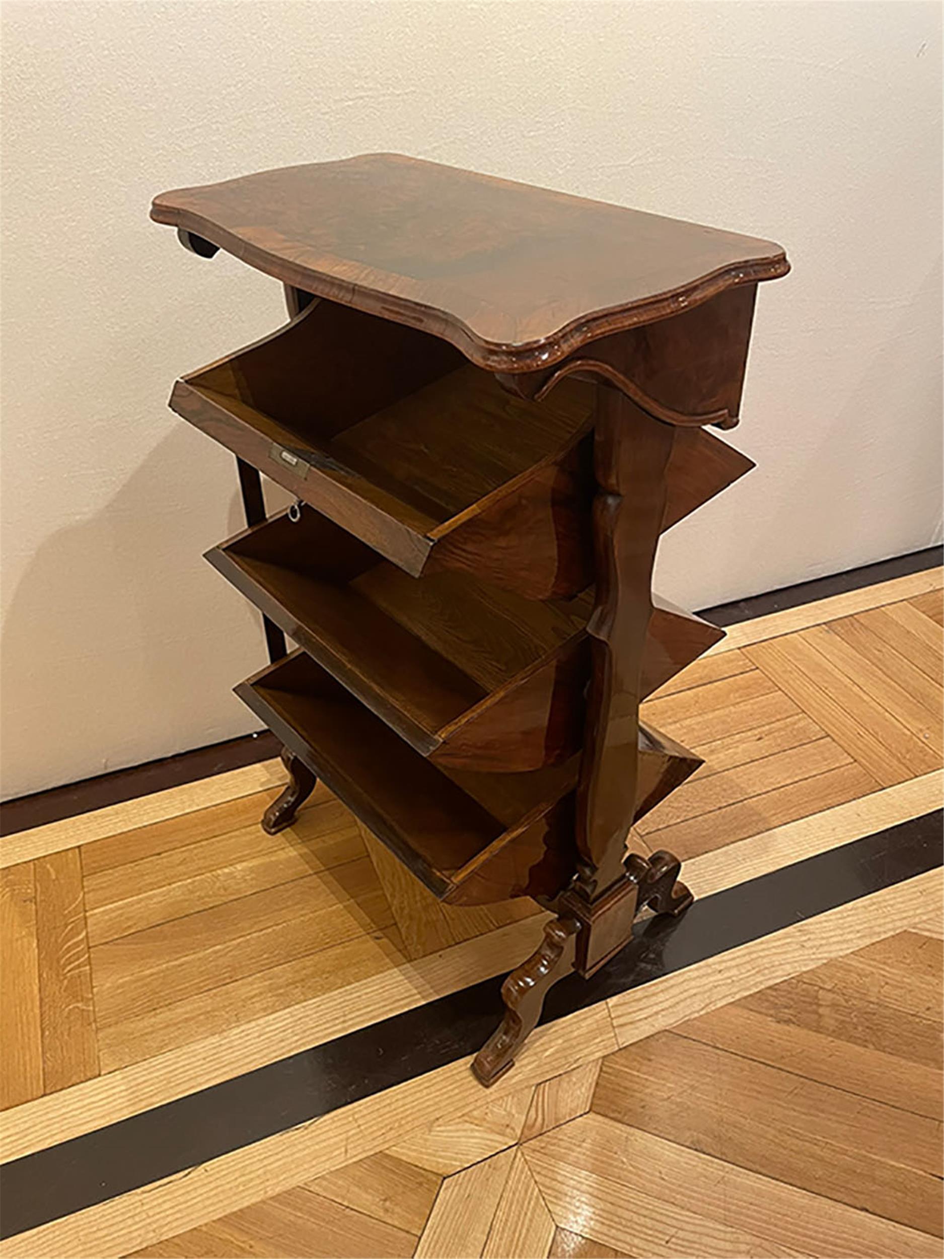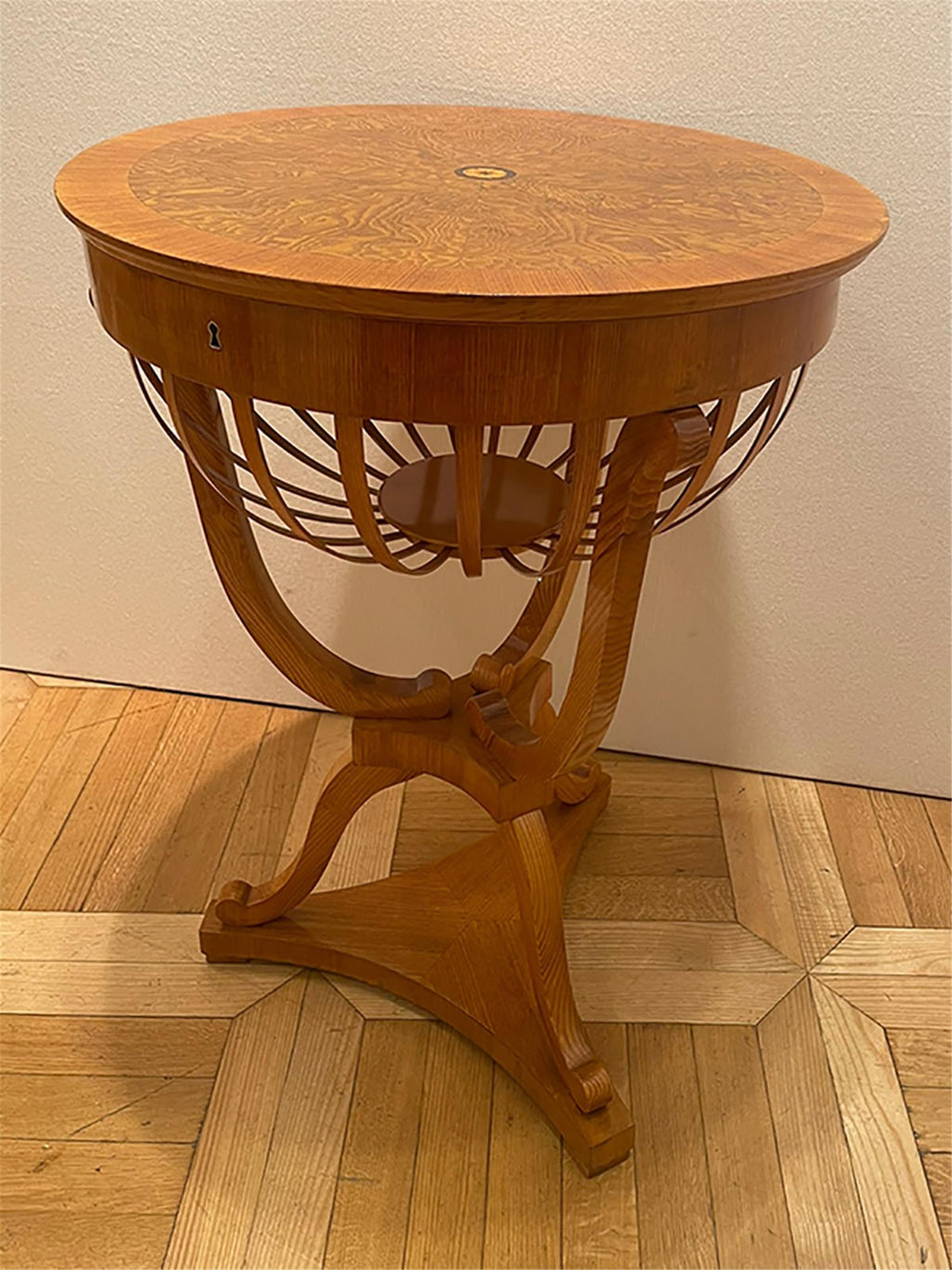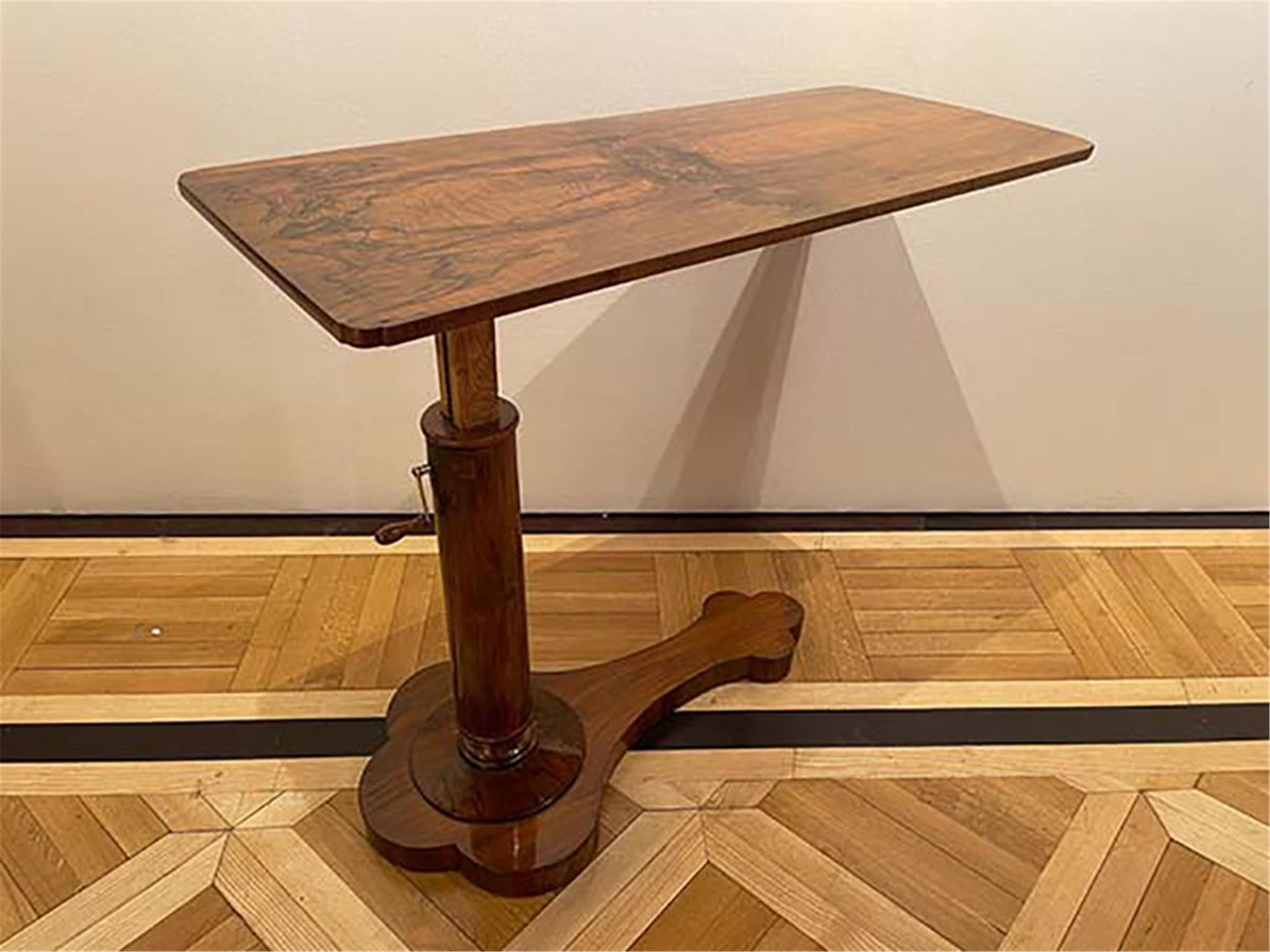 Dieser außergewöhnliche Biedermeier-Salontisch aus Wien um 1825 fasziniert durch seine klare Formensprache und sein besonders ansprechendes Nussbaum-Furnierbild, das sich in einer radialen – beinahe blütenartigen – Struktur über die gesamte runde Tischplatte erstreckt.