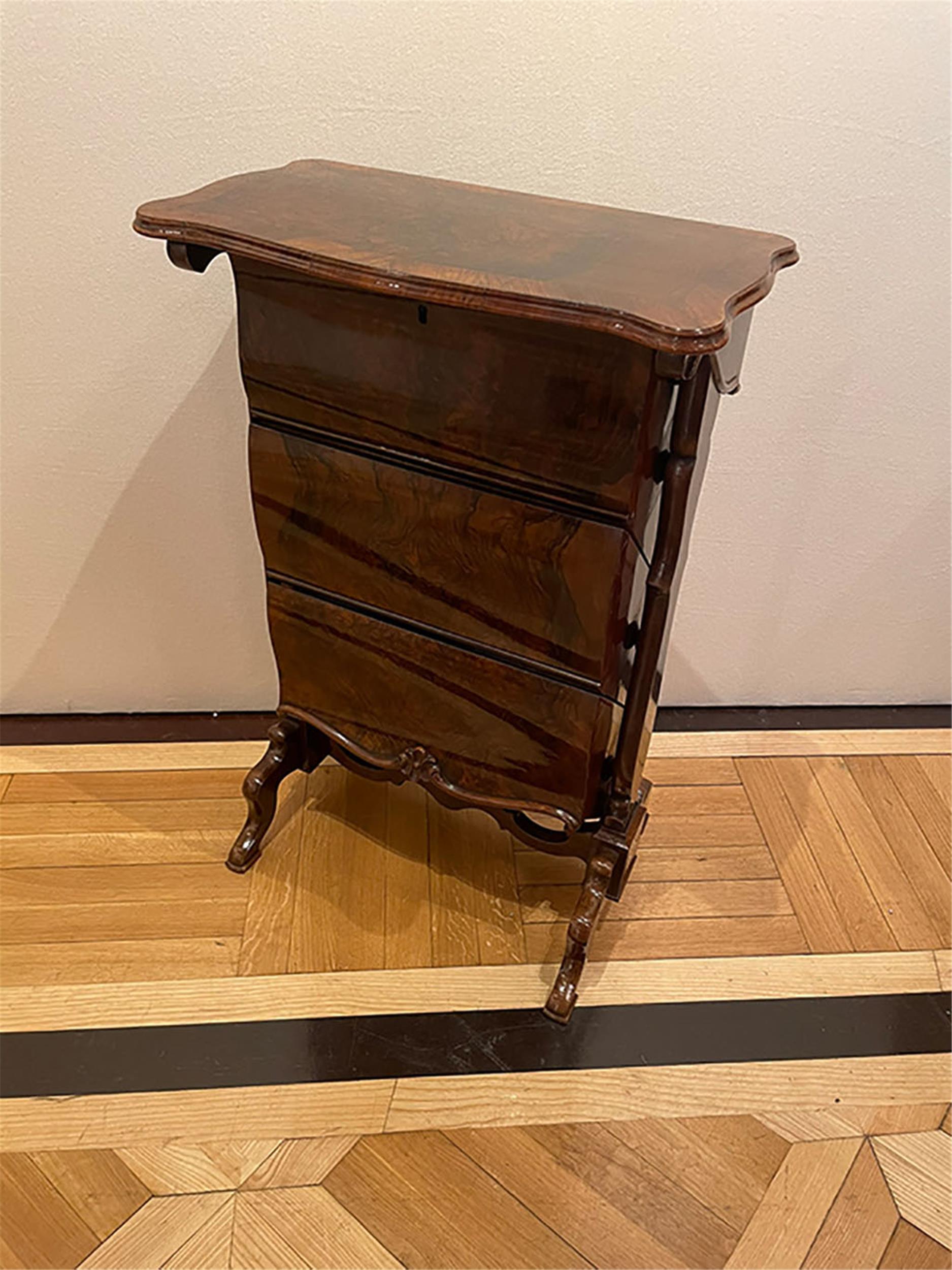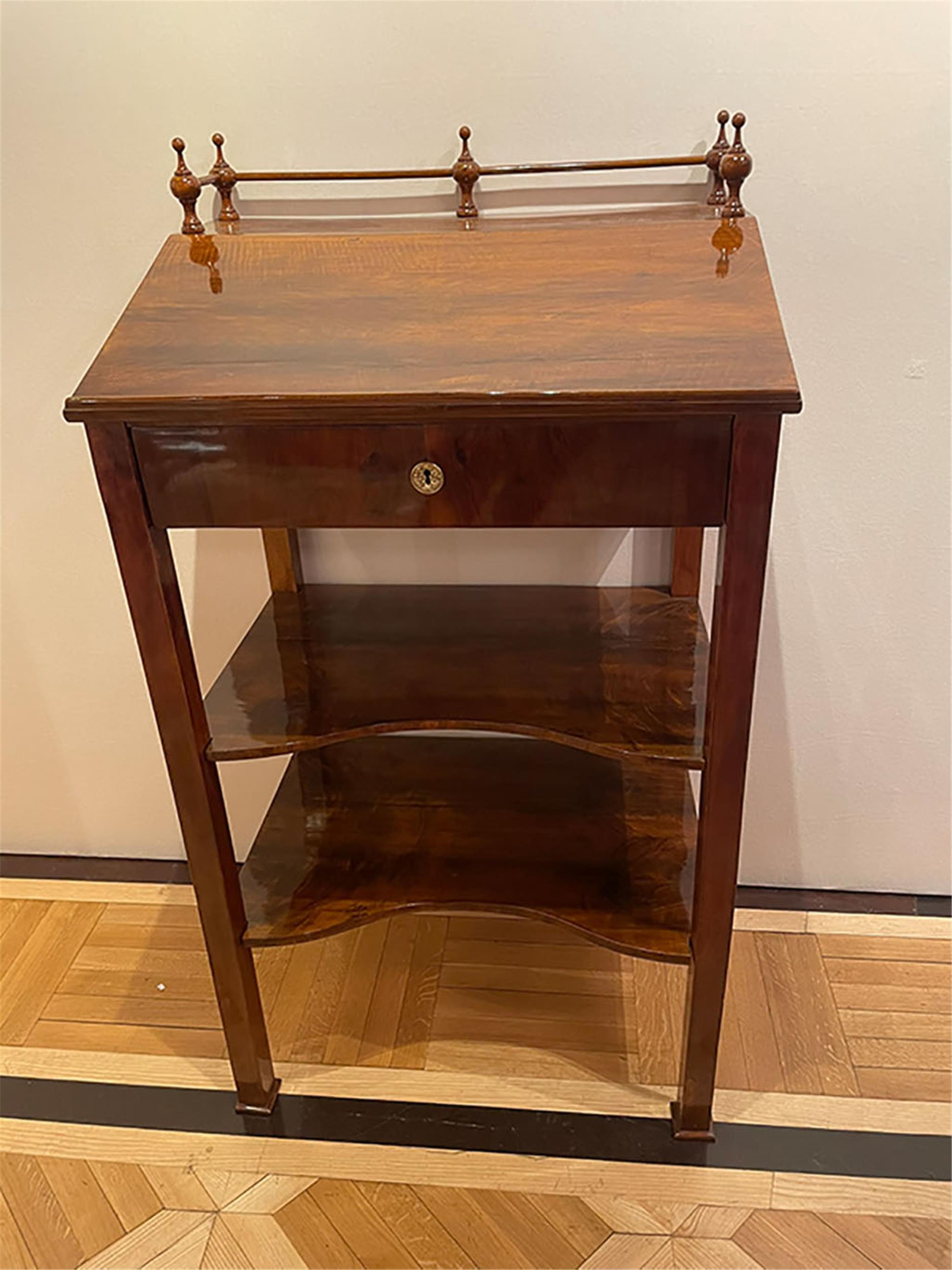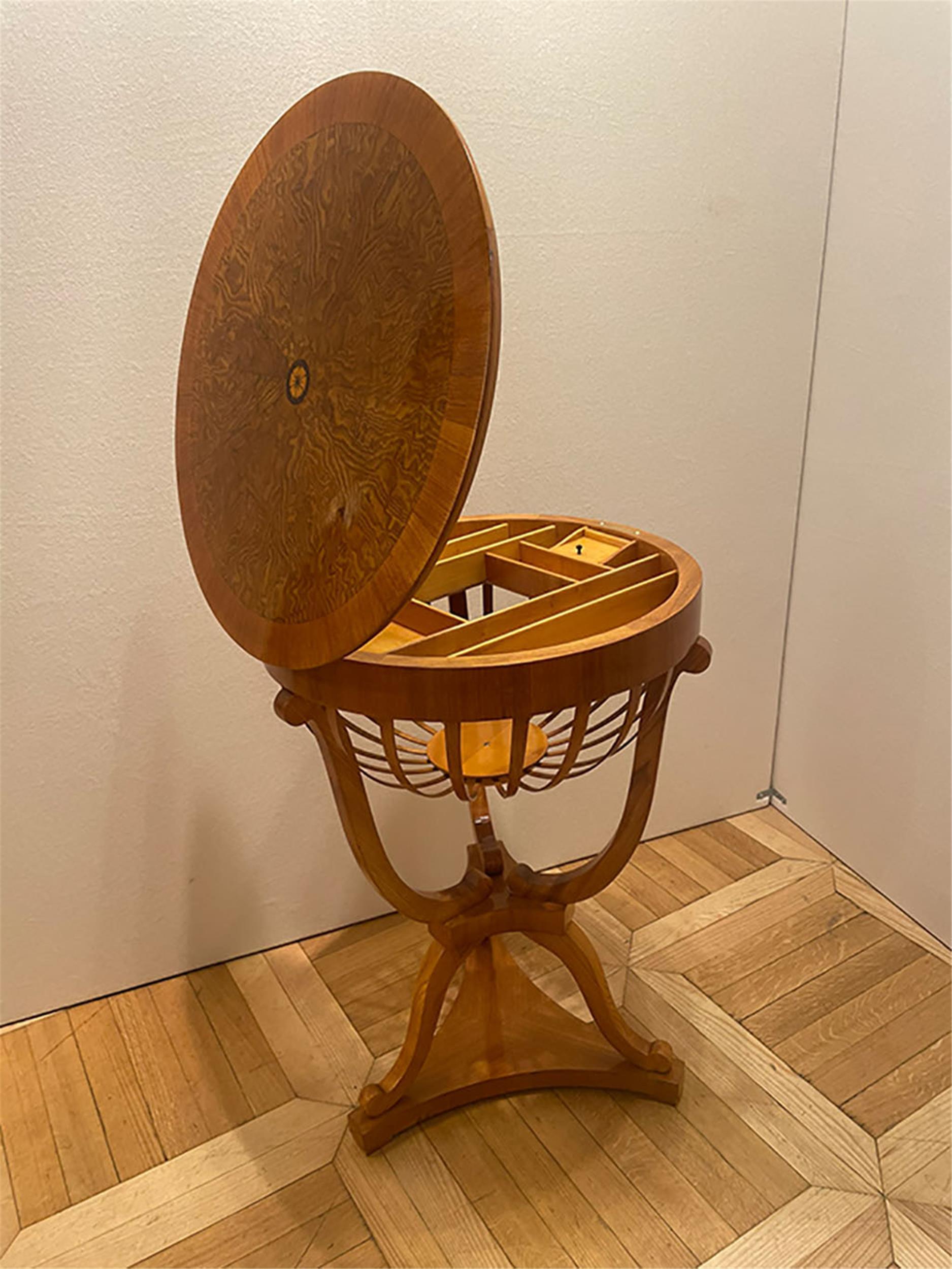 Dieser außergewöhnliche Biedermeier-Salontisch aus Wien um 1825 fasziniert durch seine klare Formensprache und sein besonders ansprechendes Nussbaum-Furnierbild, das sich in einer radialen – beinahe blütenartigen – Struktur über die gesamte runde Tischplatte erstreckt.