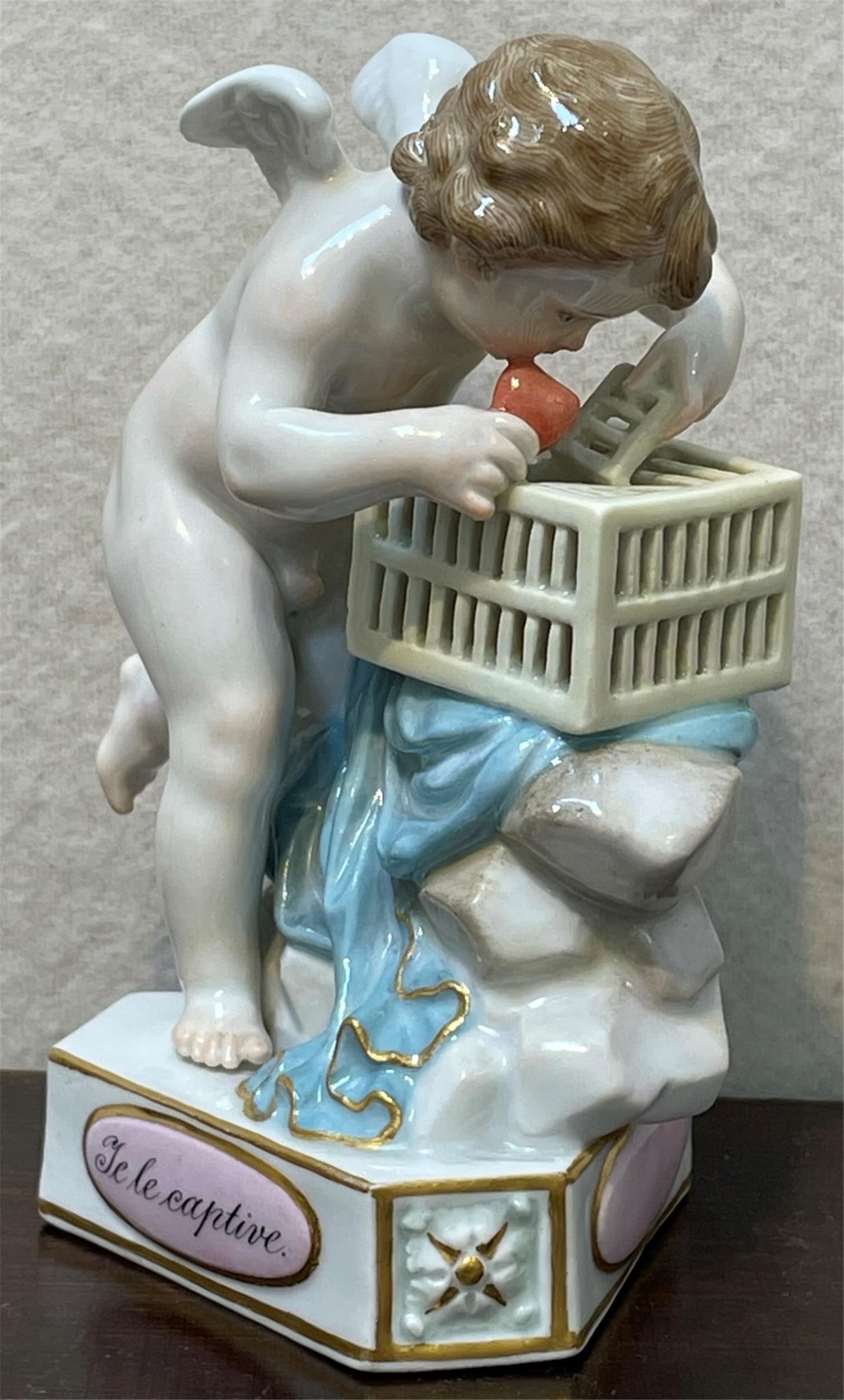 Amor als Herzensfänger, Porzellanfigur, Meissen, um 1860, besonders liebenswürdiges Motiv.