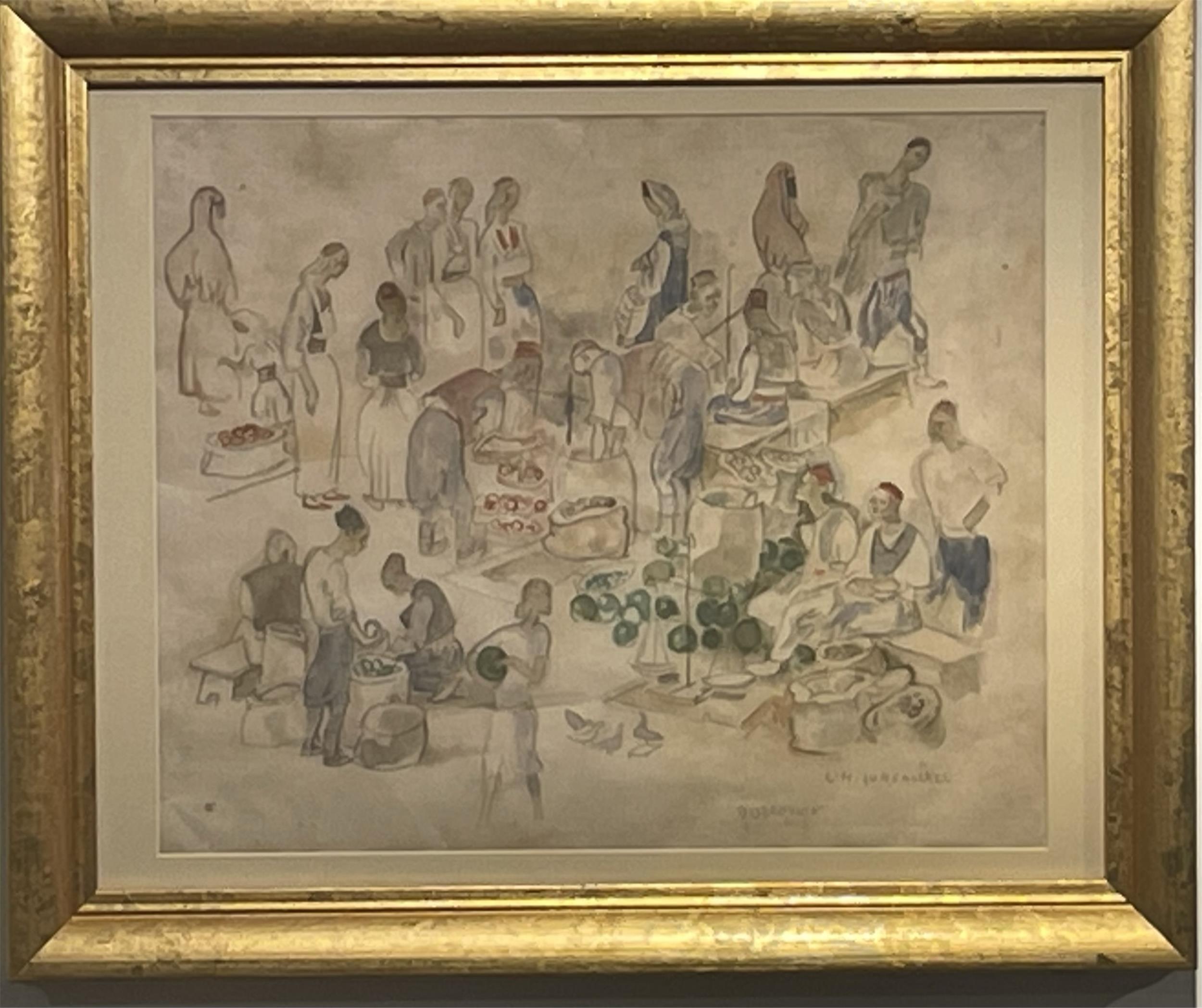 Aquarell über Kohlezeichnung, betitelt „Markt in Dubrovnik“, signiert Ludwig Heinrich Jungnickel (Wunsiedel 1881 - 1965 Wien), datiert 1934, seltenes Motiv, auf einer Dalmatienreise entstand eine kleine Serie mit landestypischen Szenen. Gut neuzeitlich gerahmt.