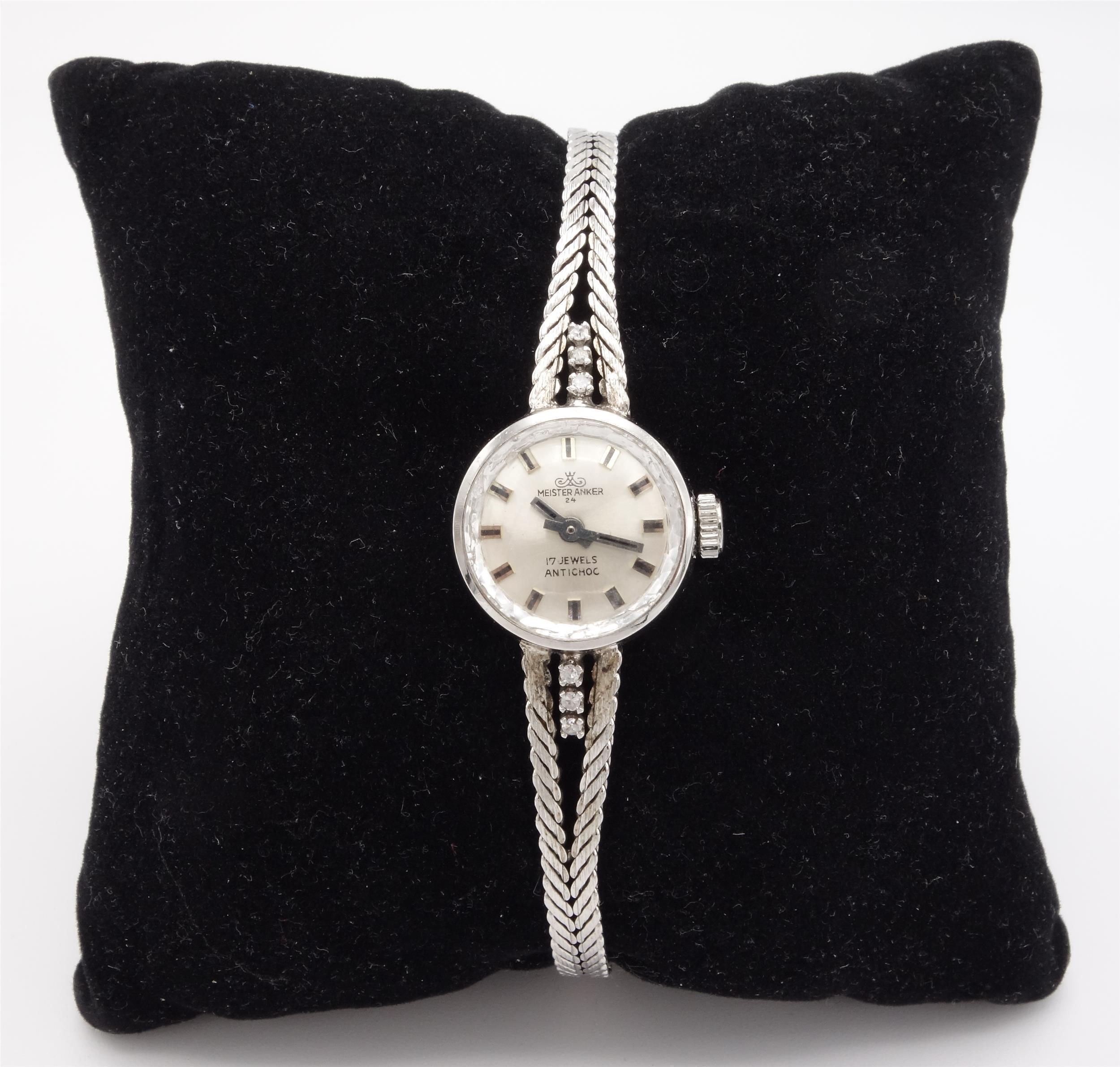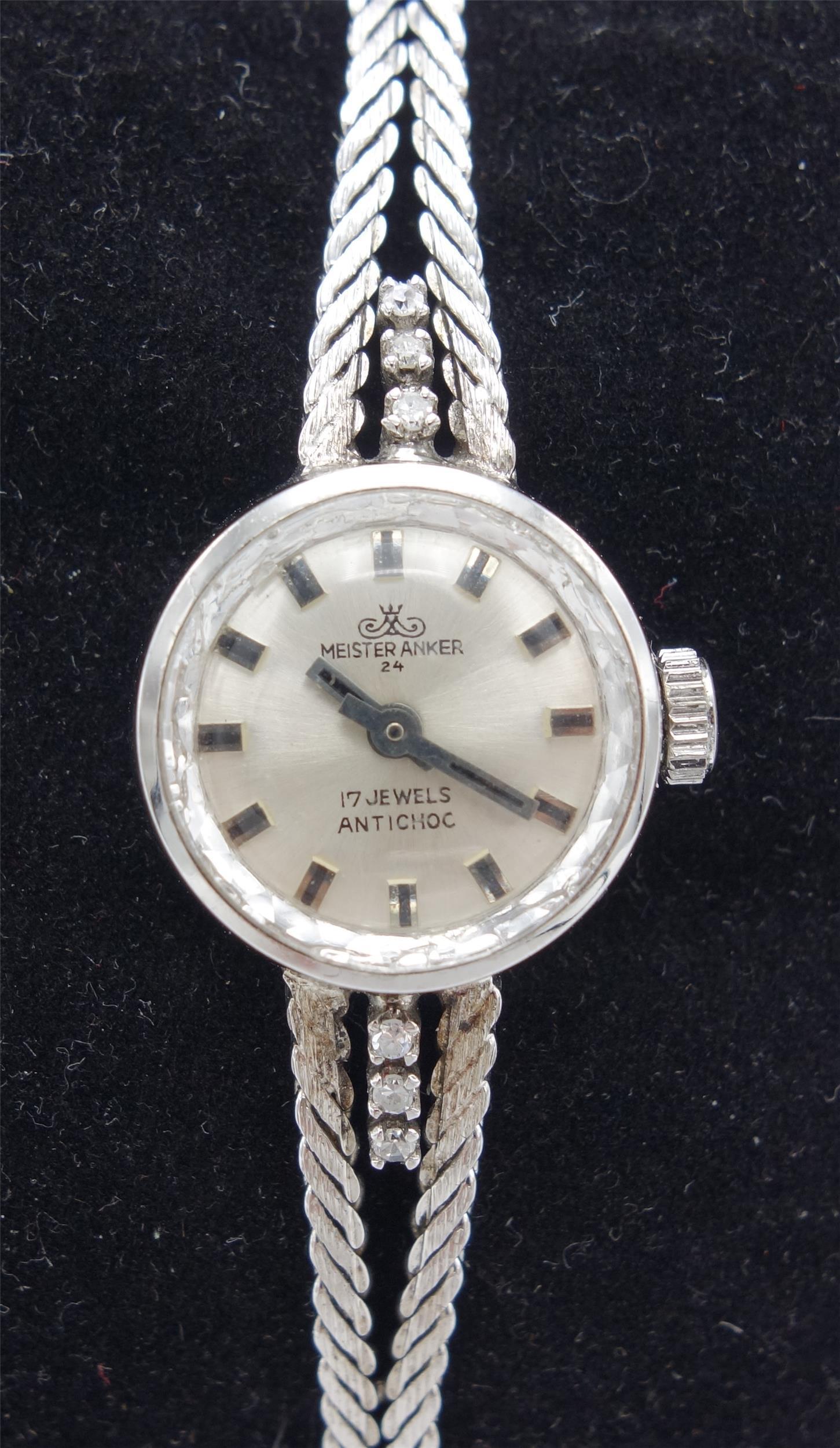 Armbanduhr Weißgold, Diamanten, Meister Anker 24, 17 Jewels, stoßgesichert, funktionsfähig.