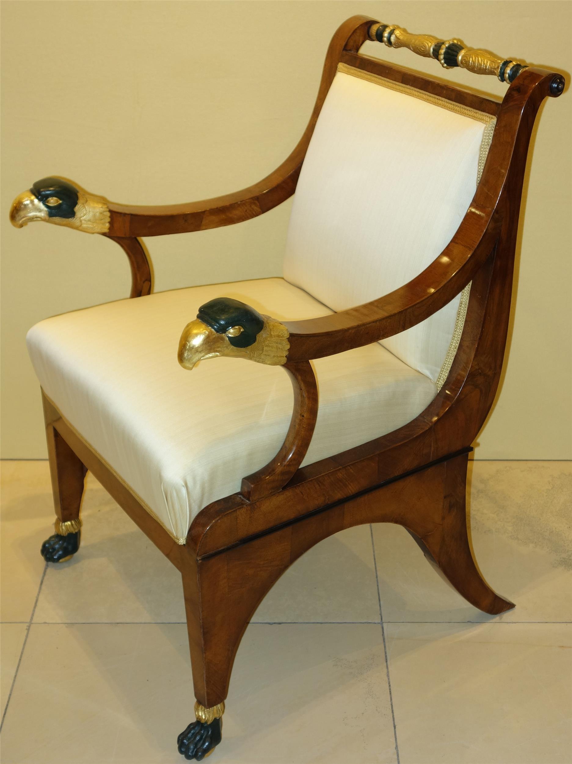 Armlehnstuhl um 1810-20, Empire in seiner Wiener Spielart, Nussbaum auf Nadelholz furniert, farbig gefasst und vergoldet, restauriert, Tapezierung und Bezugsstoff fachgerecht erneuert.