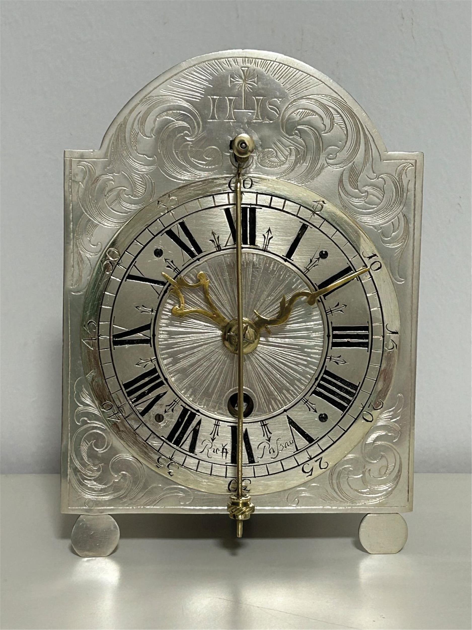 Die Uhr verfügt über eine metallene Frontplatte, vermutlich aus versilbertem Messing oder fein versilbertem Kupferblech (seltener echtes Silberblech, das punziert wäre).
