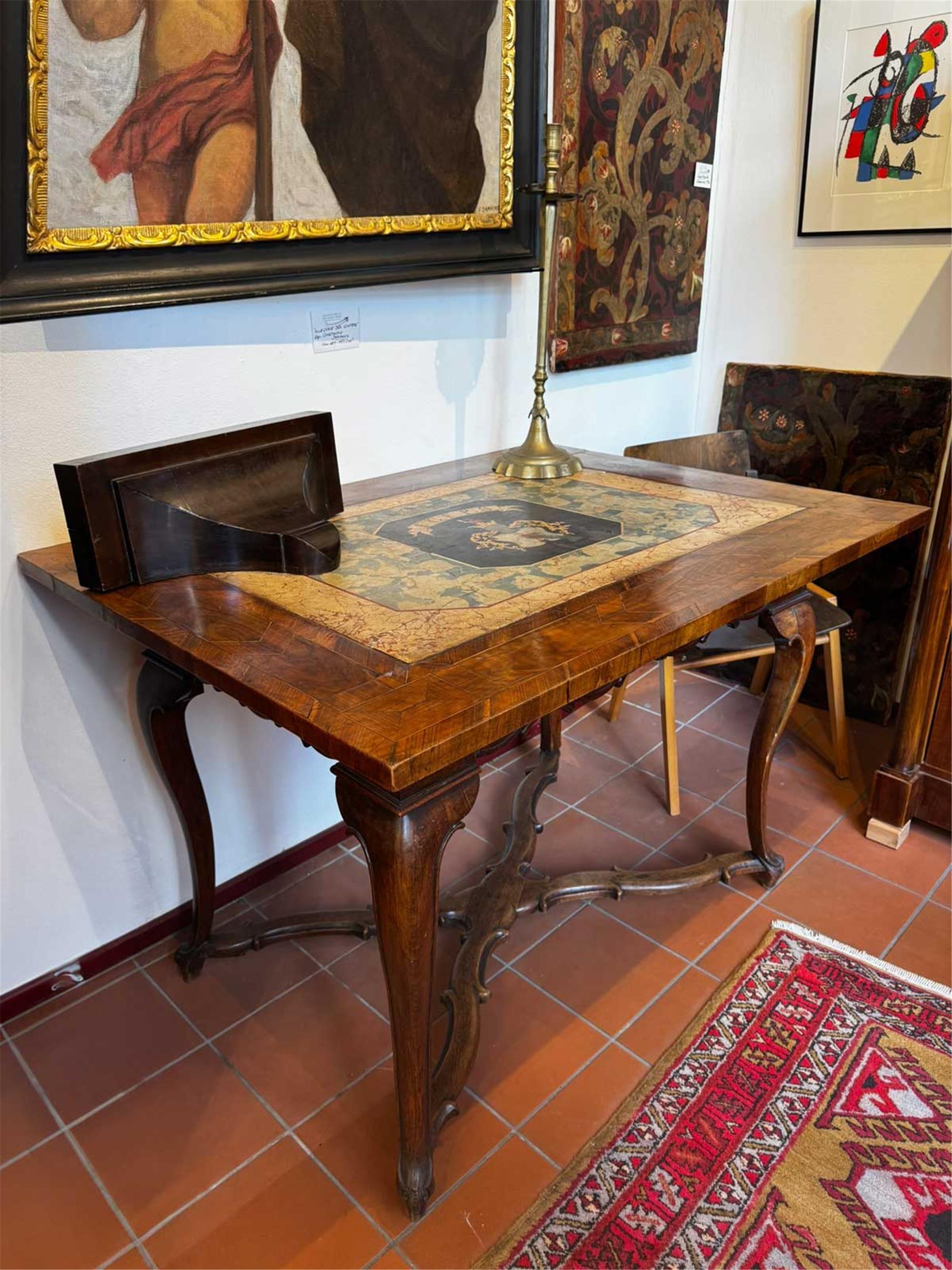 Barocktisch, Nussbaum geschwartet und massiv, originale Platte aus historischem Kunstmarmor, also Scagliolo, Alt Österreich, Mitteldrittel 18. Jahrhundert, unrestaurierter Originalzustand.