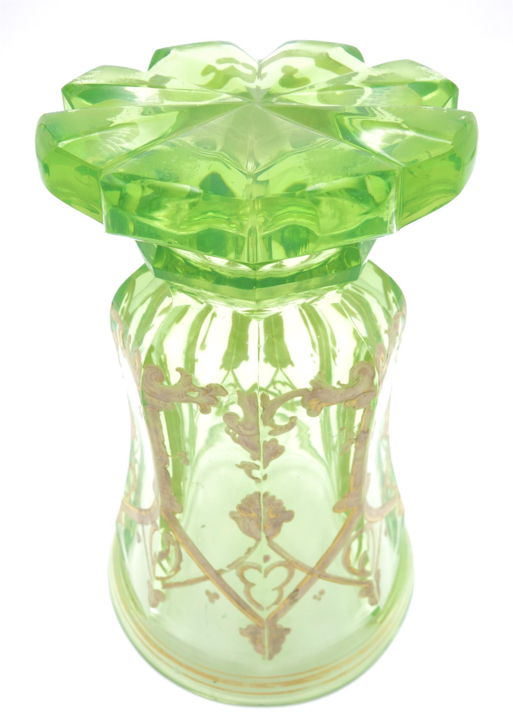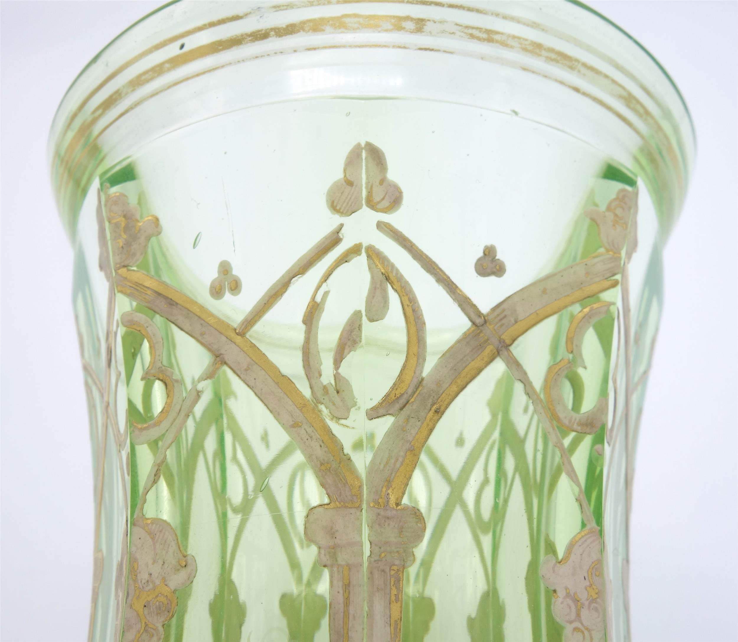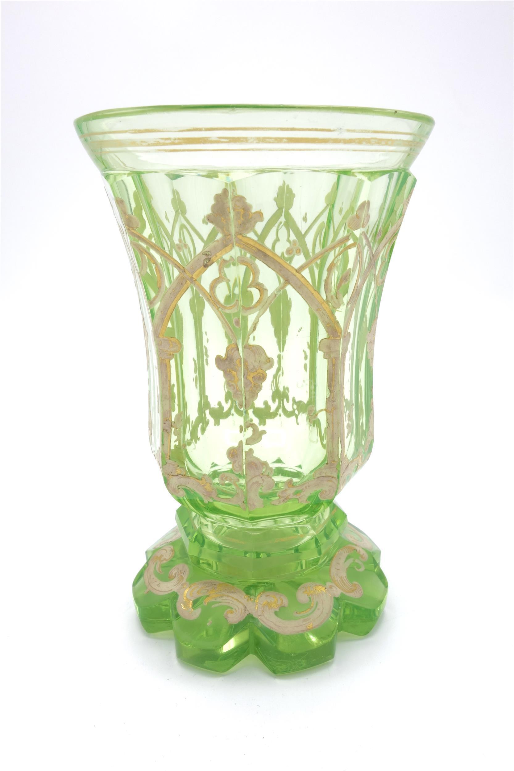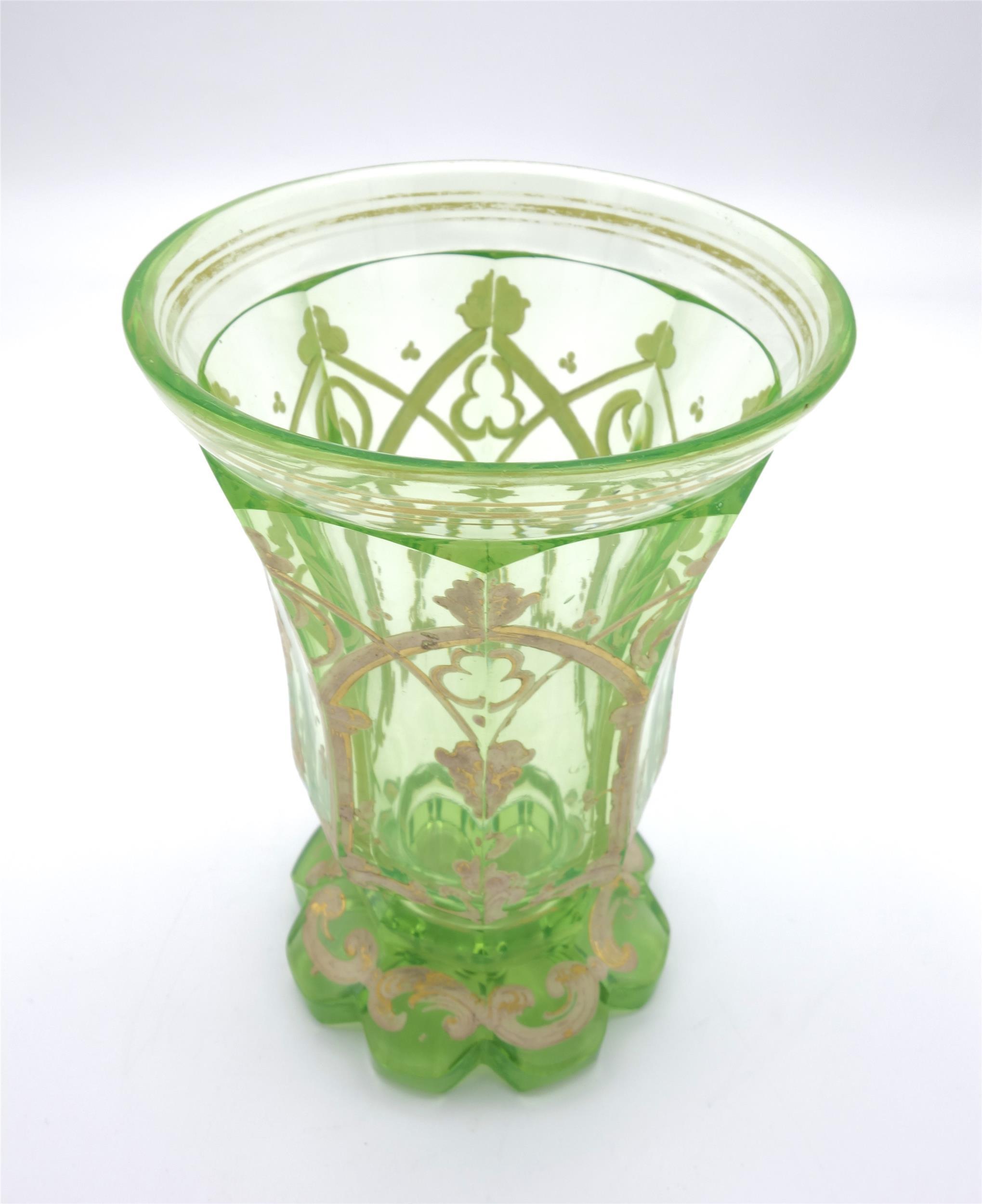 Biedermeierglas, "annagrünes" Glas, florale Bemalung, teils vergoldet, Böhmen 2. Viertel 19. Jahrhundert