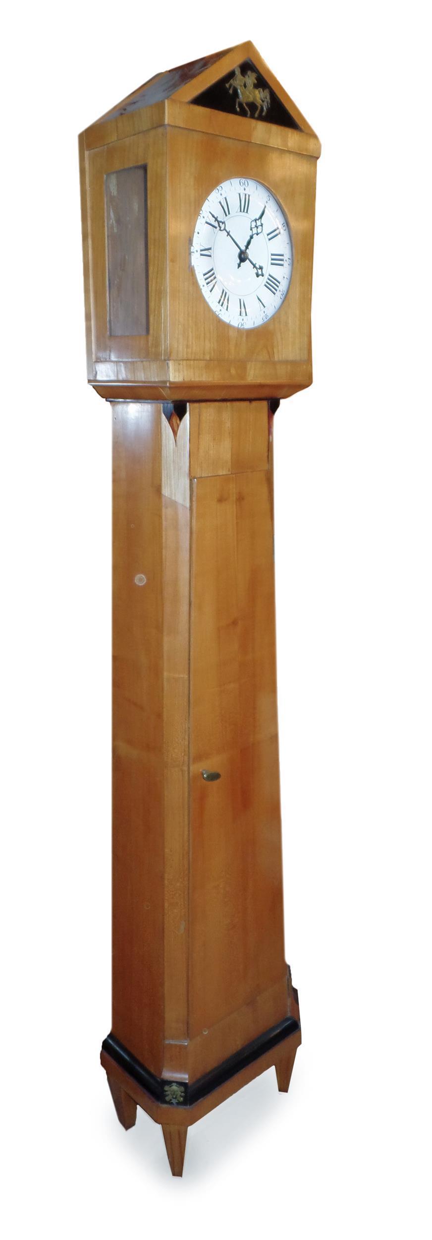 Originaler Kasten einer Bodenstanduhr Biedermeier, Kirschholz, teilweise ebonisiert, süddeutsch 1. Viertel 19. Jahrhundert. Werk fehlt völlig, auch das Ziffernblatt, beides (unsachgemäß) ersetzt durch ein späteres Blatt mit elektrisch betriebener Uhr. Kasten in gutem Zustand.