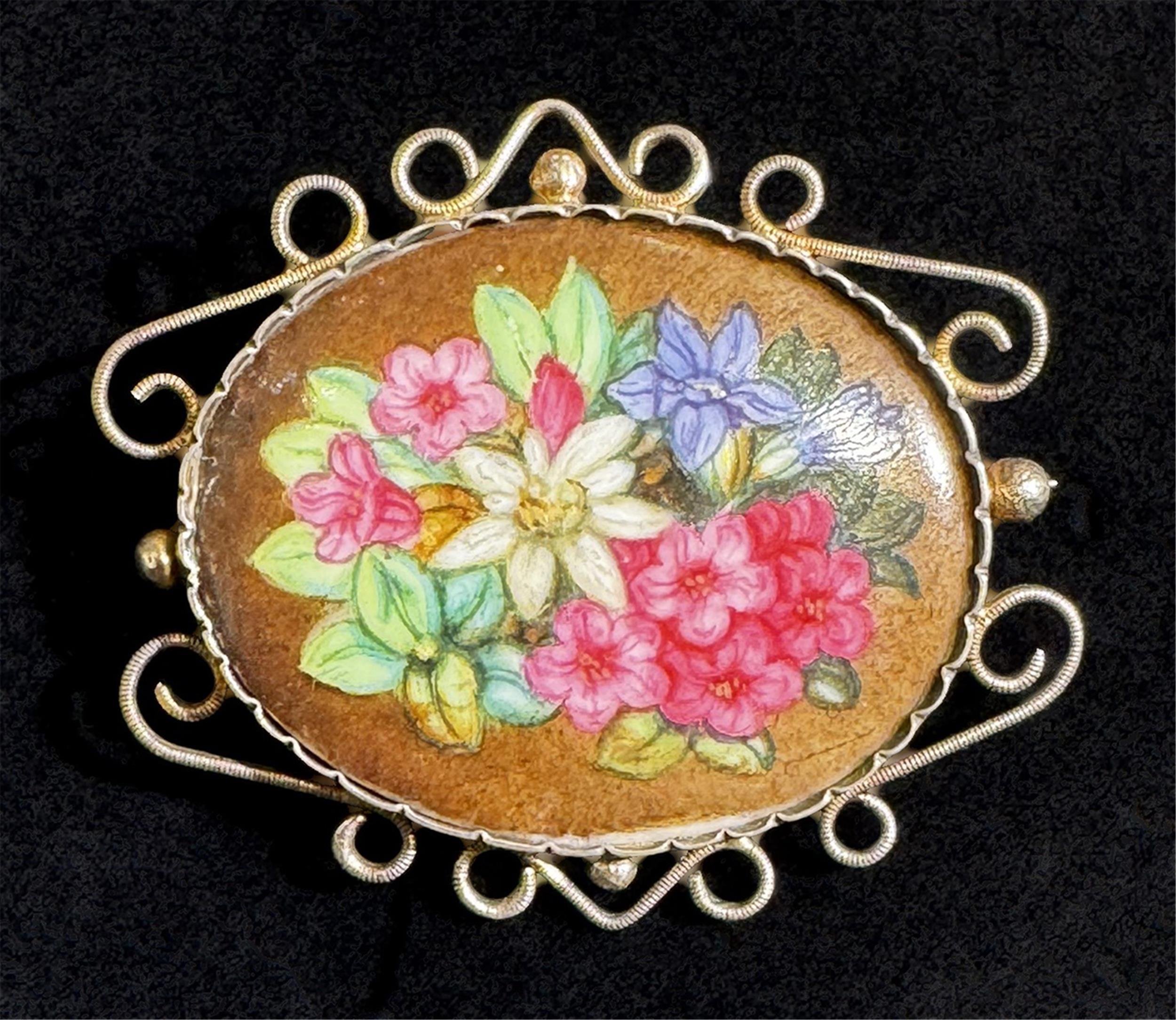 Farbig bemaltes Porzellantäfelchen, Fassung Silber, 1. Hälfte 20. Jahrhundert.