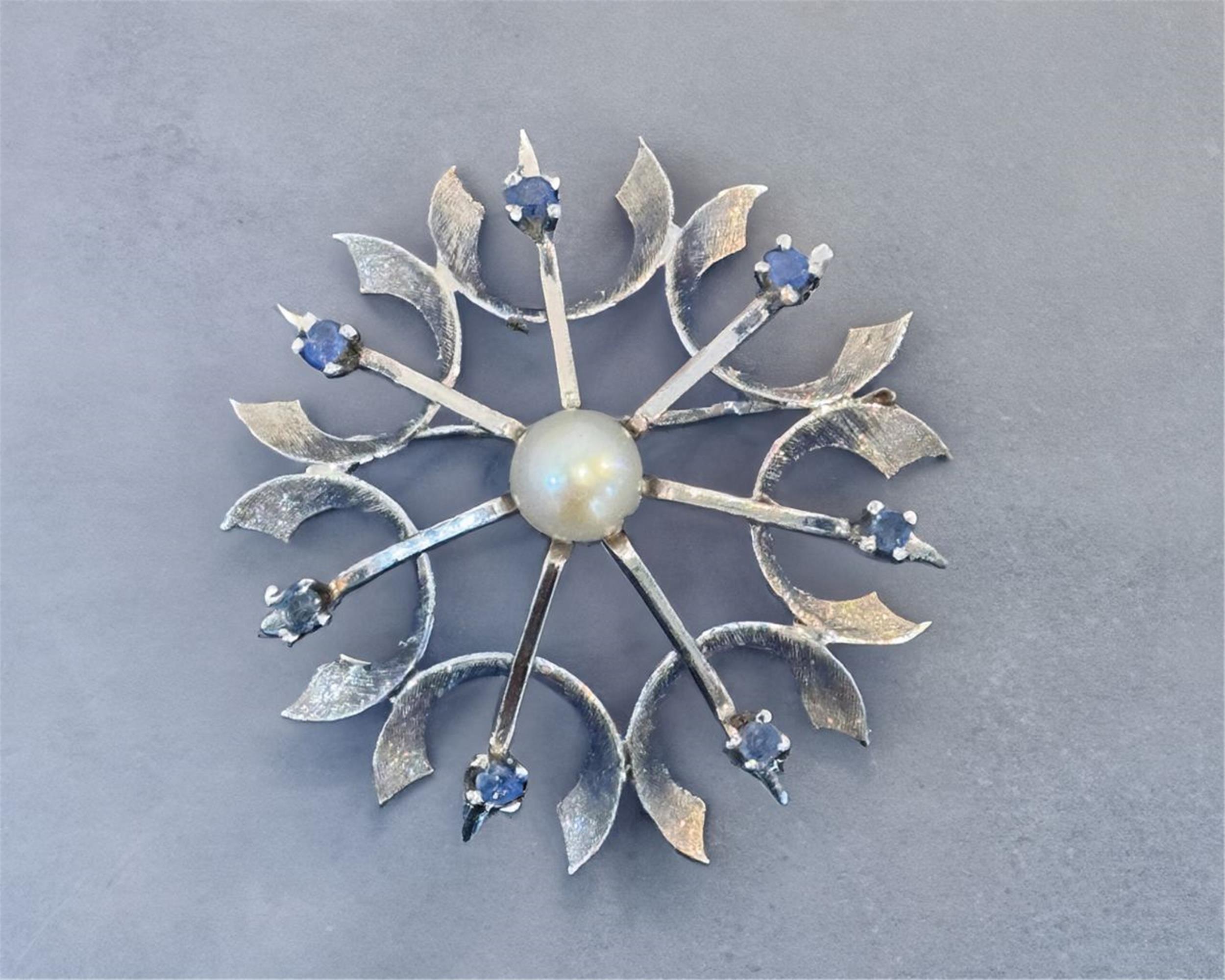 Weißgoldbrosche, 14 Karat, 7 Saphire, Perle, 1970er Jahre