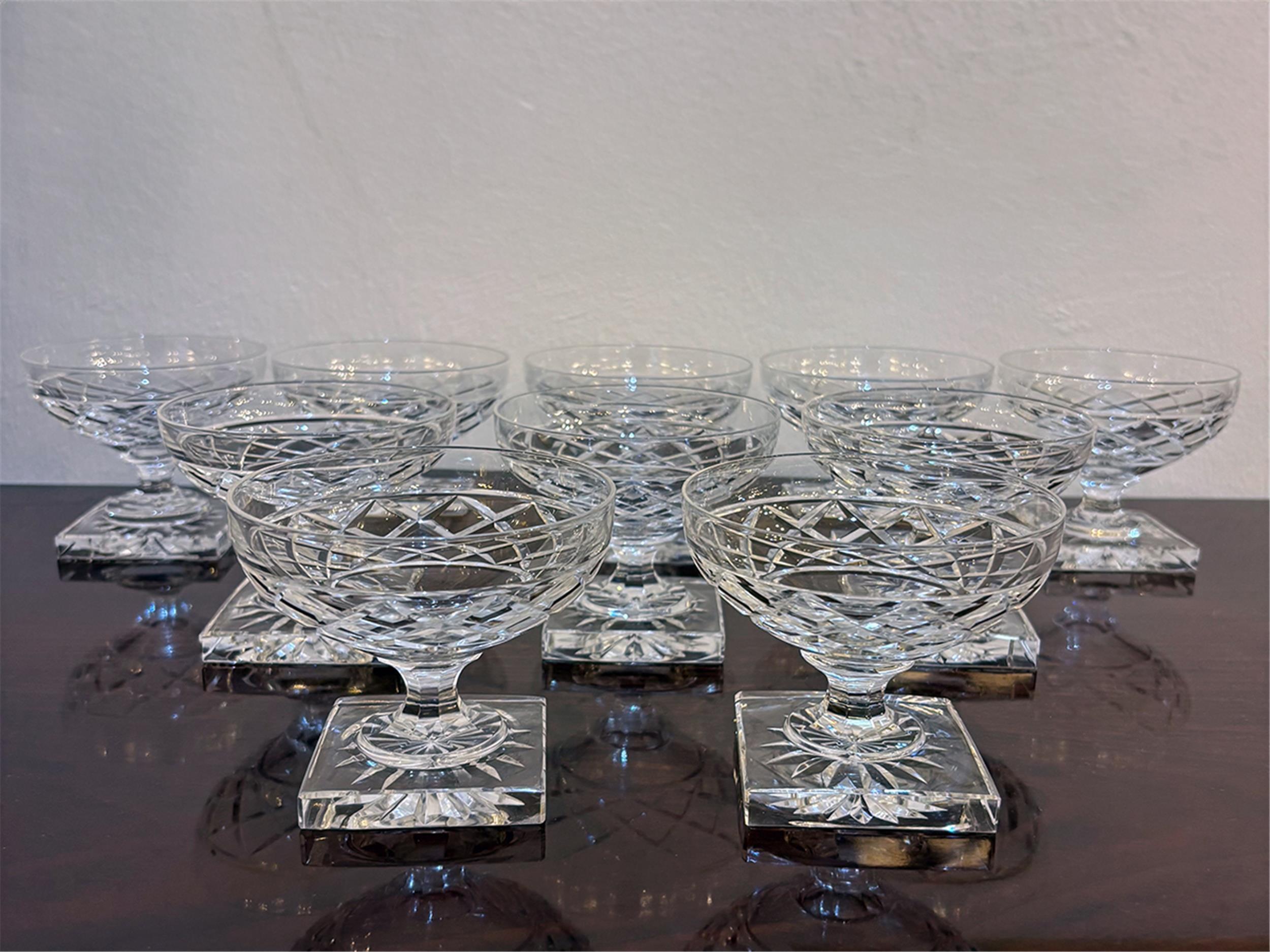 Elegantes Set von zehn reich geschliffenen Champagnerschalen aus der renommierten Kristallmanufaktur Val Saint Lambert: Die weit ausladenden Kelche sitzen auf quadratischen Füßen mit strahlenförmigem Schliff, der das Licht vielfach bricht und der Tafel einen festlichen Glanz verleiht.