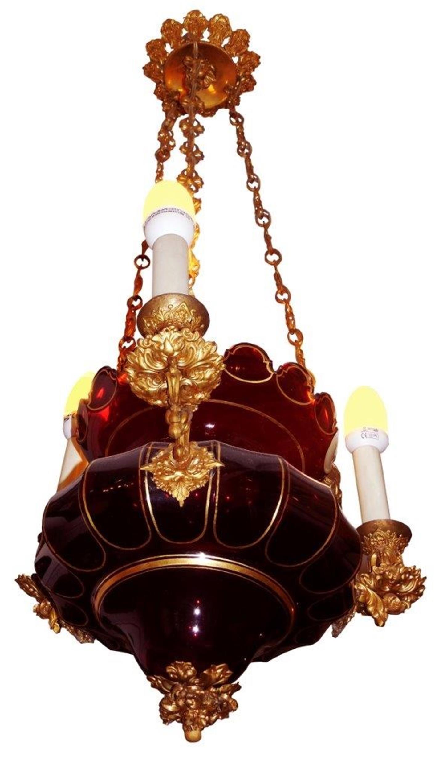Deckenampel, Biedermeier um 1840 - 45, Böhmen, der Harrach'schen Glashütte formal und qualitativ am nächsten, goldbemaltes rubinfärbiges Glas mit originaler Metallmontierung, diese feuervergoldet, elektrifiziert. Museales Objekt in ausgezeichnetem Zustand.