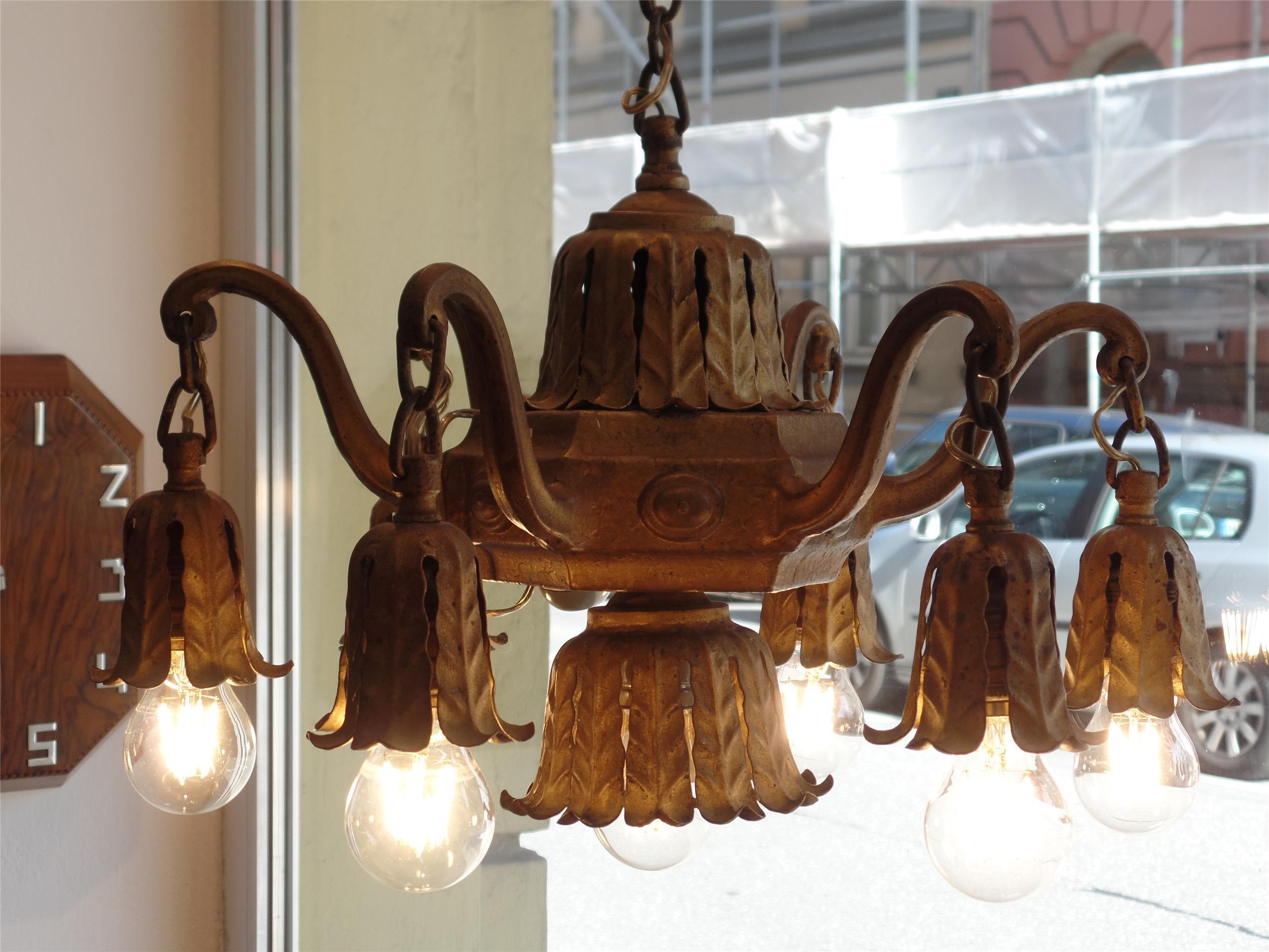 Deckenluster, Metall bronziert, 1 + 6 Leuchten getrennt schaltbar, Art Déco 1920-er Jahre, Preis ab Geschäftslokal, guter Zustand.