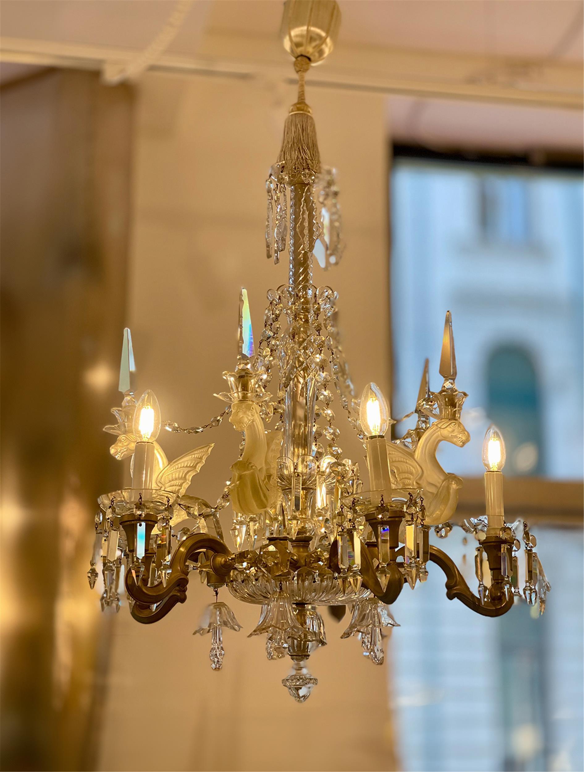 Im Mittelpunkt des Entwurfs stehen die ikonischen Darstellungen des Pegasus, des geflügelten Pferdes, die dem Luster eine mythische und dynamische Note verleihen. Die klaren Glas- und Kristallelemente, ergänzt durch fein mattierte Figuren, erzeugen ein faszinierendes Spiel von Licht und Transparenz.
