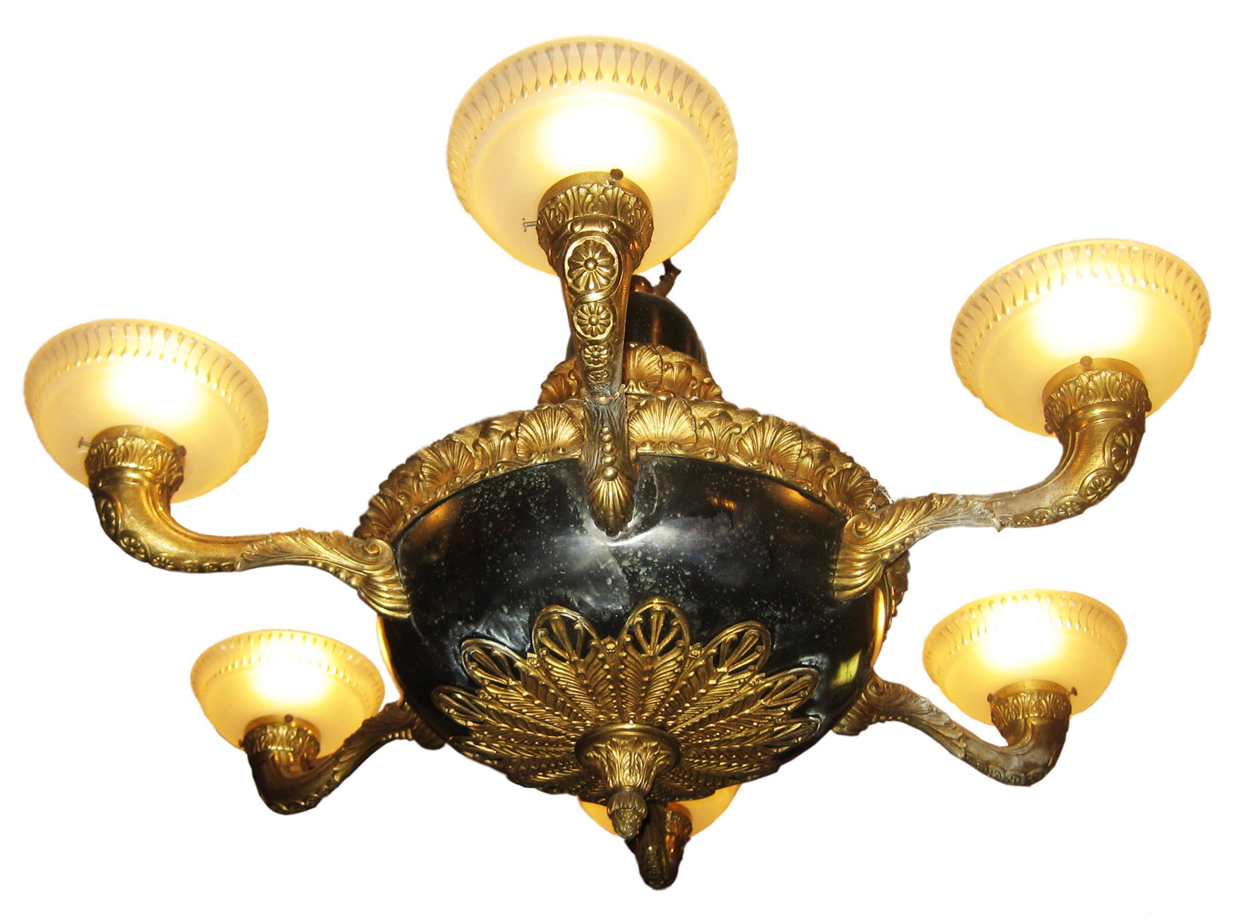 Großer Deckenluster, Wien, 1. Drittel 20. Jahrhundert, Bronze, tw. dunkel patiniert, Glasschalen original, funktionsfähig