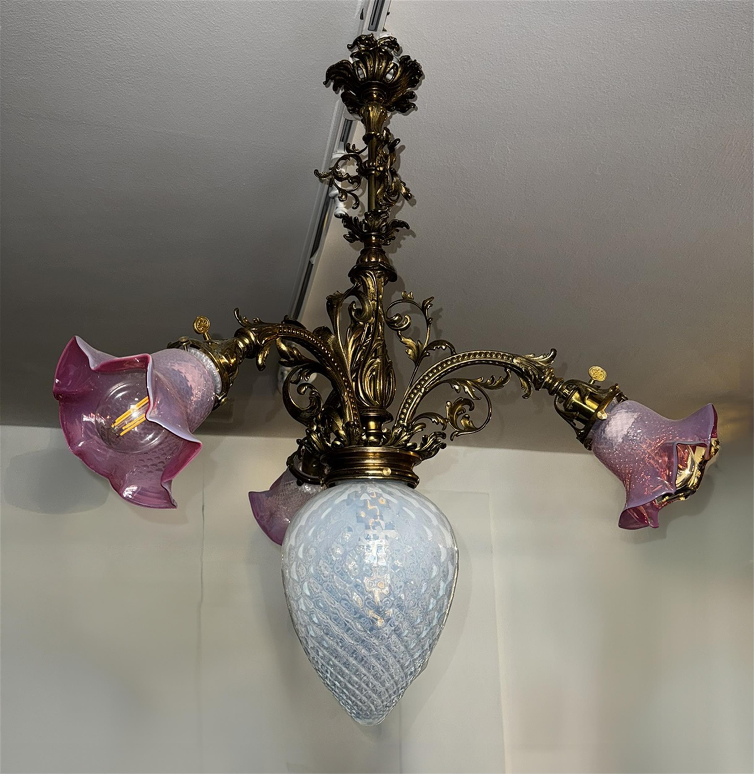 Messingluster mit teils färbigem Opalglas in Blütenform, Wien, um 1900.