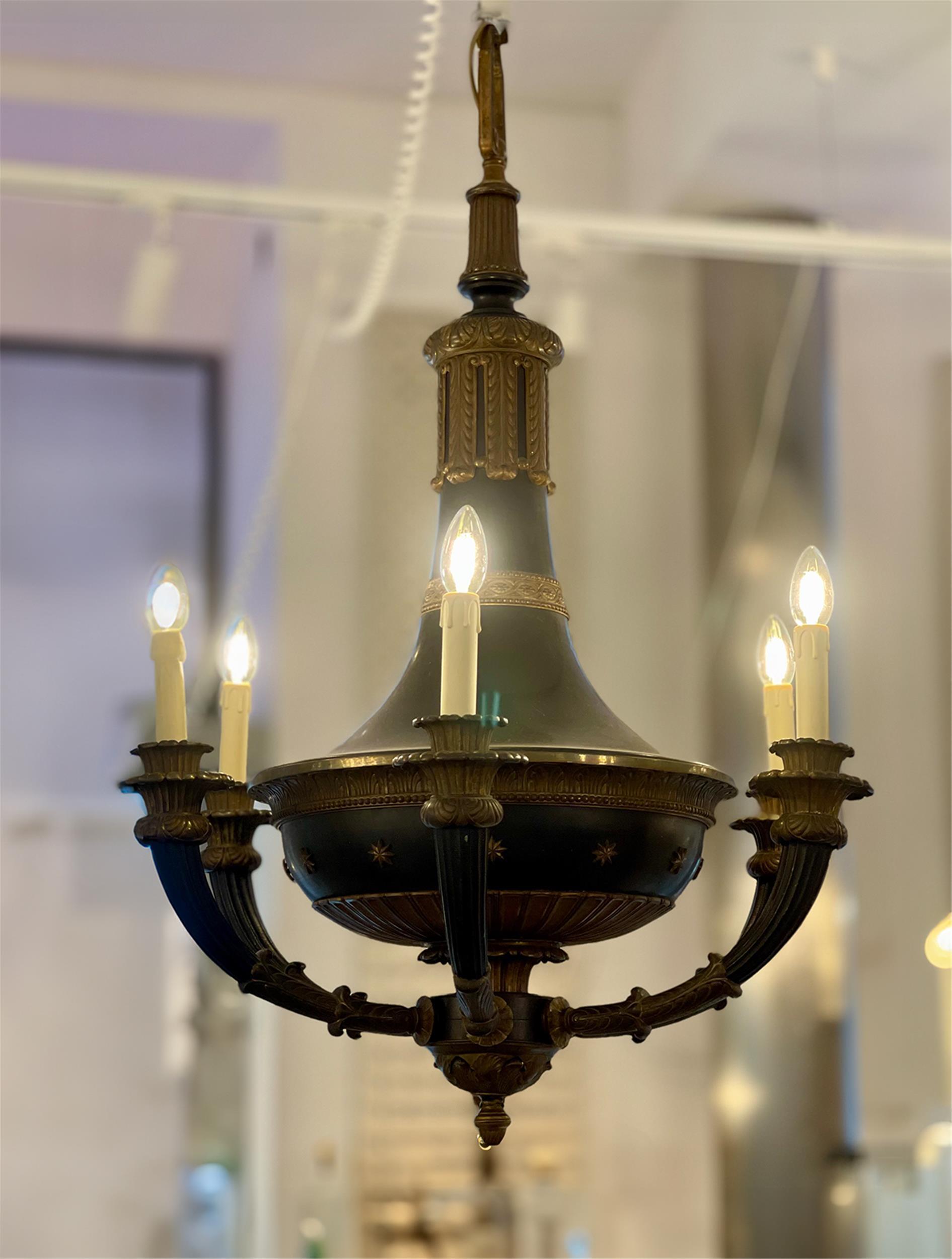 Die Gestaltung folgt der klaren, symmetrischen Formensprache des Empirestils: Eine breite, dunkle Schale wird von elegant geschwungenen Leuchtarmen getragen, die die Lichtquellen im klassischen Kerzenstil präsentieren. Die dunkle Fassung verleiht dem Stück eine würdevolle Tiefe, während die feinen, goldfarbenen Zierelemente für eine edle Lebendigkeit sorgen.