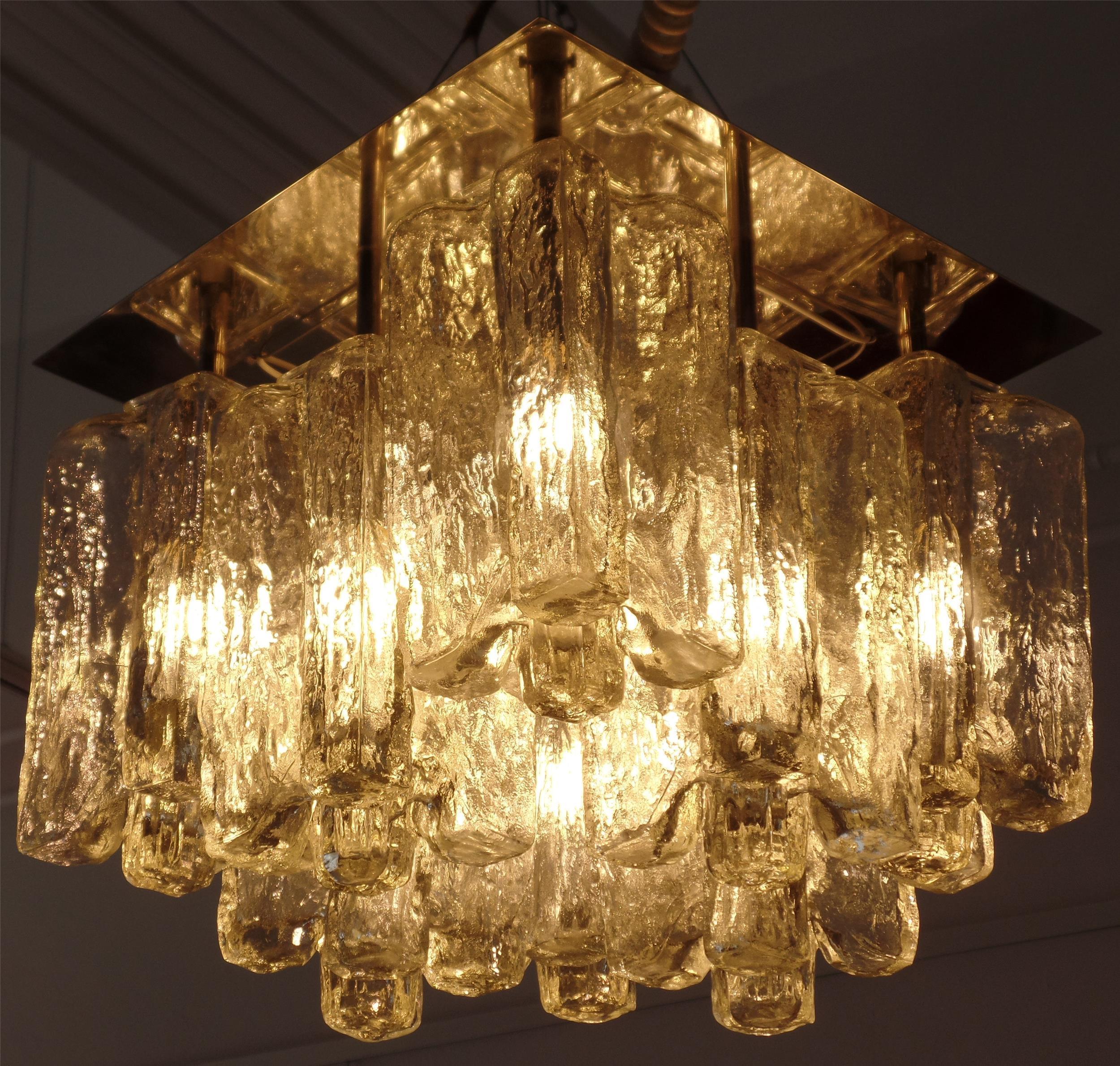 Deckenluster der Firma Kalmar, Modell Granada, Wien 1960-er Jahre, Gläser aus "Eisglas" vollständig und unbeschädigt, sehr guter Zustand.