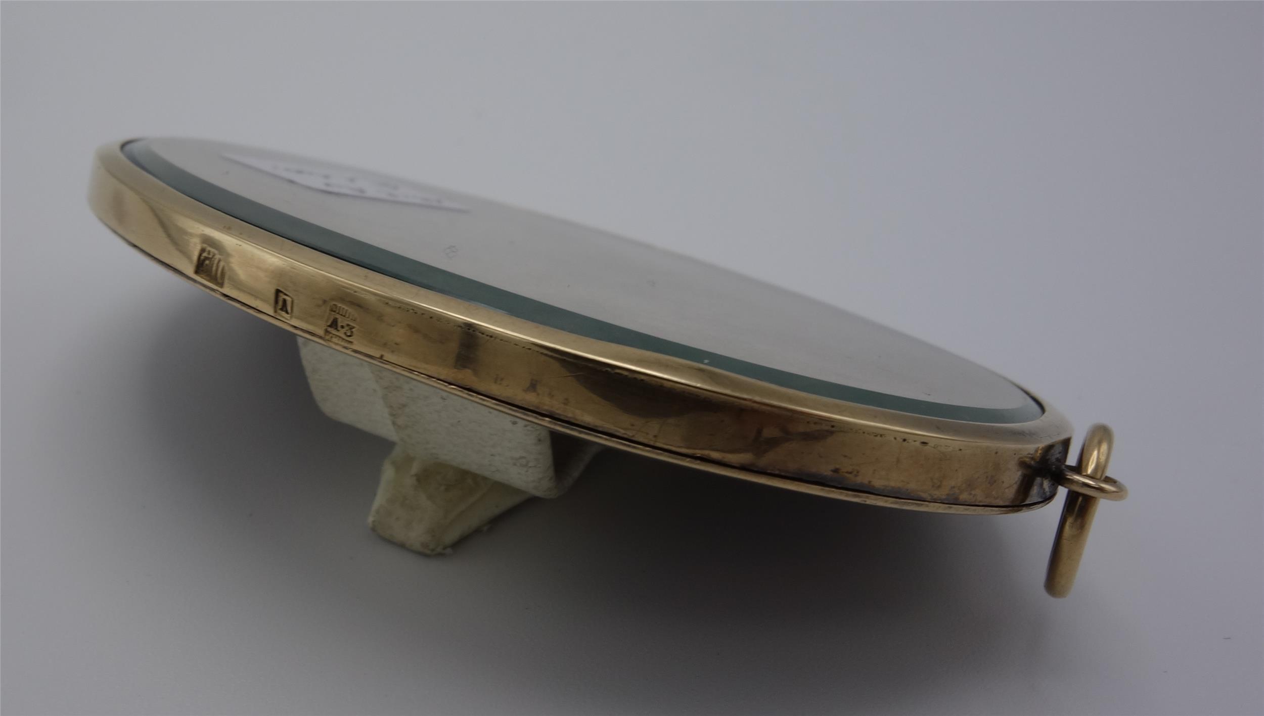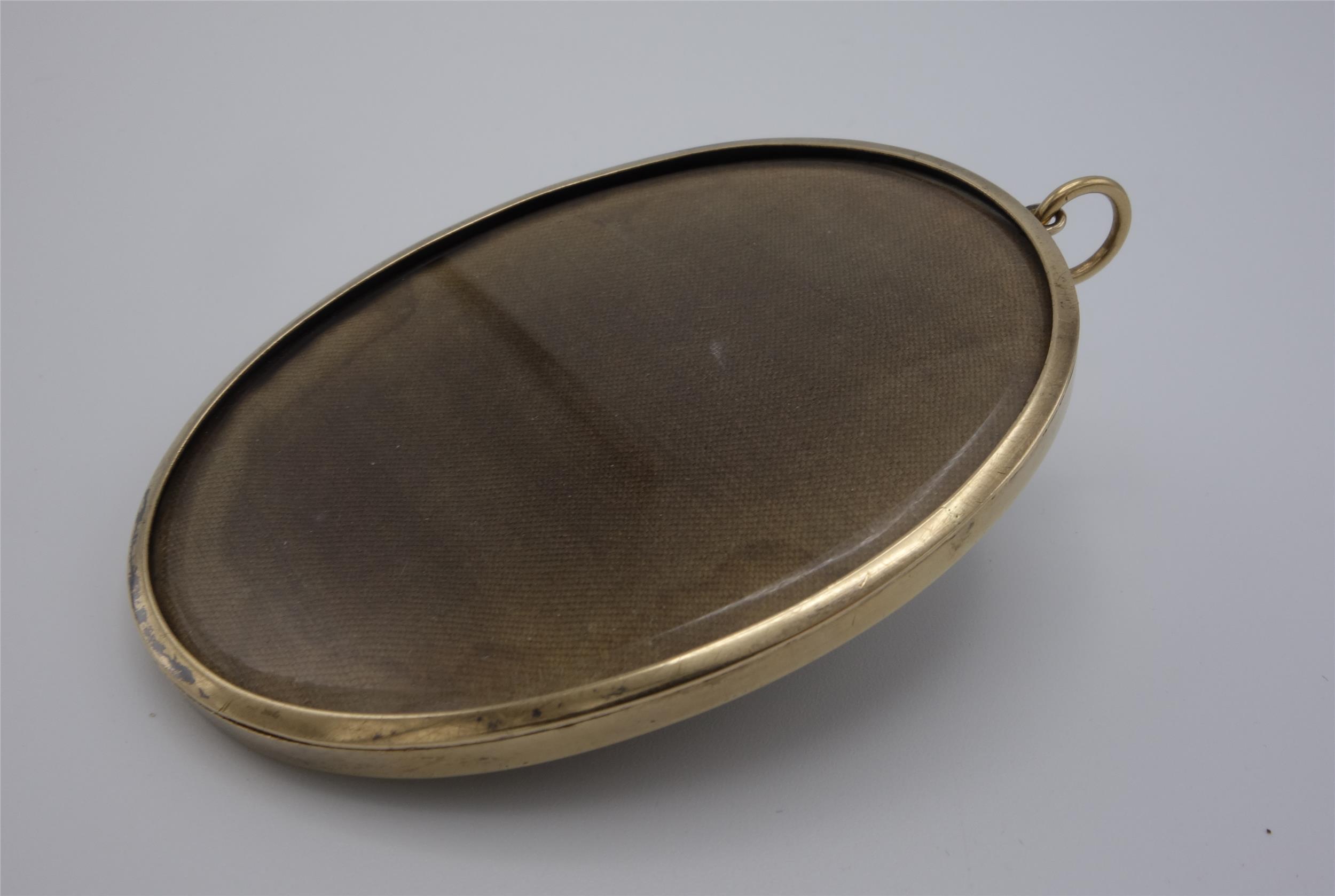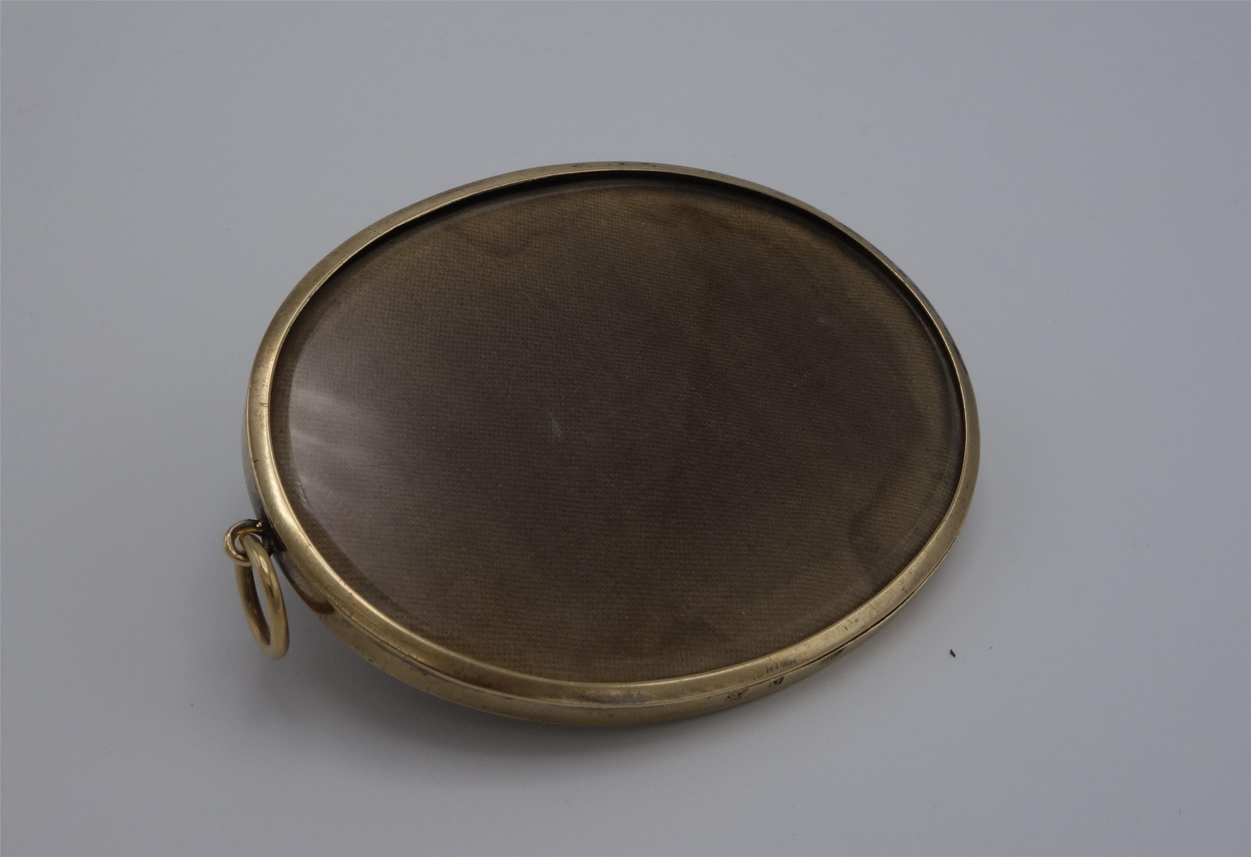 Medaillon in Form eines beidseitig benutzbaren Doppelrahmens, mit Öse als Anhänger für eine Halskette verwendbar, Rahmen aus 18ct Gold, mit Facette geschliffenes Originalglas, auch für Miniaturen geeignet.