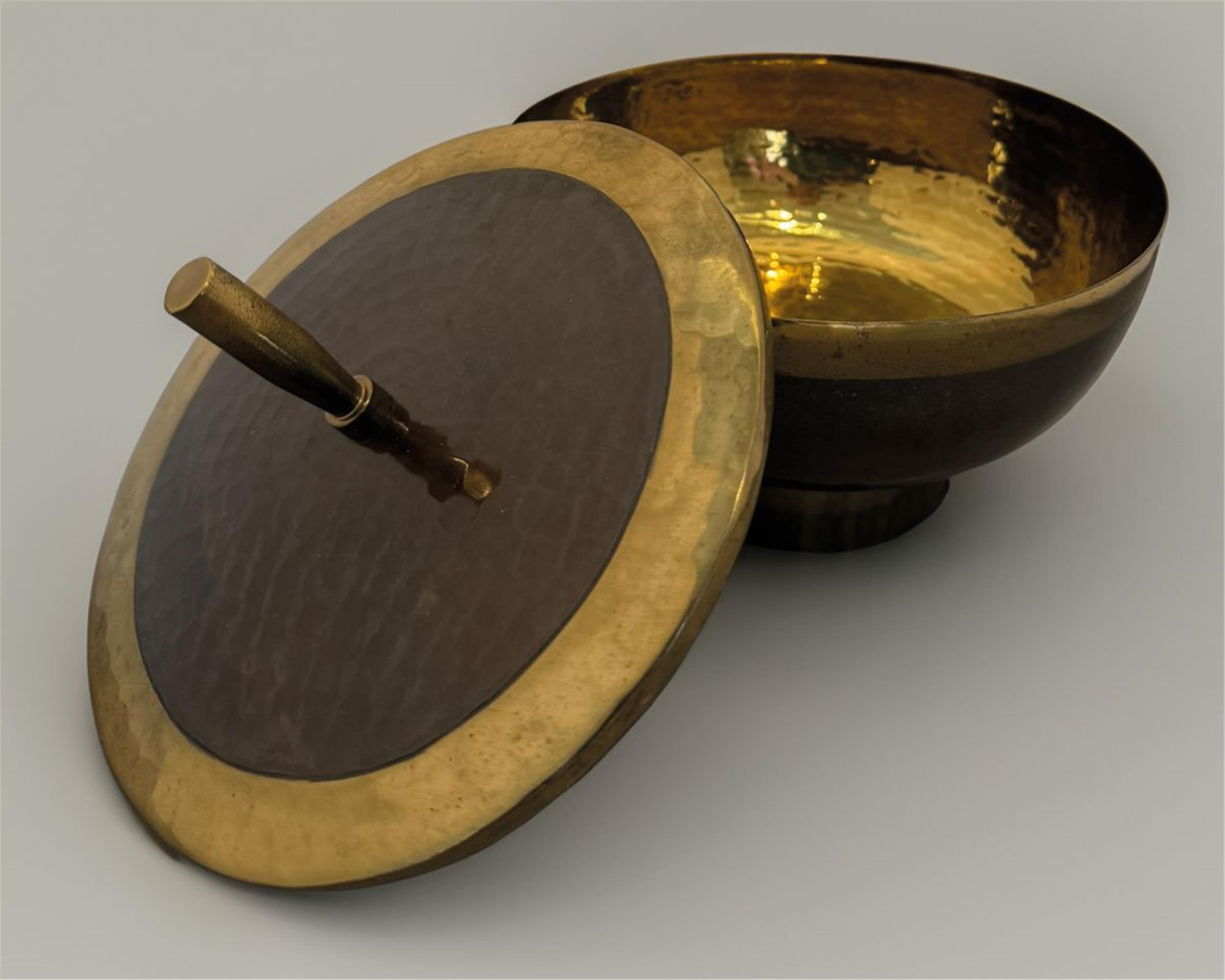 Deckeldose aus Messing und Kupfer, teils martelliert, monogrammiert HP, Hans Przyrembel, Leipzig, um 1930