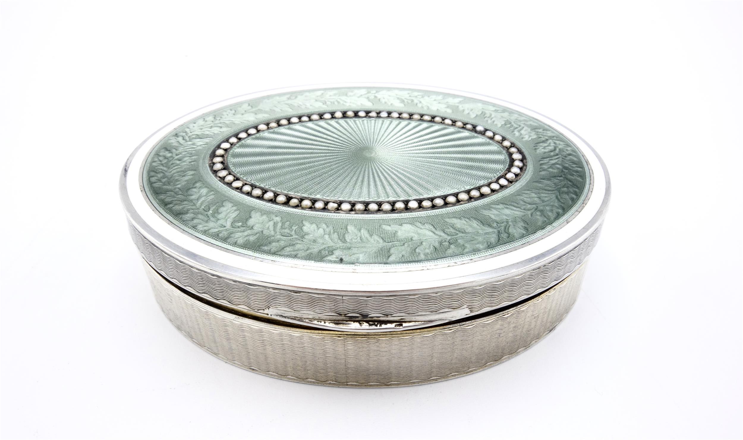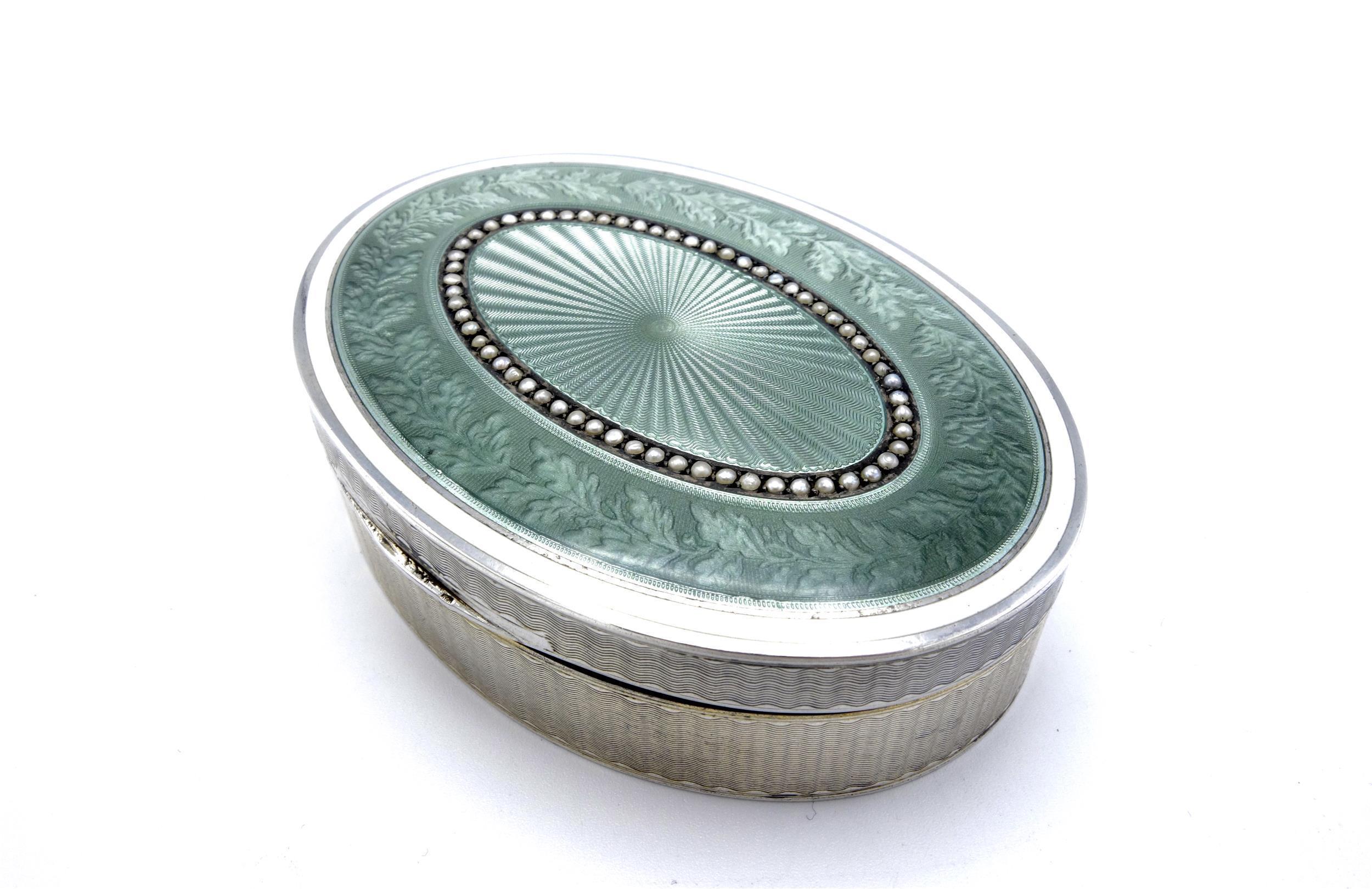 Emaillierte Silberdose mit Naturperlen, innen vergoldet, guillochiert, Frankreich Anfang 20.Jh., Österreichische Einfuhrpunze 1902-22, sehr gute Erhaltung.
