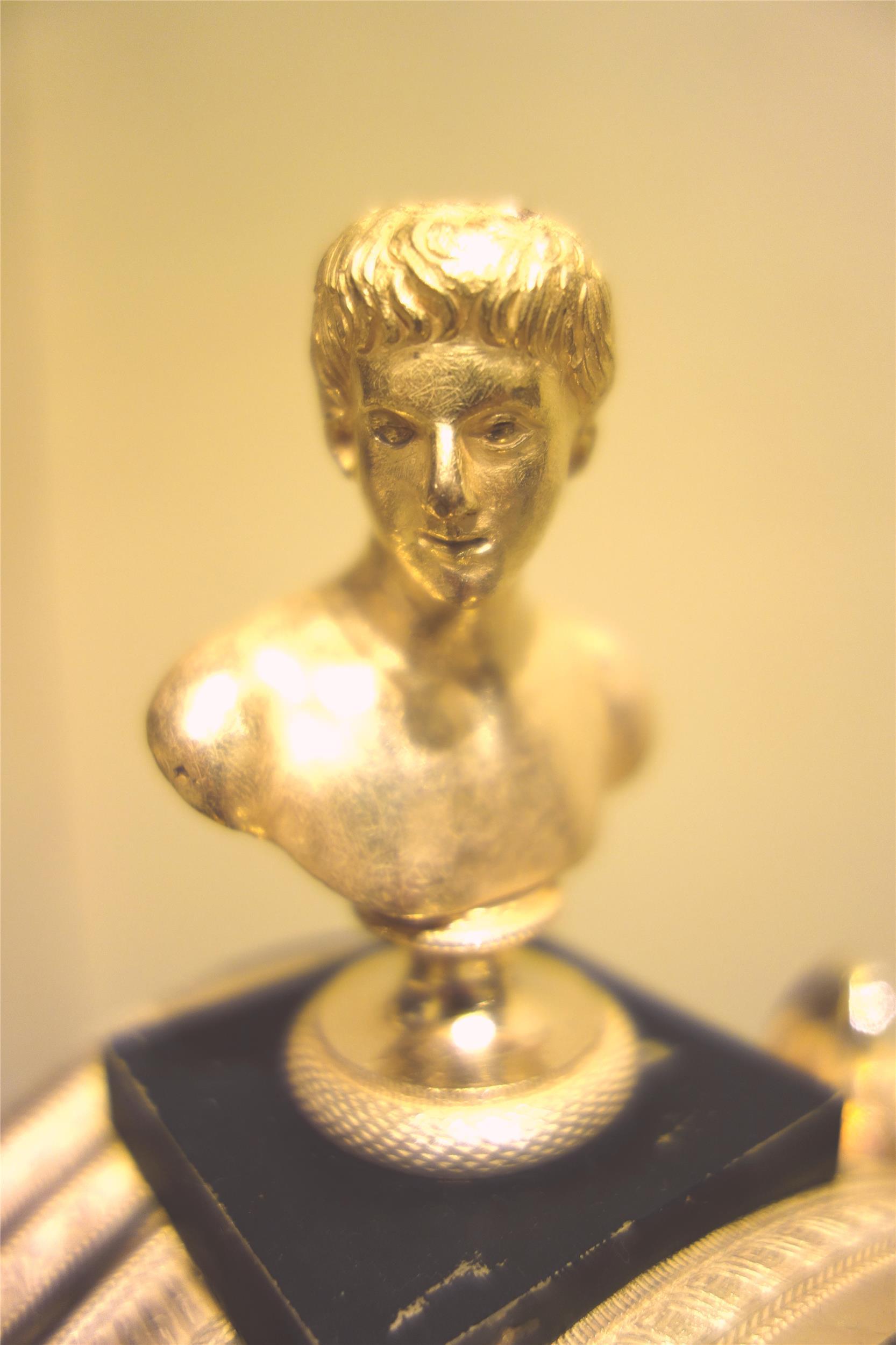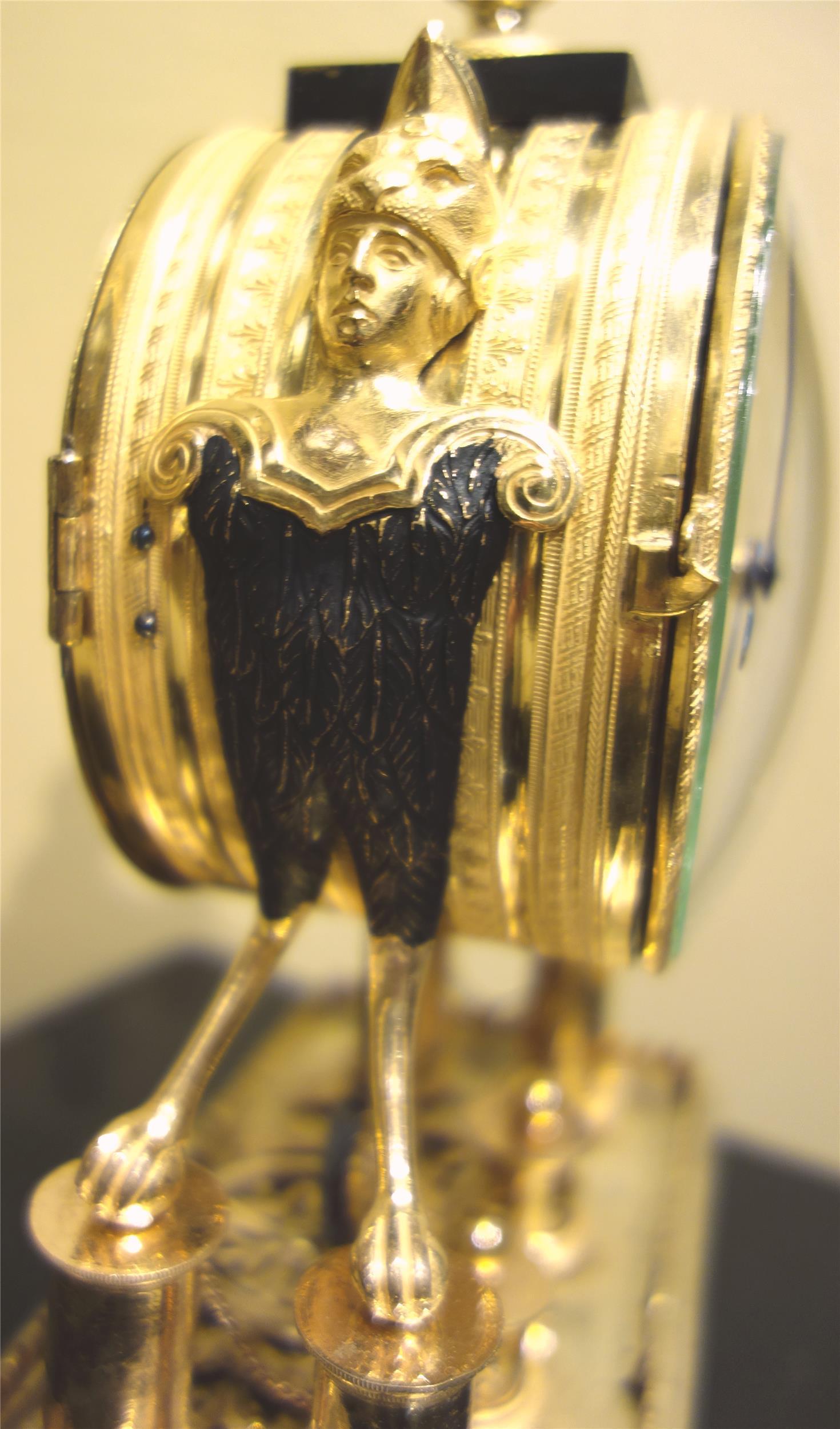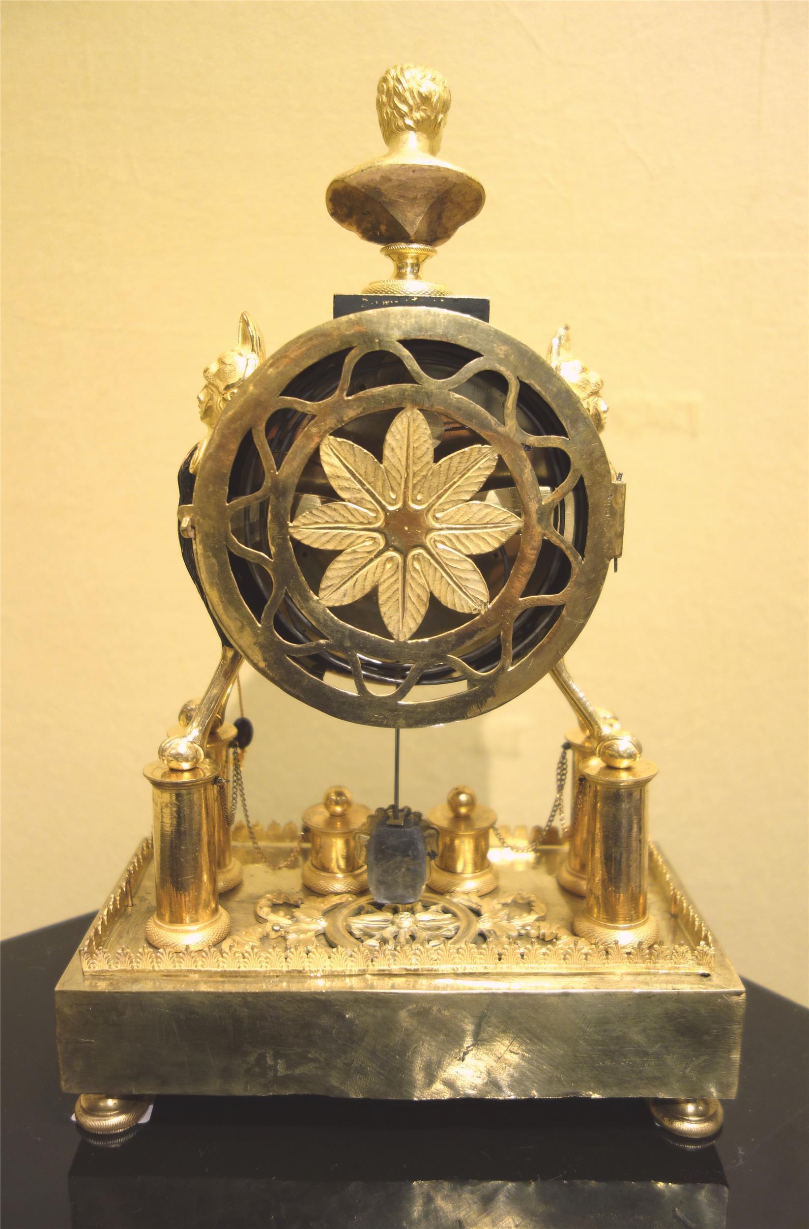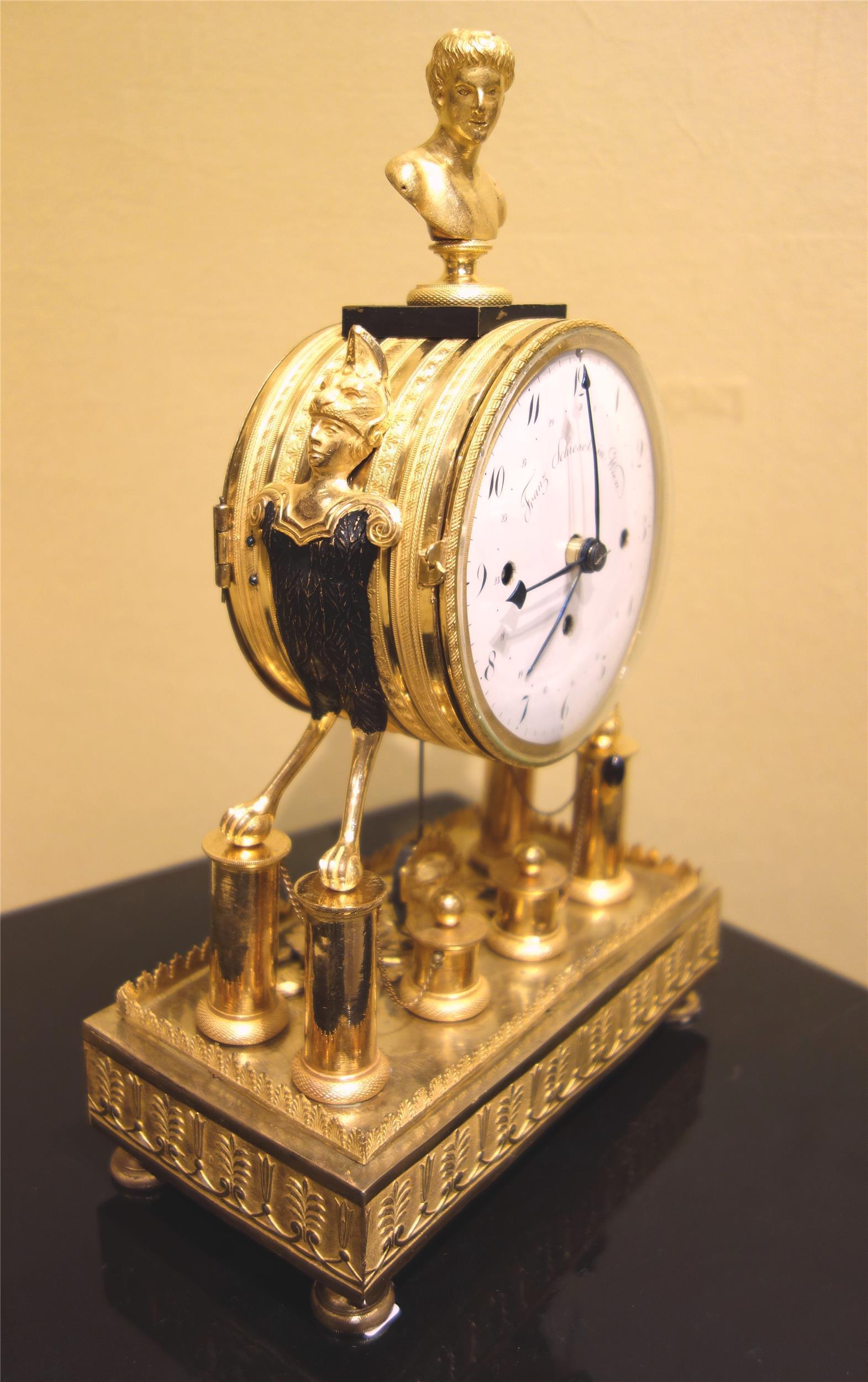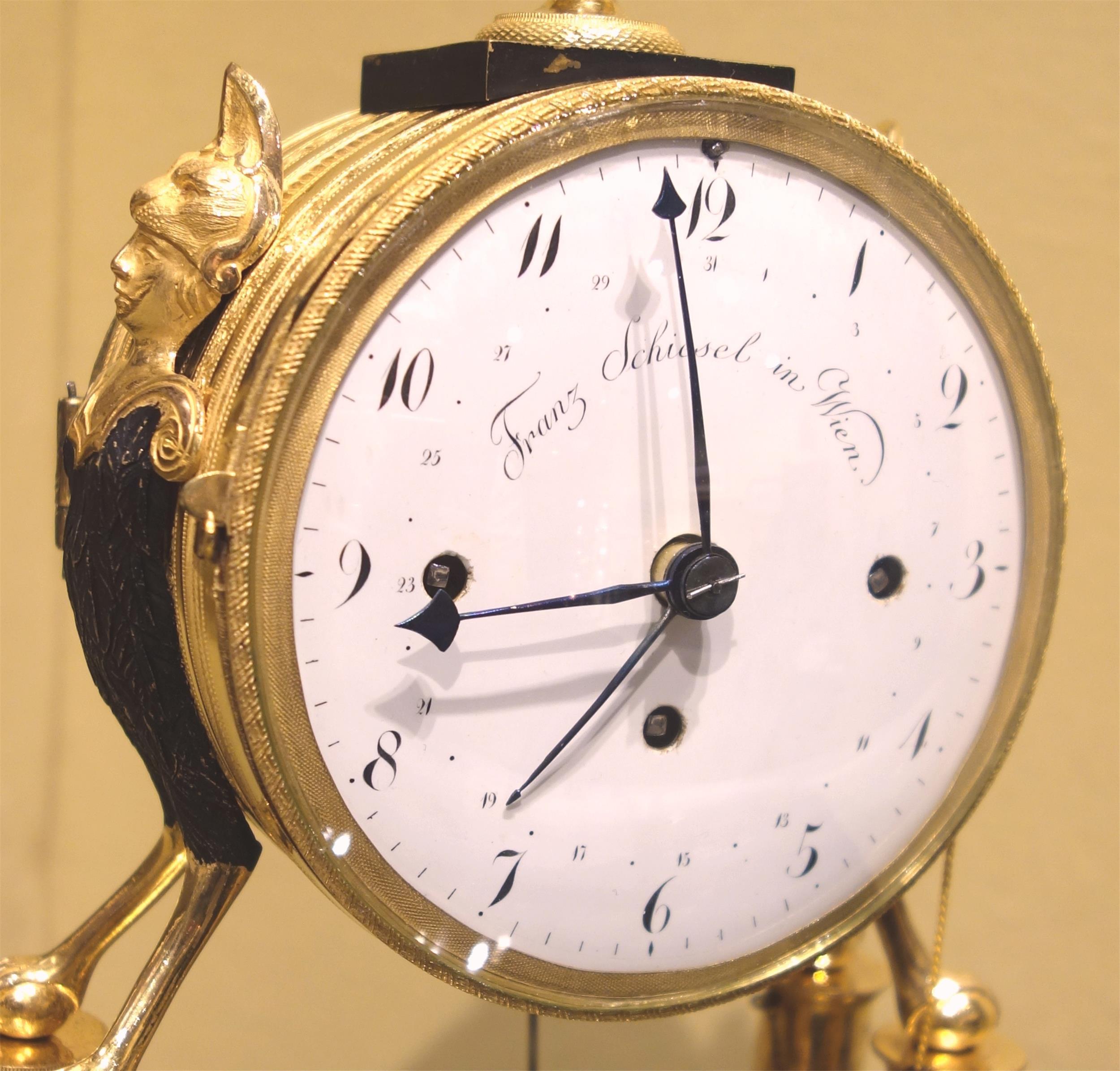Kleine, elegante Empireuhr, signiert Franz Schiesel (Meister 1820-50), 4/4-Schlag, Ruf, Datum, 1 Tag Gangdauer, Bronze feuervergoldet und dunkel patiniert, Wien um 1825, funktionsfähig.