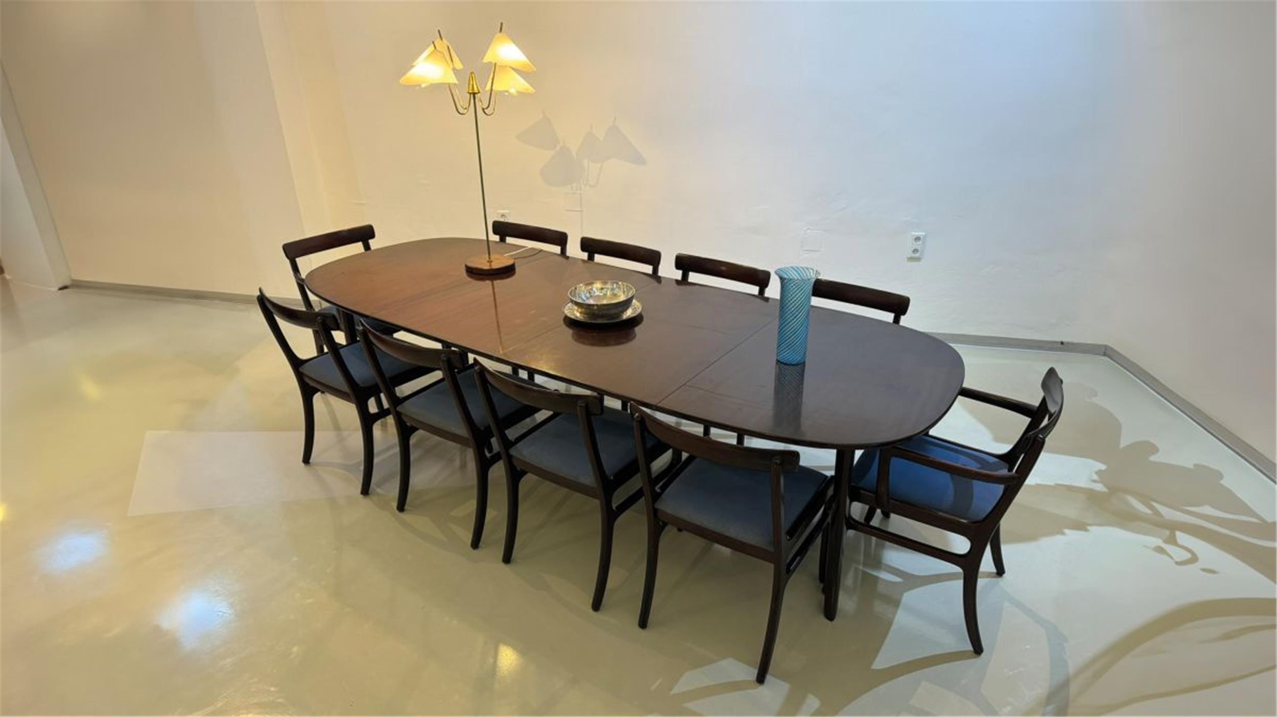 Speise- oder Besprechungsgarnitur, Modell Rungstedlund, Entwurf Ole Wanscher, Ausführung in Mahagoni von Poul Jeppesen, elfteilig, 1950-er Jahre