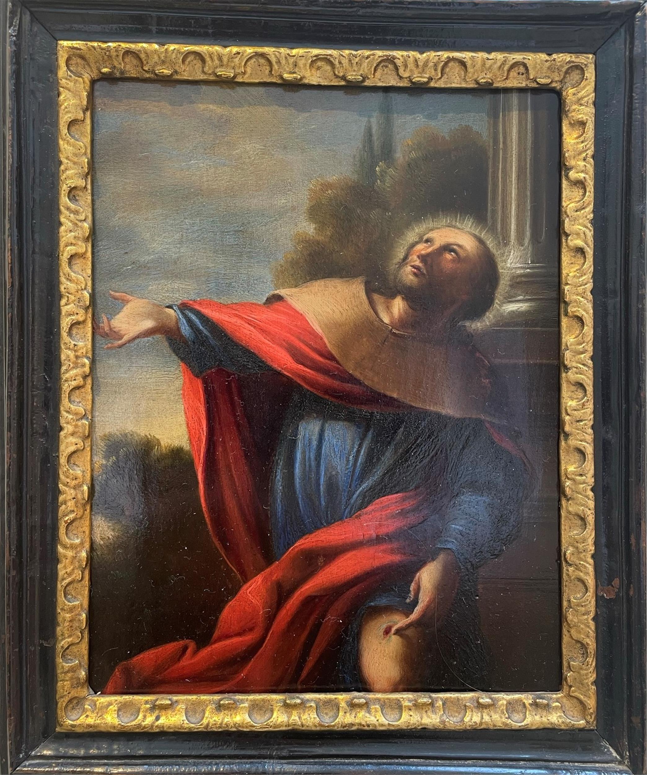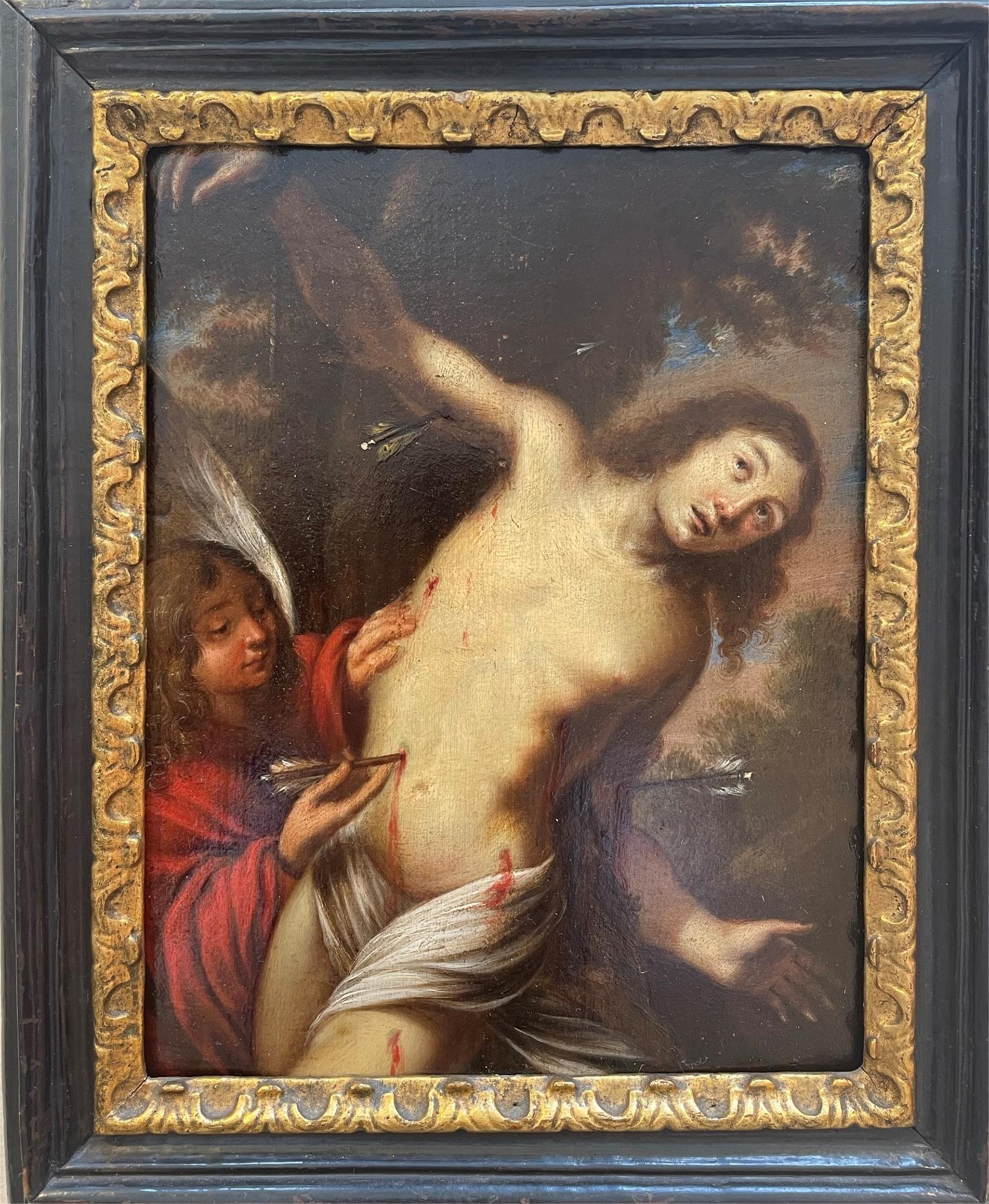 Kleinformatiges Gemäldepaar, die Heiligen Sebastian und Rochus darstellend, Öl auf Holztafel, Philipp Haller (Innsbruck 1698 - 1772), nur ca. 22,5 x 17,5 cm, vermutlich für die private Andacht in außergewöhnlich feiner Qualität gemalt.