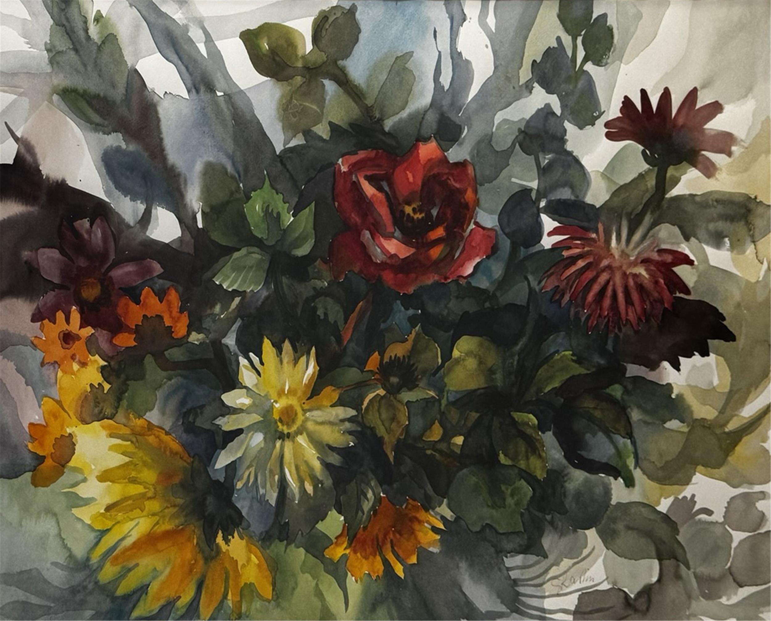 Aquarell auf Papier, prächtiger Blumenstrauß, undeutlich signiert, 2. Hälfte 20. Jahrhundert.