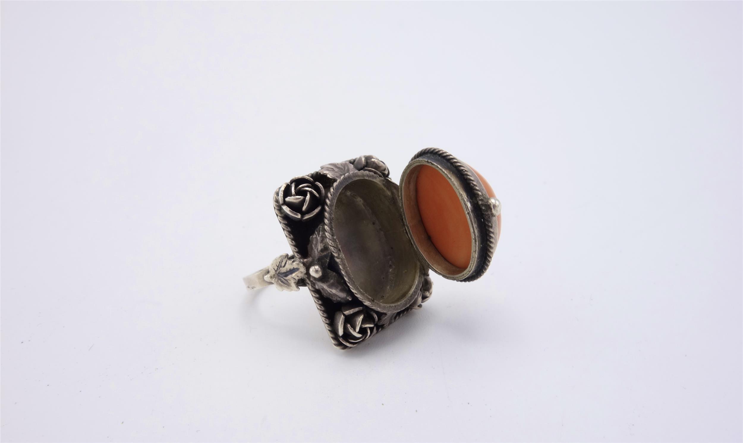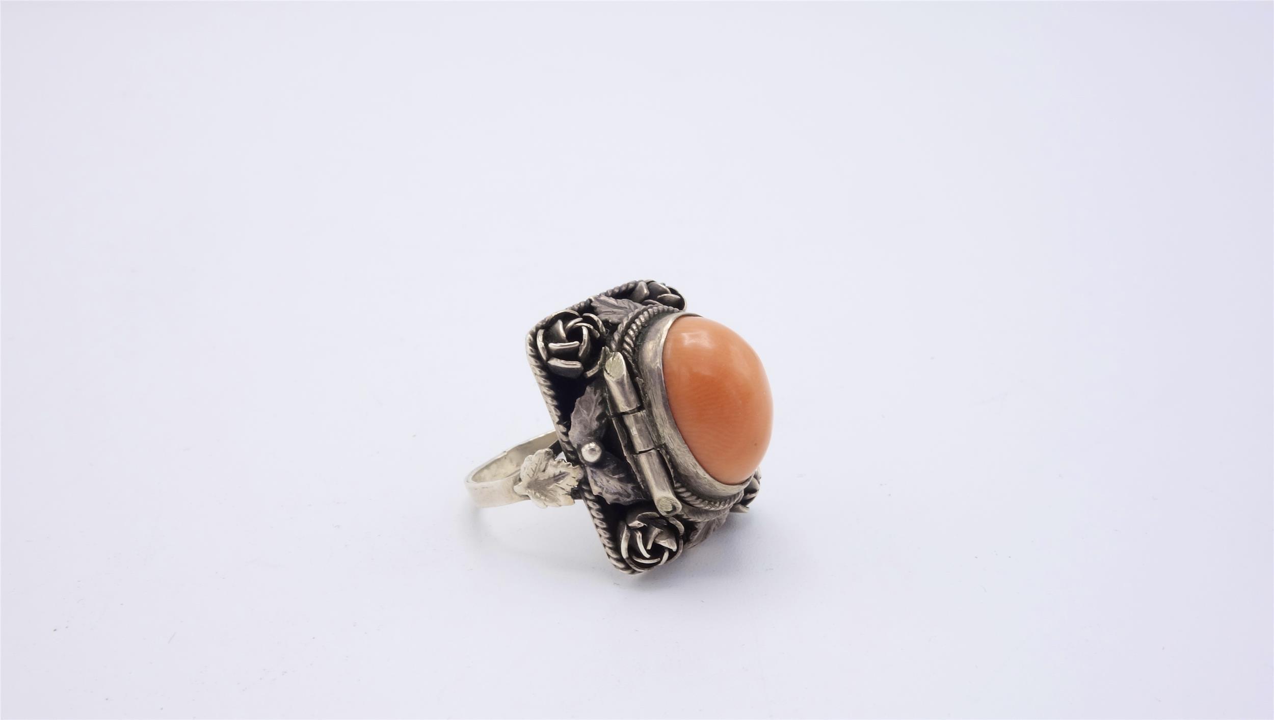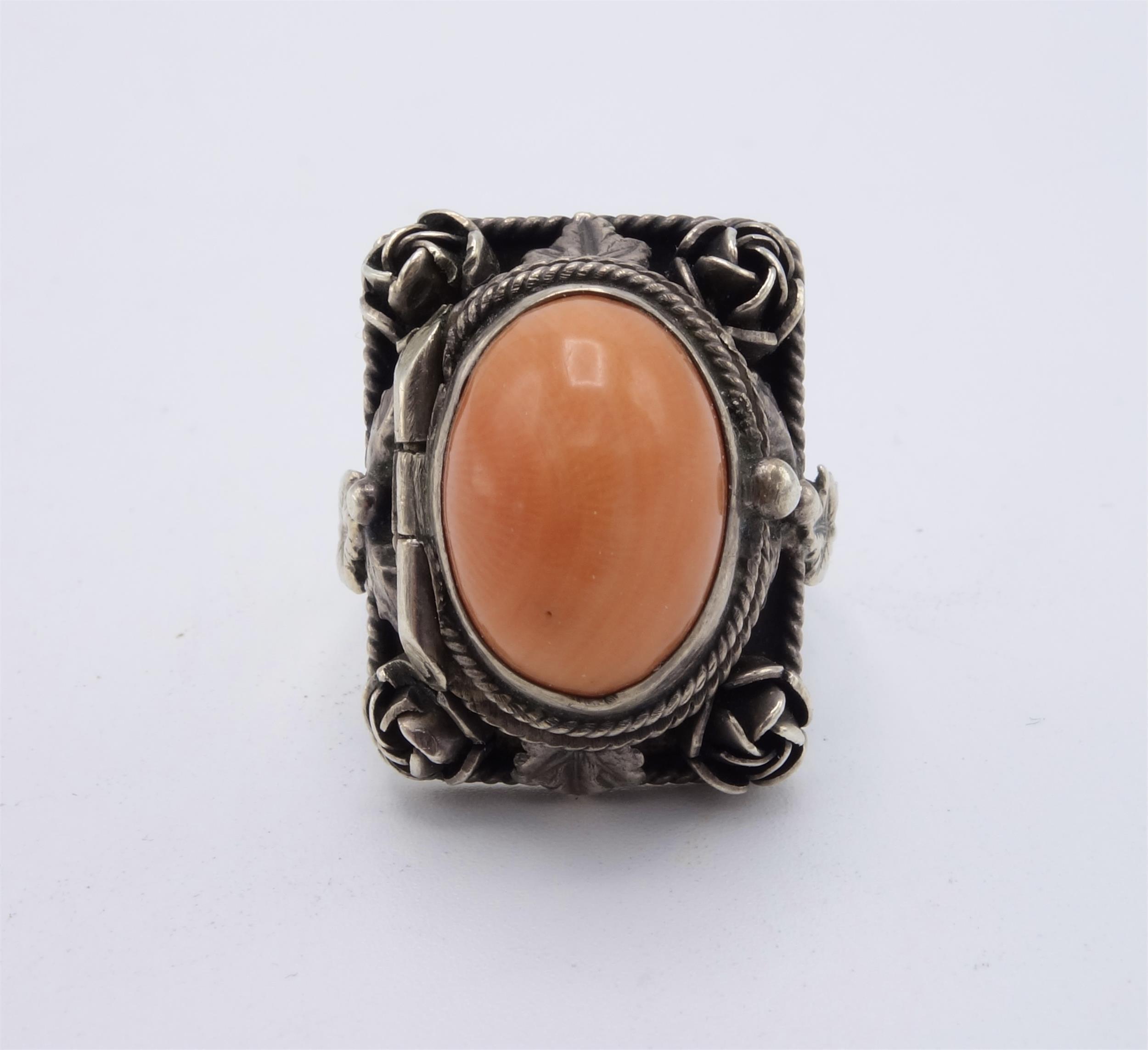 Ring mit Korallencabochon, mit verschließbarem Behälter - sogenannter "Giftring", Silber, Anfang 20. Jahrhundert