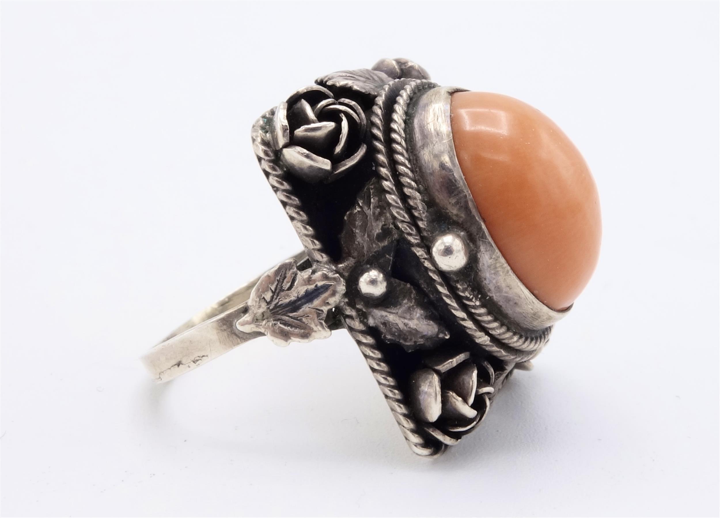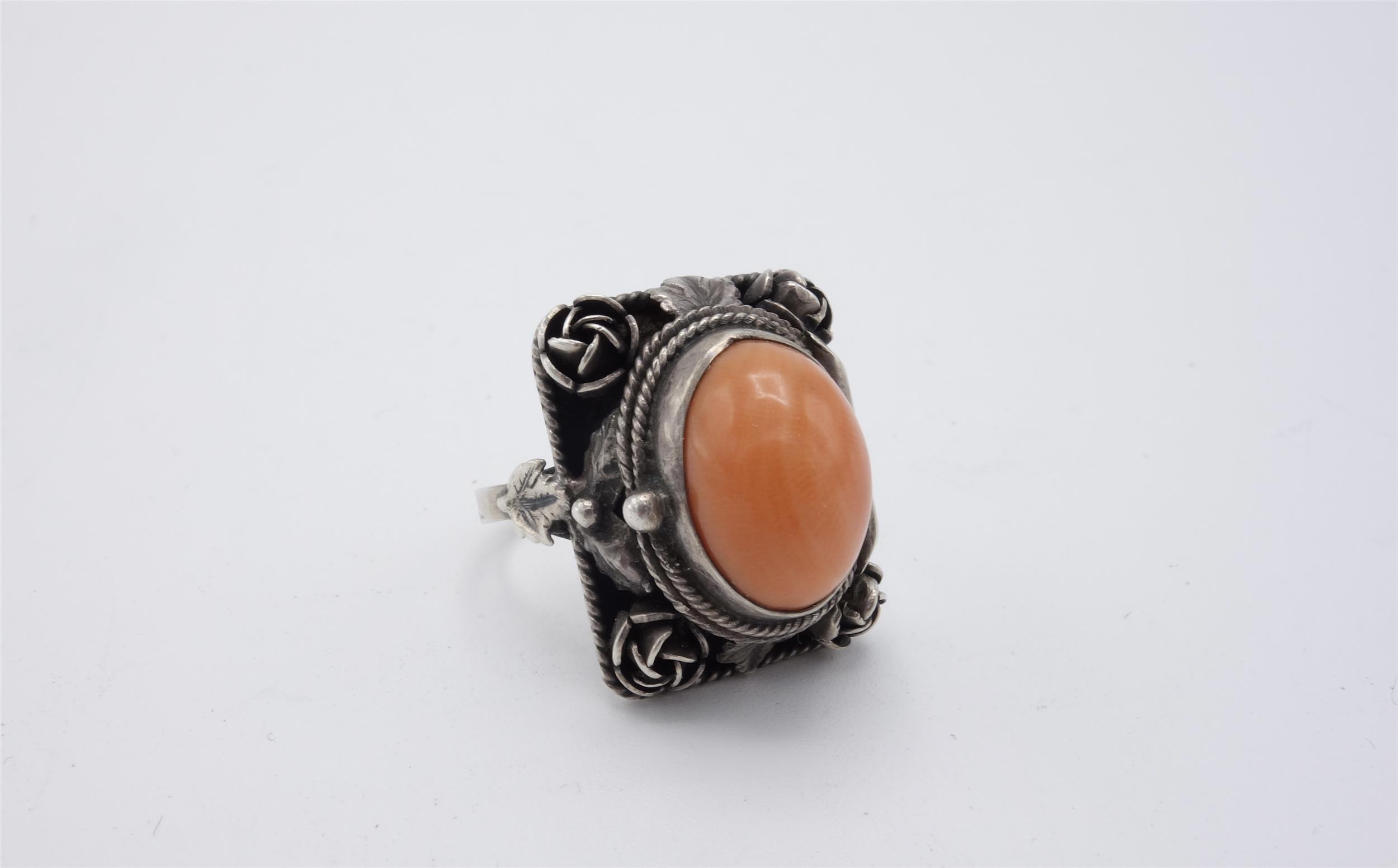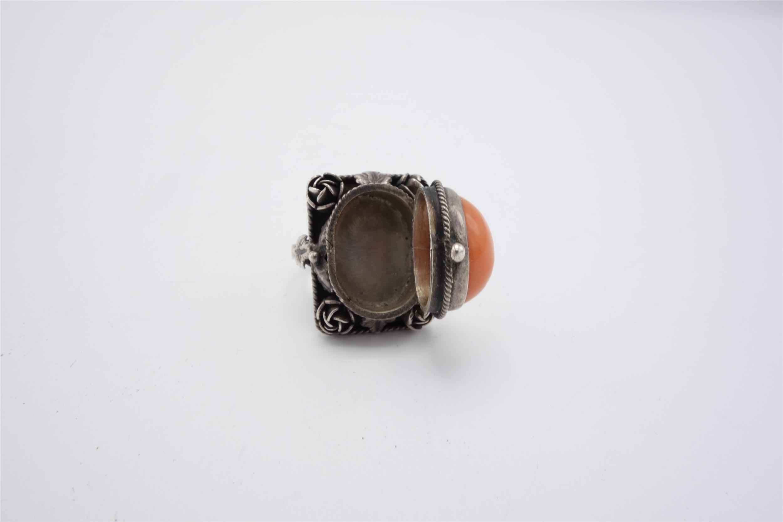 Ring mit Korallencabochon, mit verschließbarem Behälter - sogenannter "Giftring", Silber, Anfang 20. Jahrhundert
