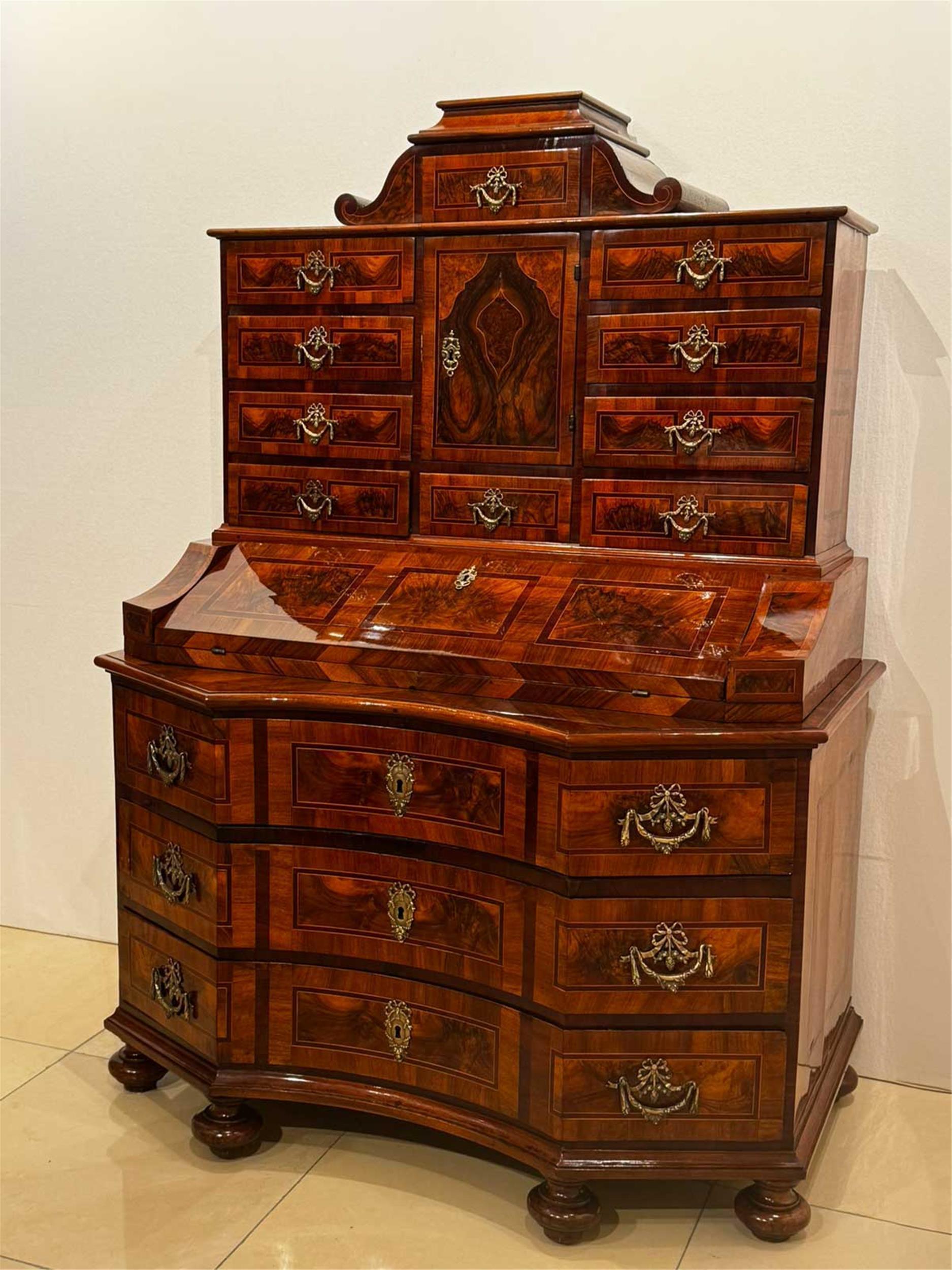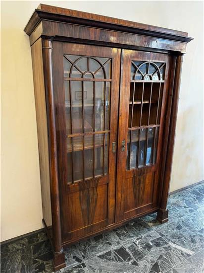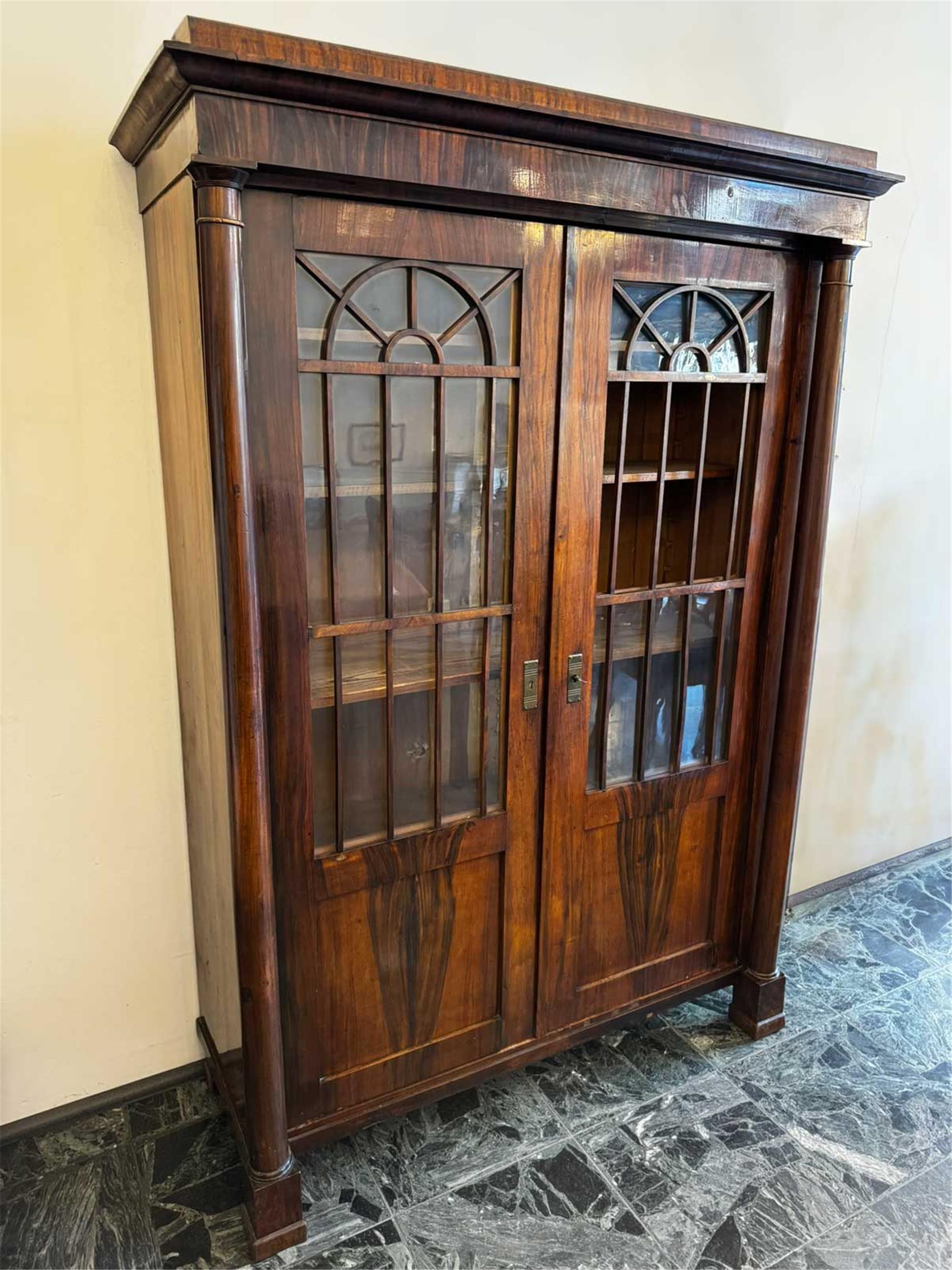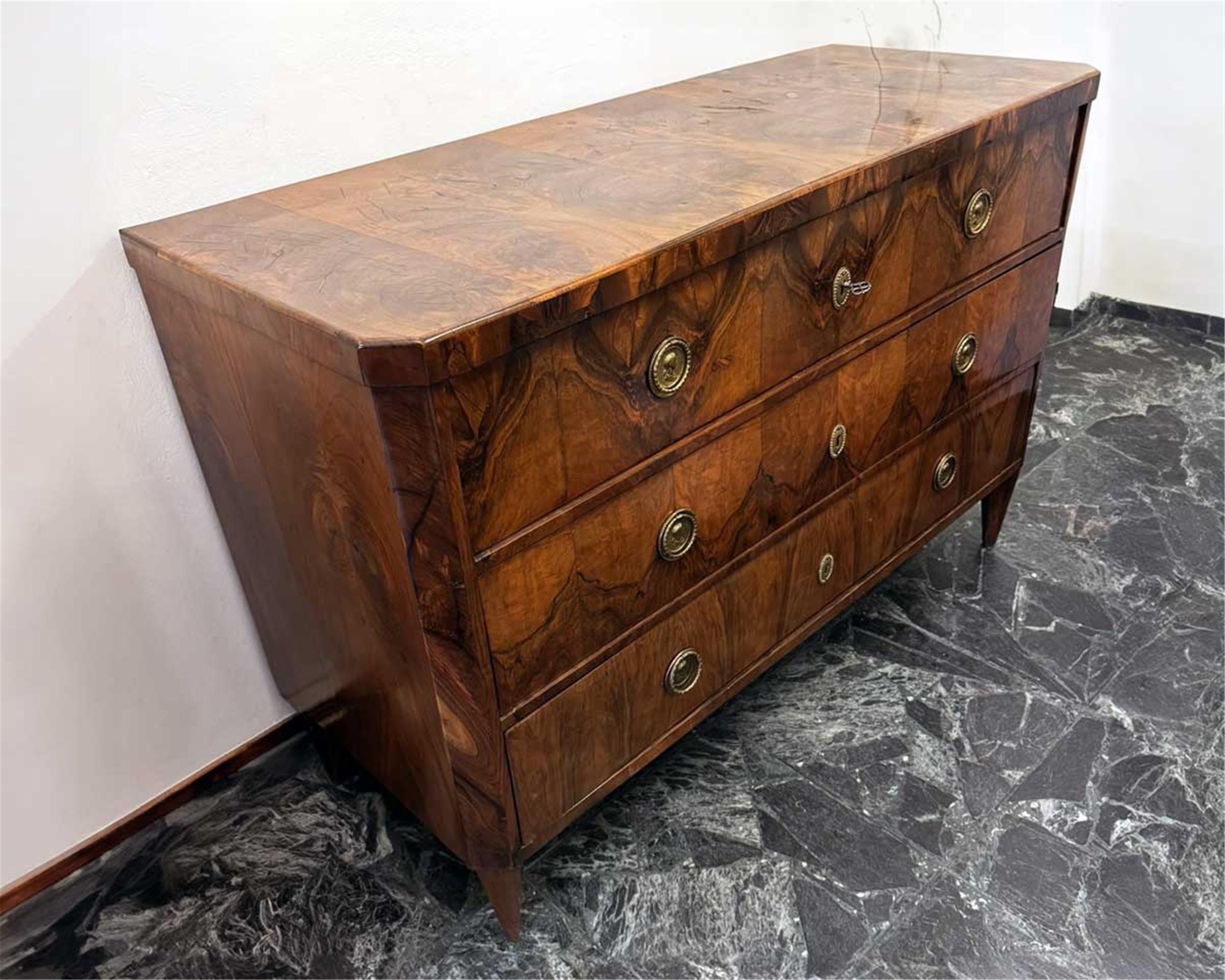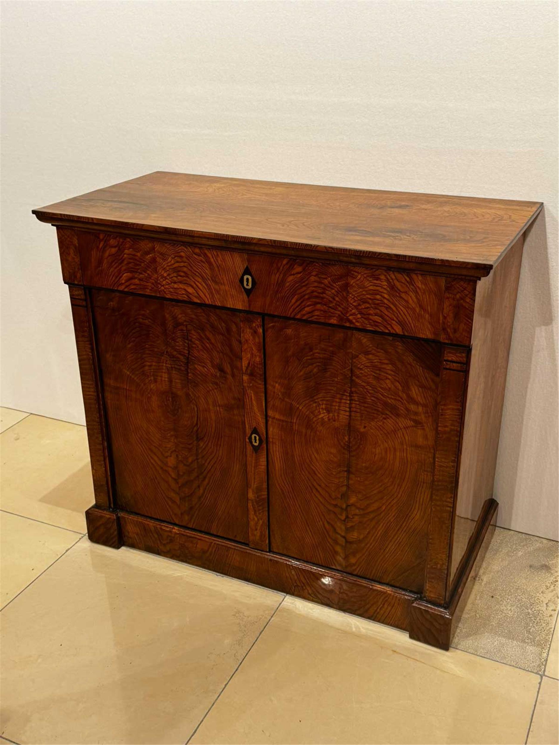 Dieser außergewöhnliche Biedermeier-Salontisch aus Wien um 1825 fasziniert durch seine klare Formensprache und sein besonders ansprechendes Nussbaum-Furnierbild, das sich in einer radialen – beinahe blütenartigen – Struktur über die gesamte runde Tischplatte erstreckt.