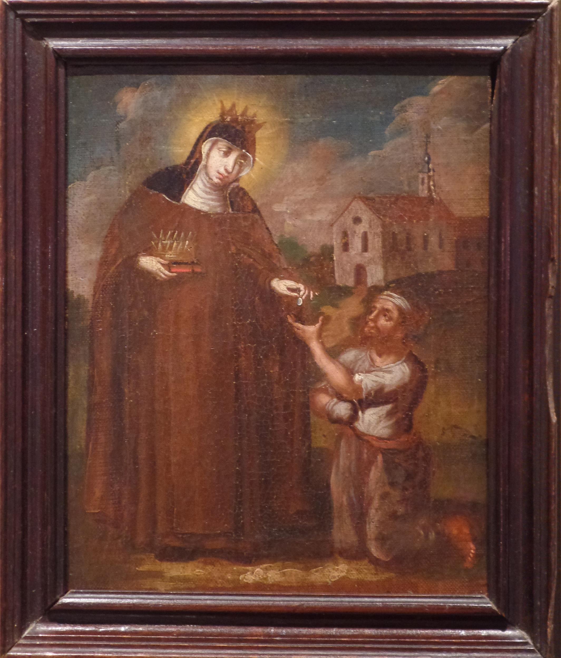 Schöne volkskundliche Darstellung der Heiligen Elisabeth von Thüringen, Öl auf Leinen, alpenländisch, zweite Hälfte 18. Jahrhundert, alt gerahmt.