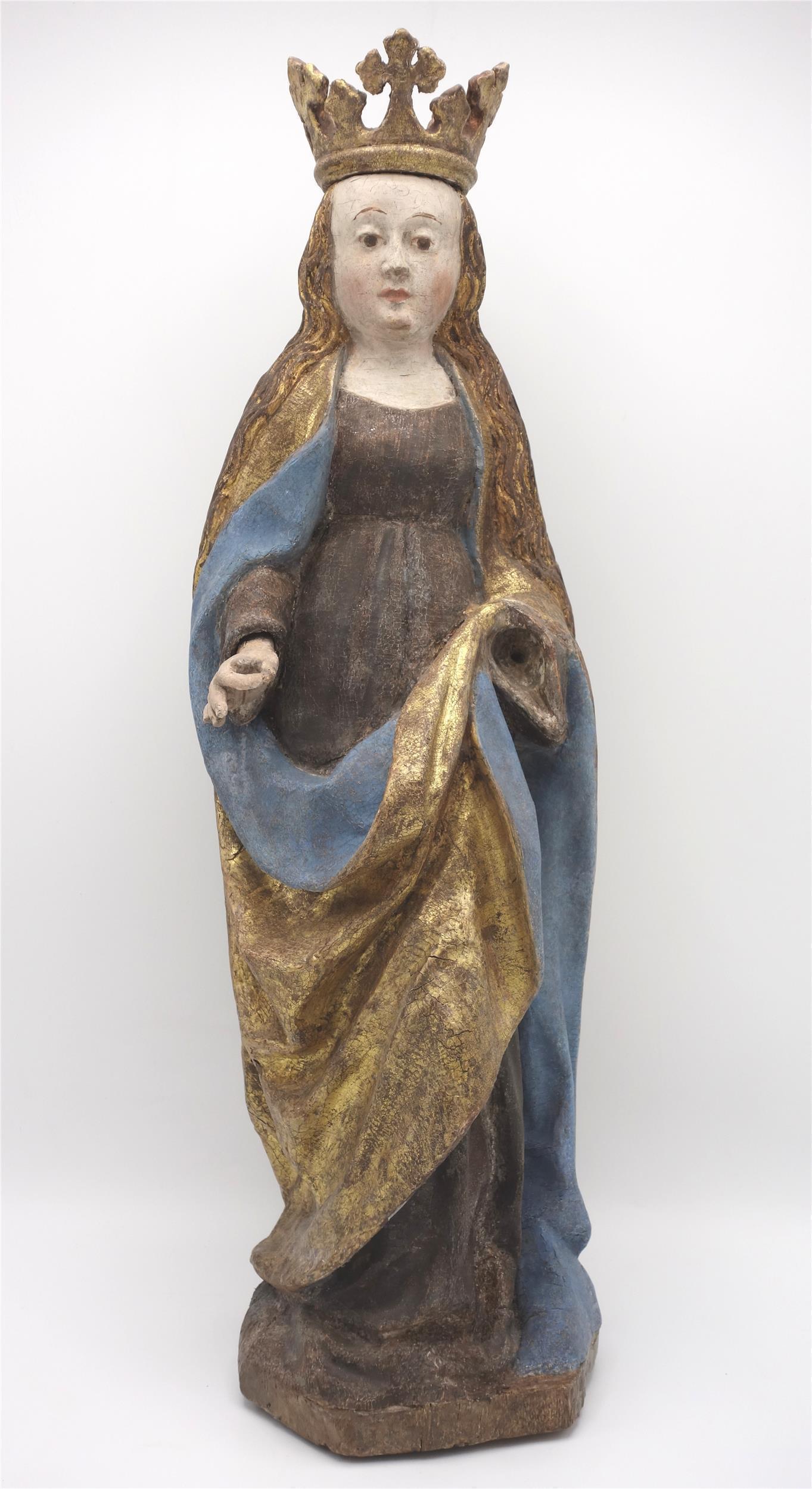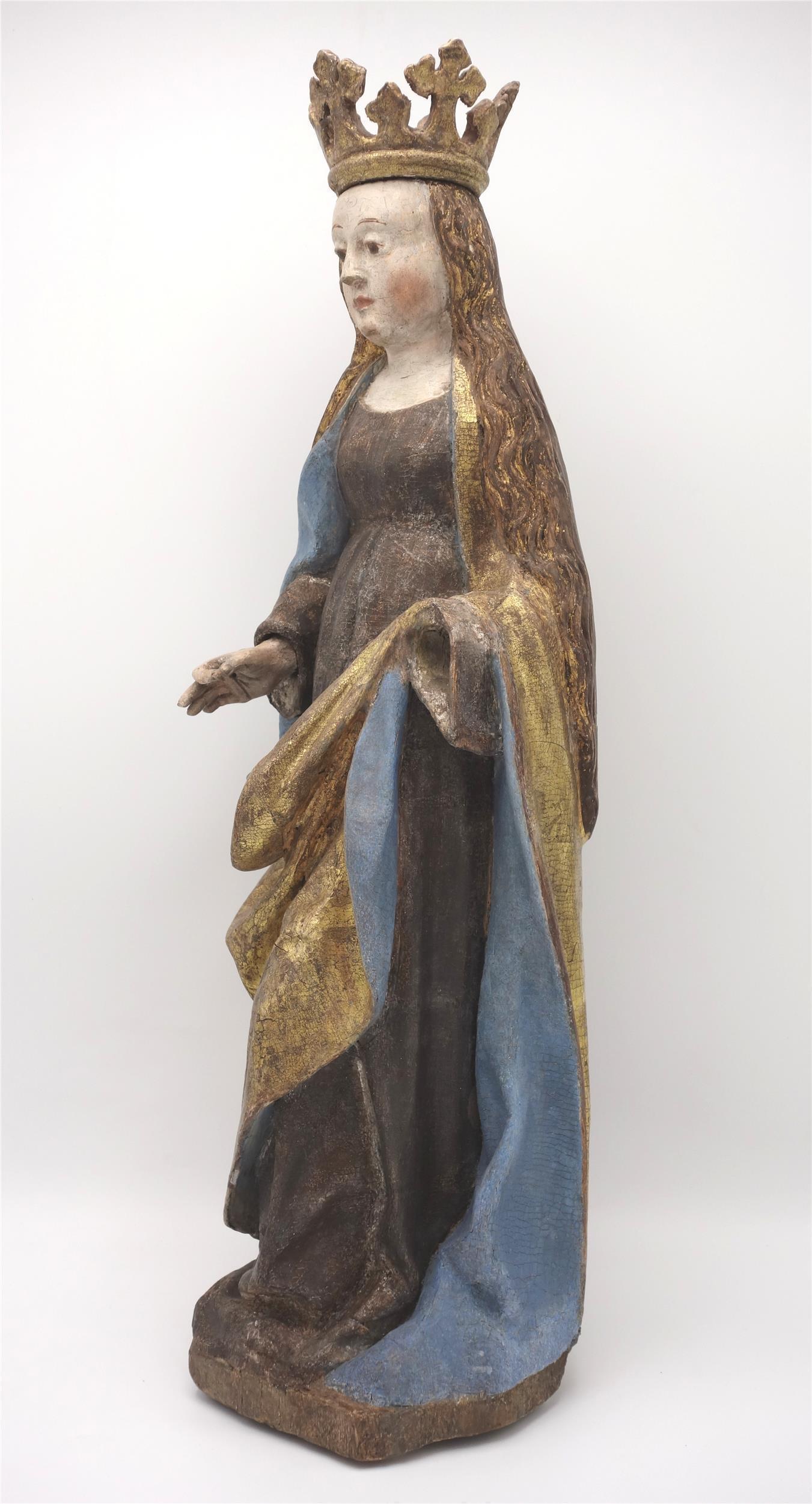 Spätgotische Skulptur der Muttergottes, Lindenholz geschnitzt mit teils noch originaler Fassung auf feinem Leinen, alpenländisch, um 1480
