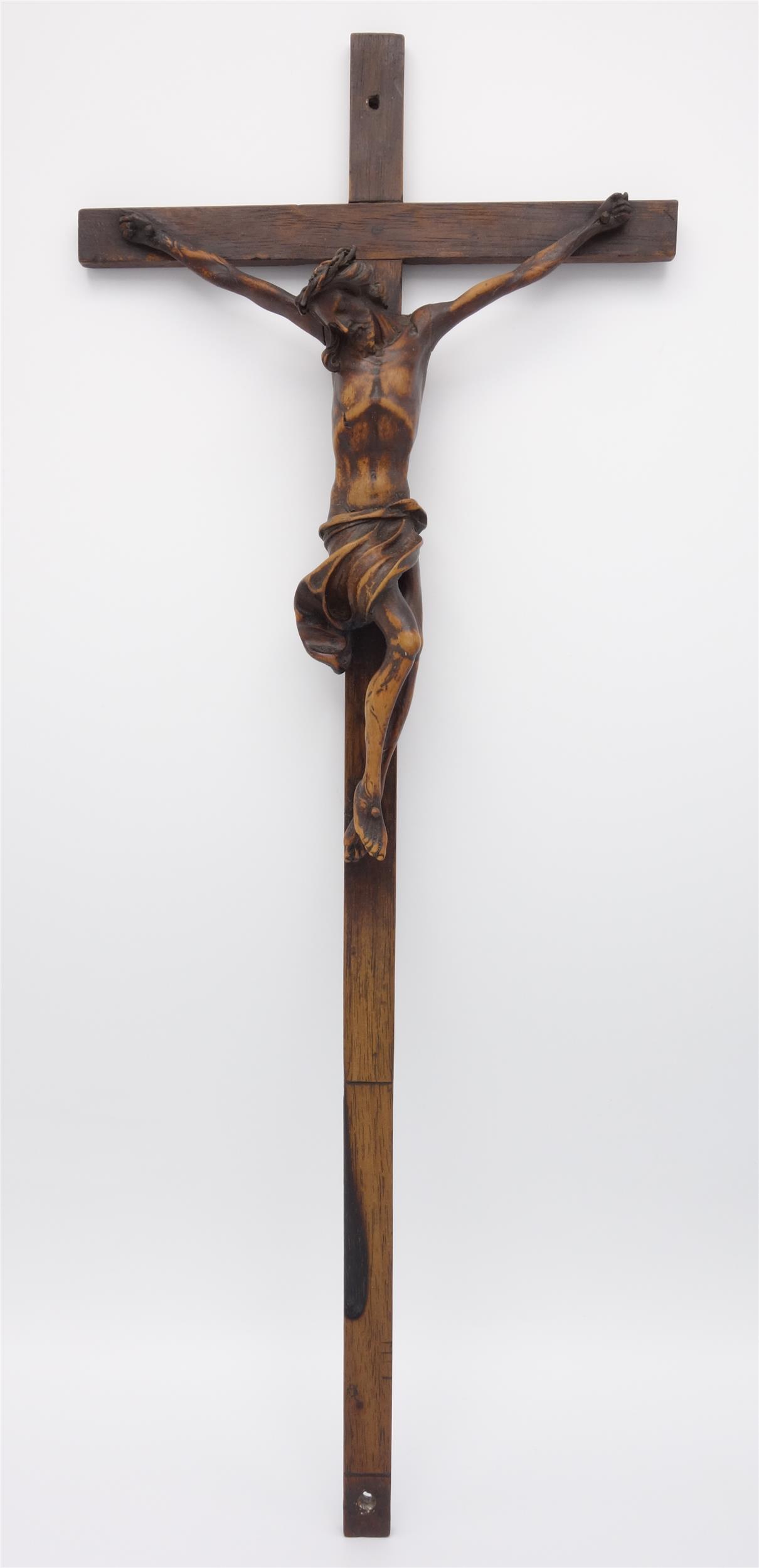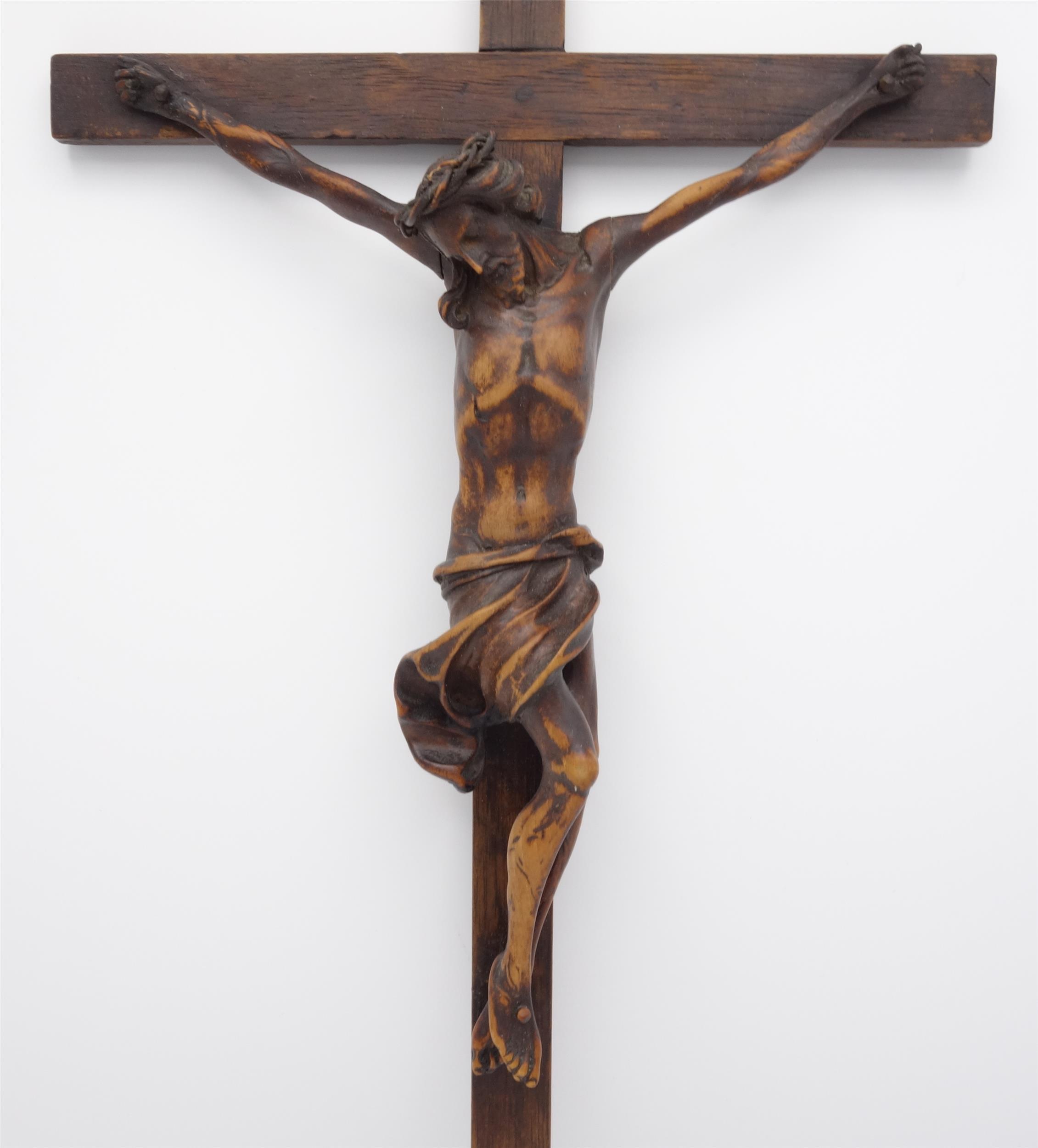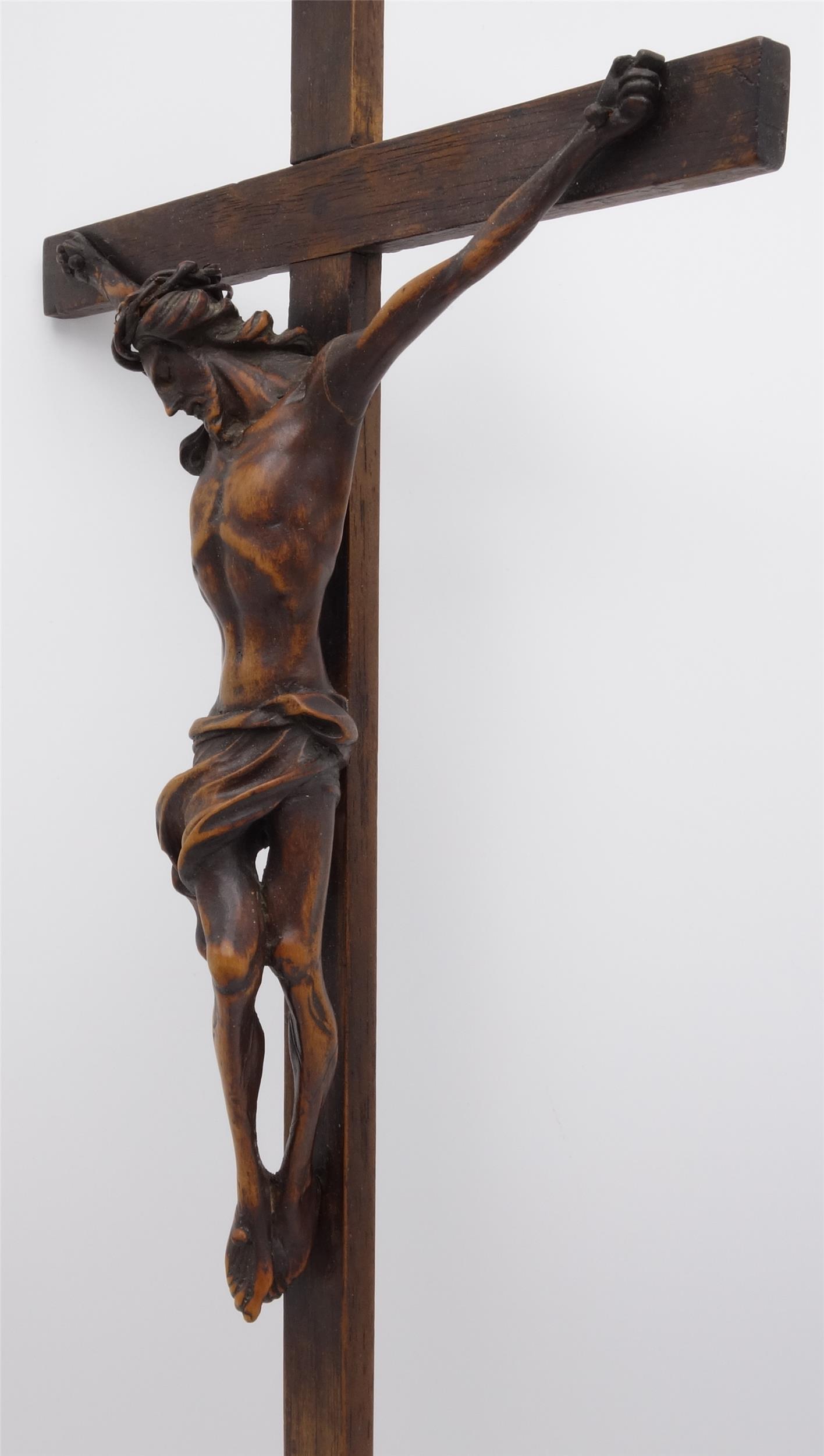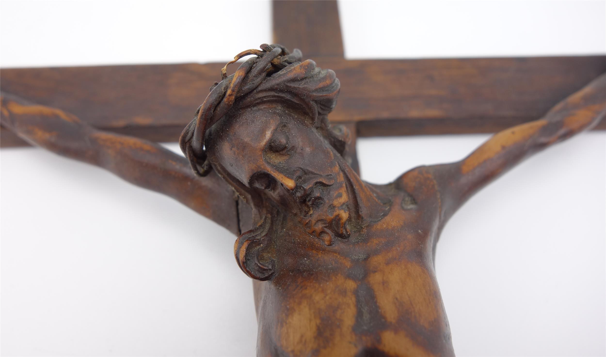 Fein geschnitzter Holzkruzifix, Corpus Christi aus Buchsbaum auf Kreuz aus Nussbaum montiert, Ende 18. Jahrhundert