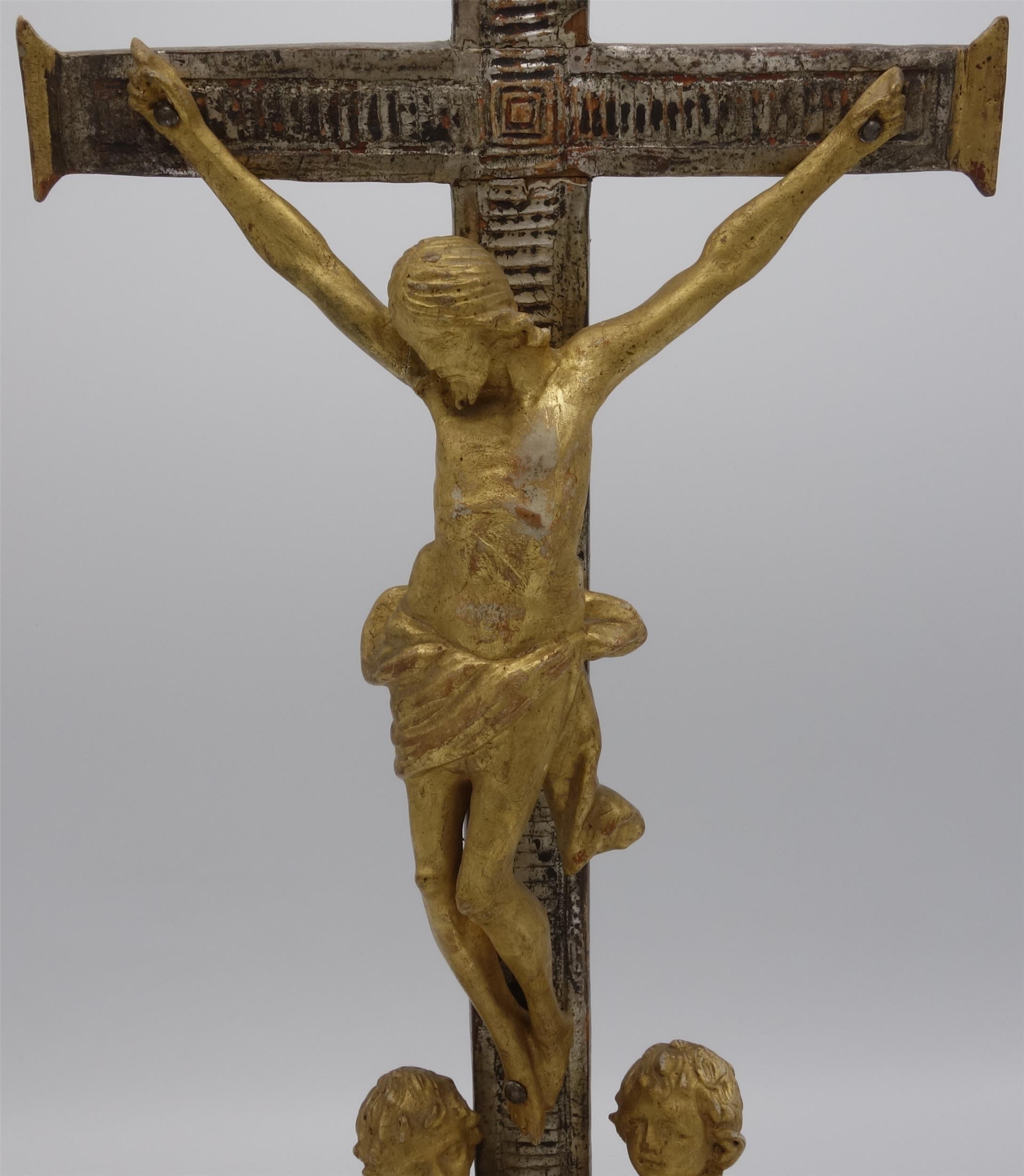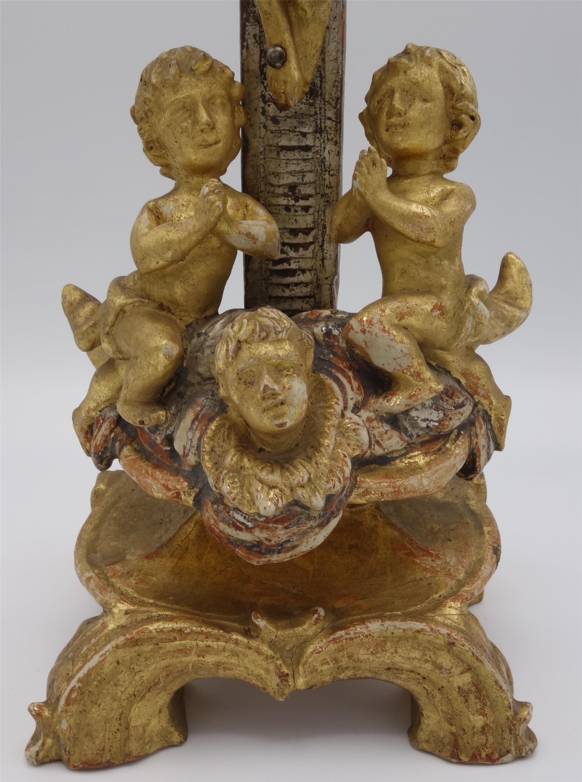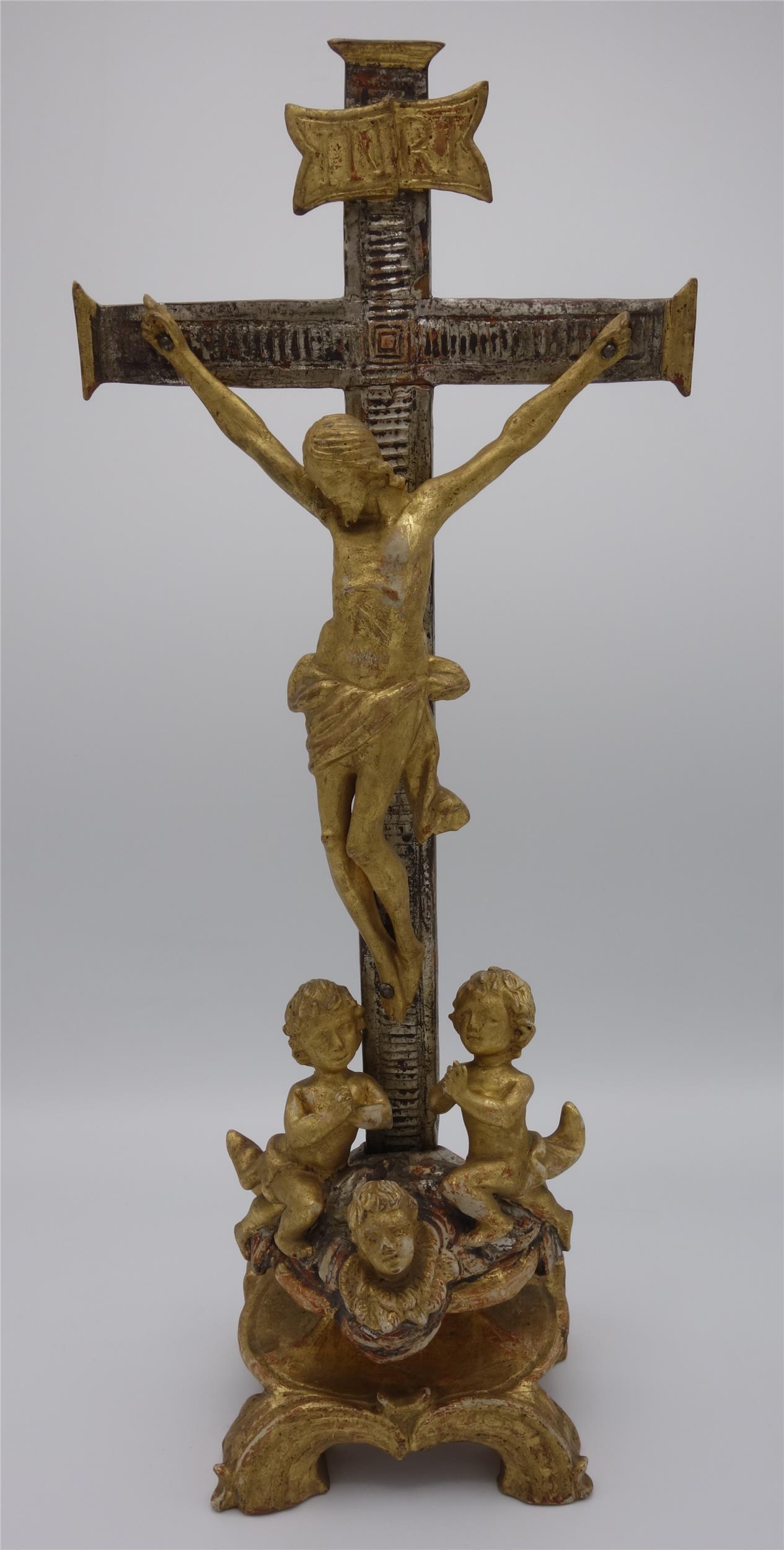 Holzkruzifix geschnitzt, frei zu stellendes Standkreuz mit adorierenden Engeln, Pimentvergoldet und -versilbert, sehr schöner Zustand.
