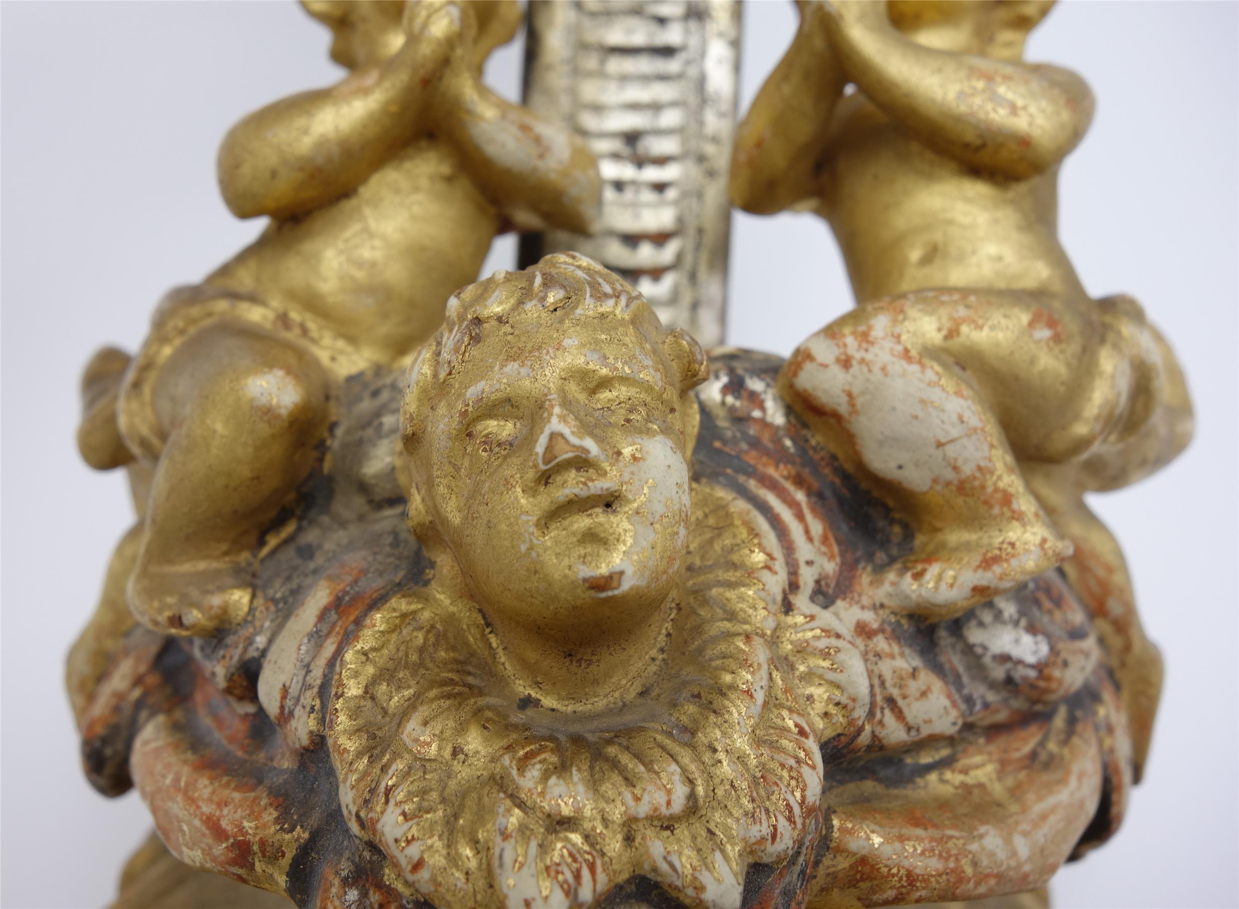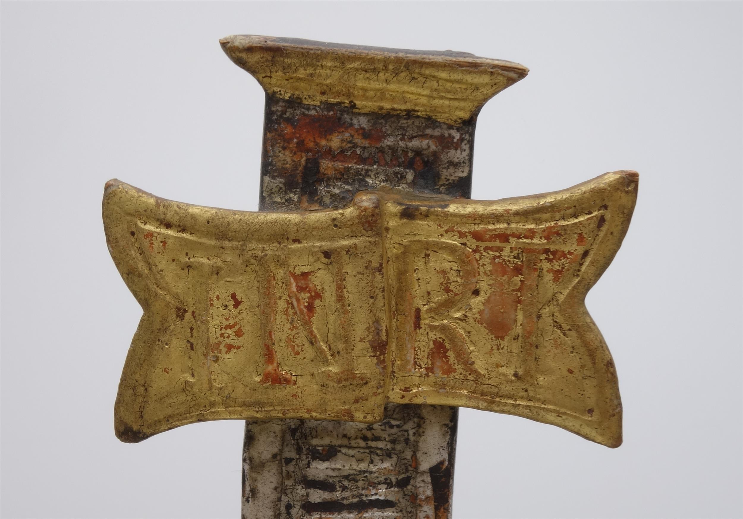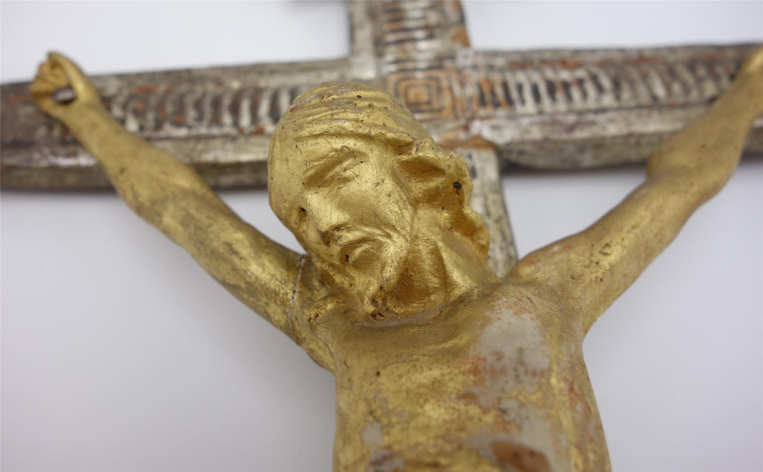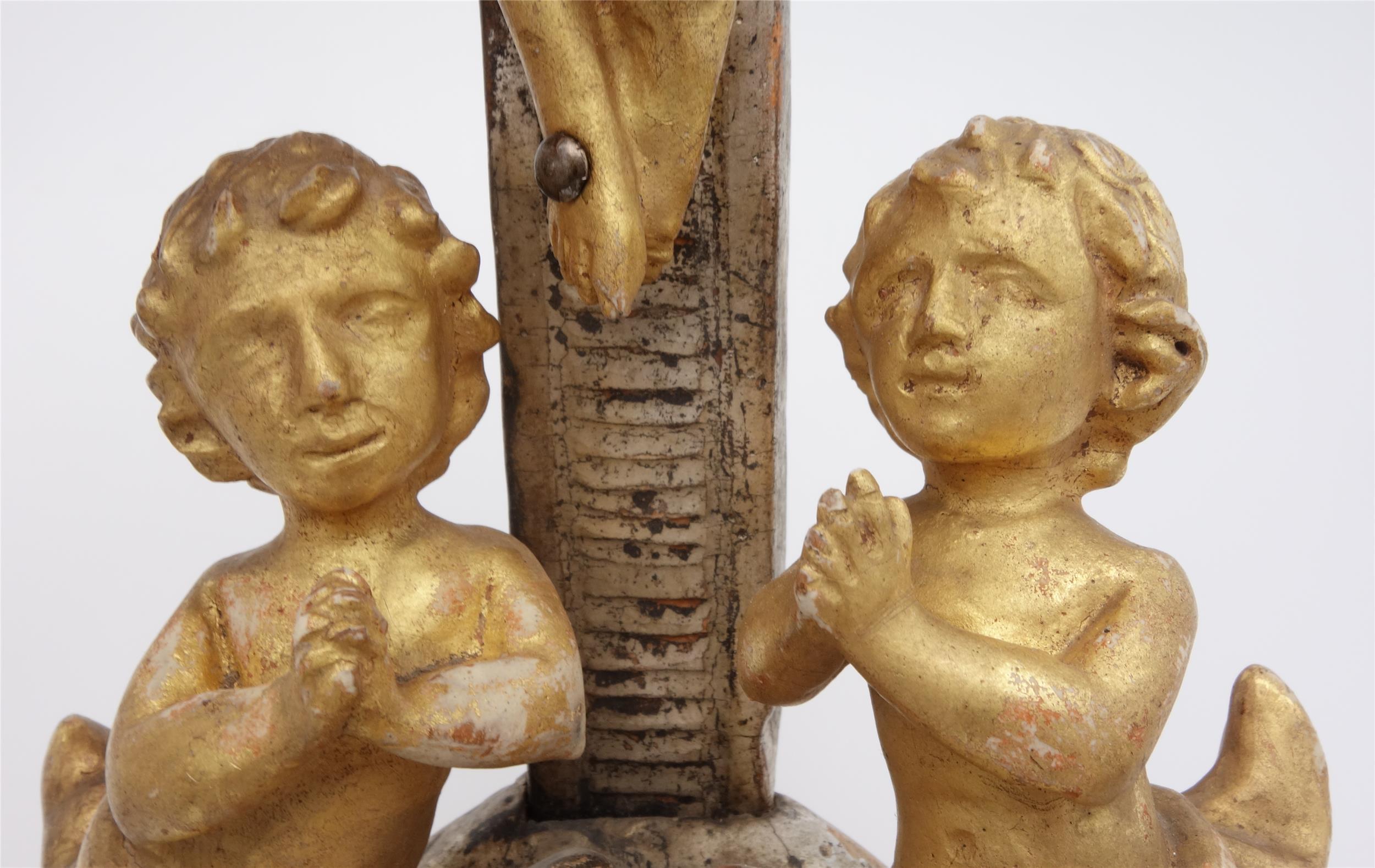 Holzkruzifix geschnitzt, frei zu stellendes Standkreuz mit adorierenden Engeln, Pimentvergoldet und -versilbert, sehr schöner Zustand.