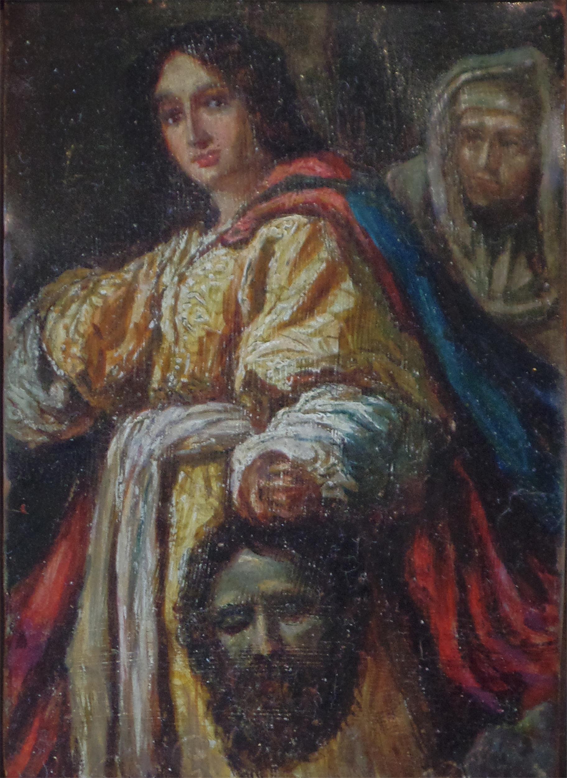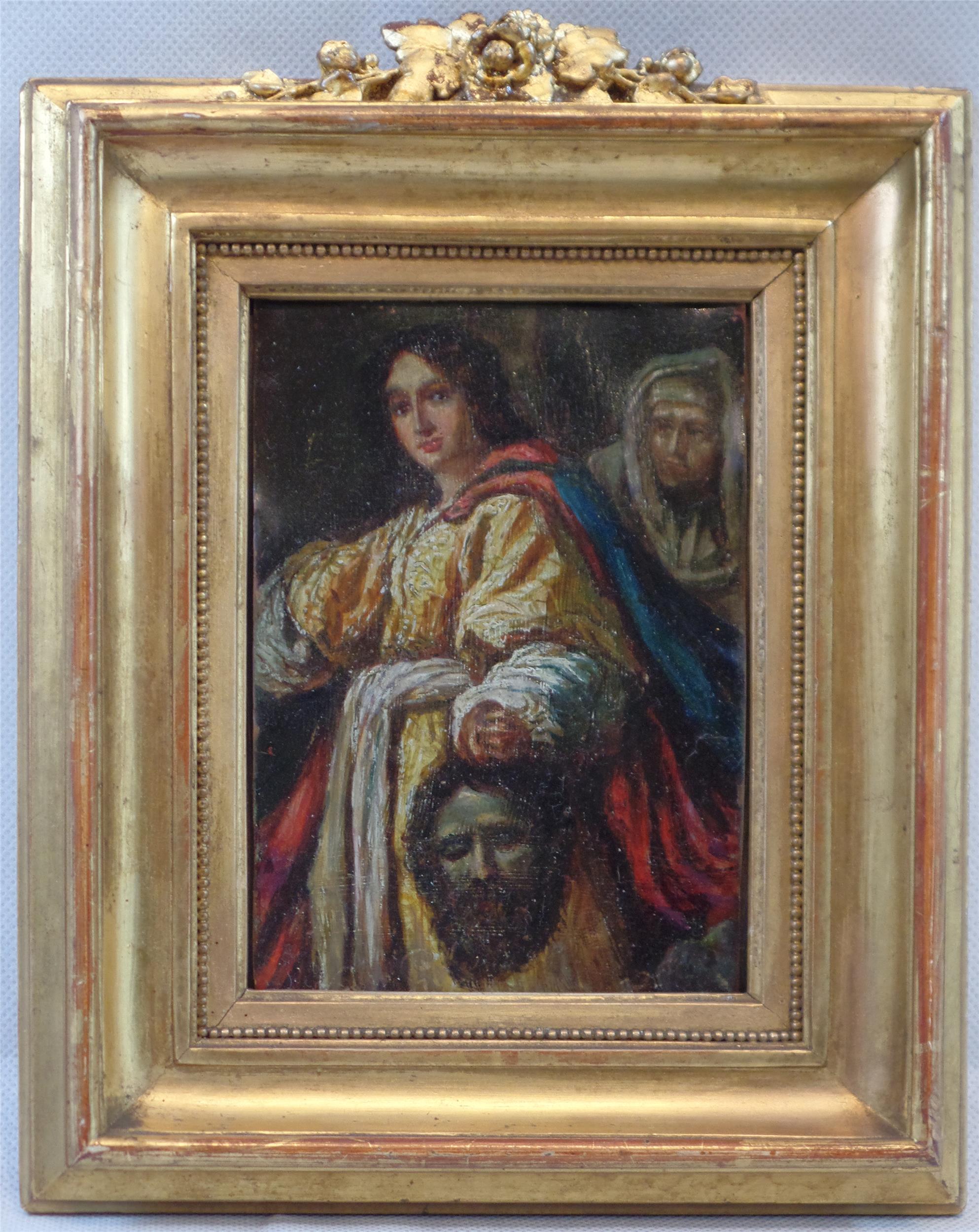 Es handelt sich bei diesem in Öl auf Kupfer gearbeiteten und nur etwa 13 x 10 cm großen Werk um eine gute, stark verkleinerte Interpretation des gleichnamigen Meisterwerkes von Christofano Allori (Florenz 1577 - 1621), welches sich heute in der Sammlung des Kunsthistorischen Museums in Wien befindet (siehe KHM Inv.Nr. 198). Entstanden im späten 18. oder Anfang des 19. Jahrhunderts zeigt sich die Arbeit in gereinigtem und gut gerahmten Zustand.