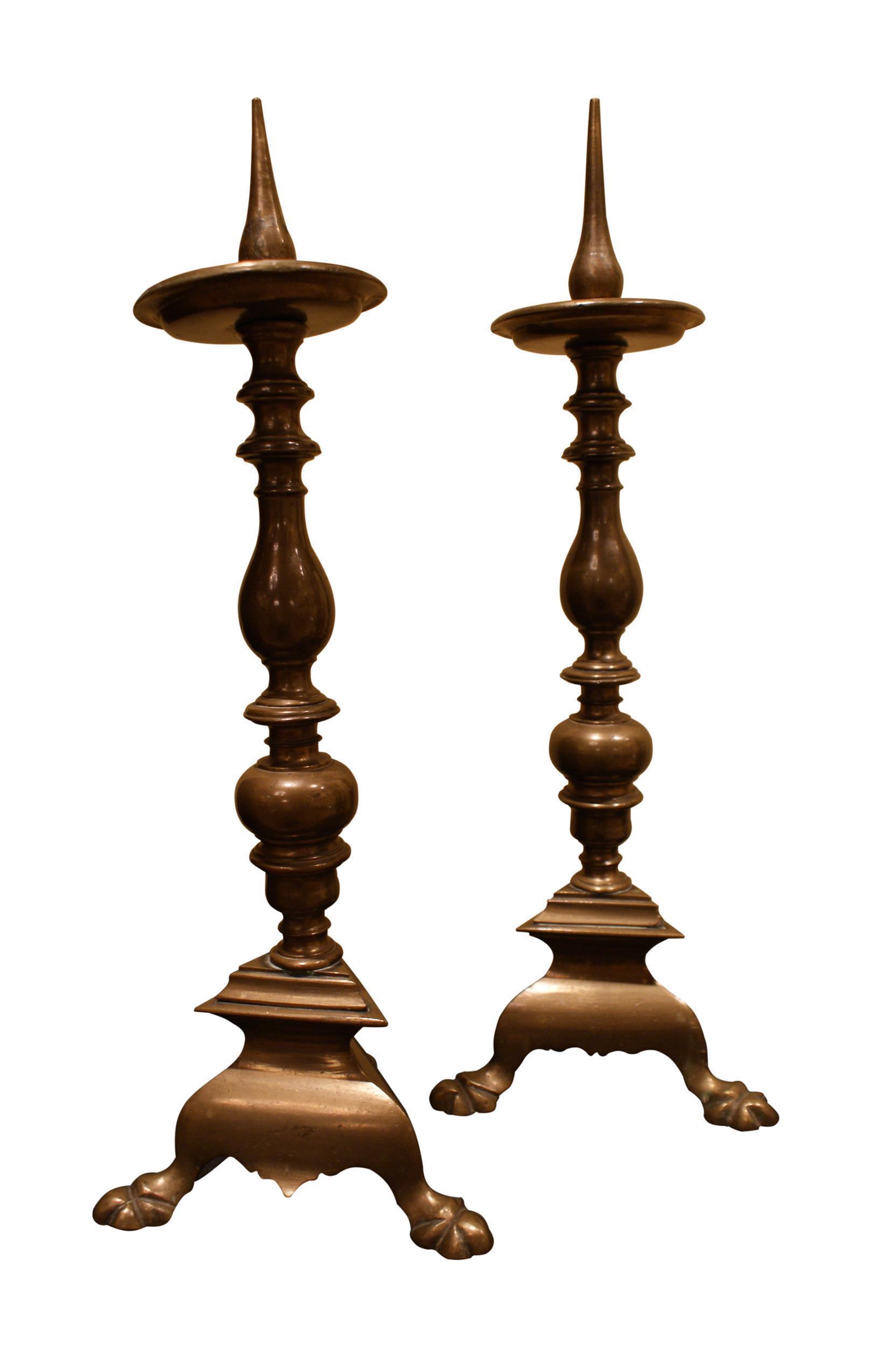 Ein Leuchter aus massivem Messing, barock um 1700, kein Paar, jedoch sehr ähnlich (der Unterschied besteht vor allem in der Länge des Dorns), guter Zustand.