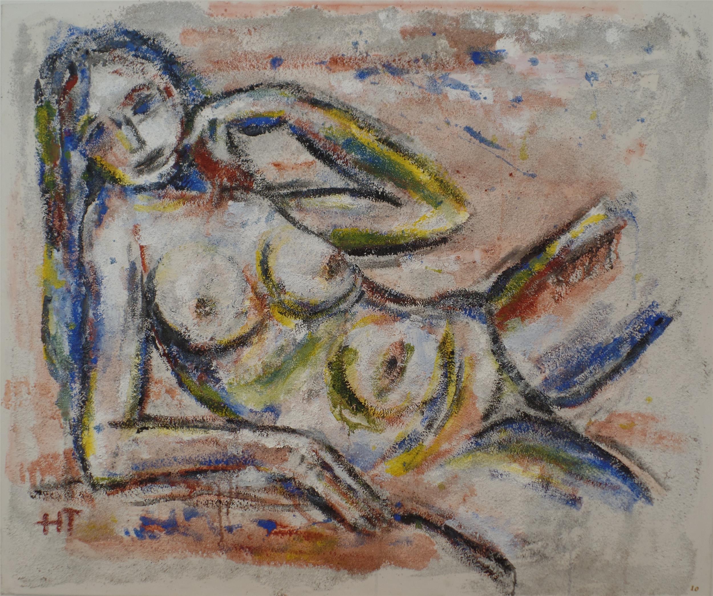 Aktgemälde, Mischtechnik mit Acryl und Sand auf Leinwand, monogrammiert HT für Hans Heinz Tagger (geb. 1935 in Graz), Anfang 21. Jahrhundert. Der Künstler war Mitglied der Grazer Sezession.
