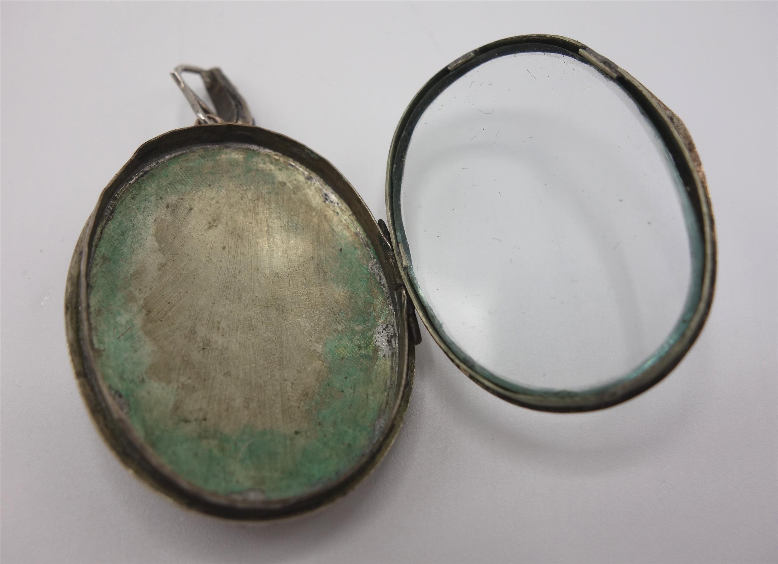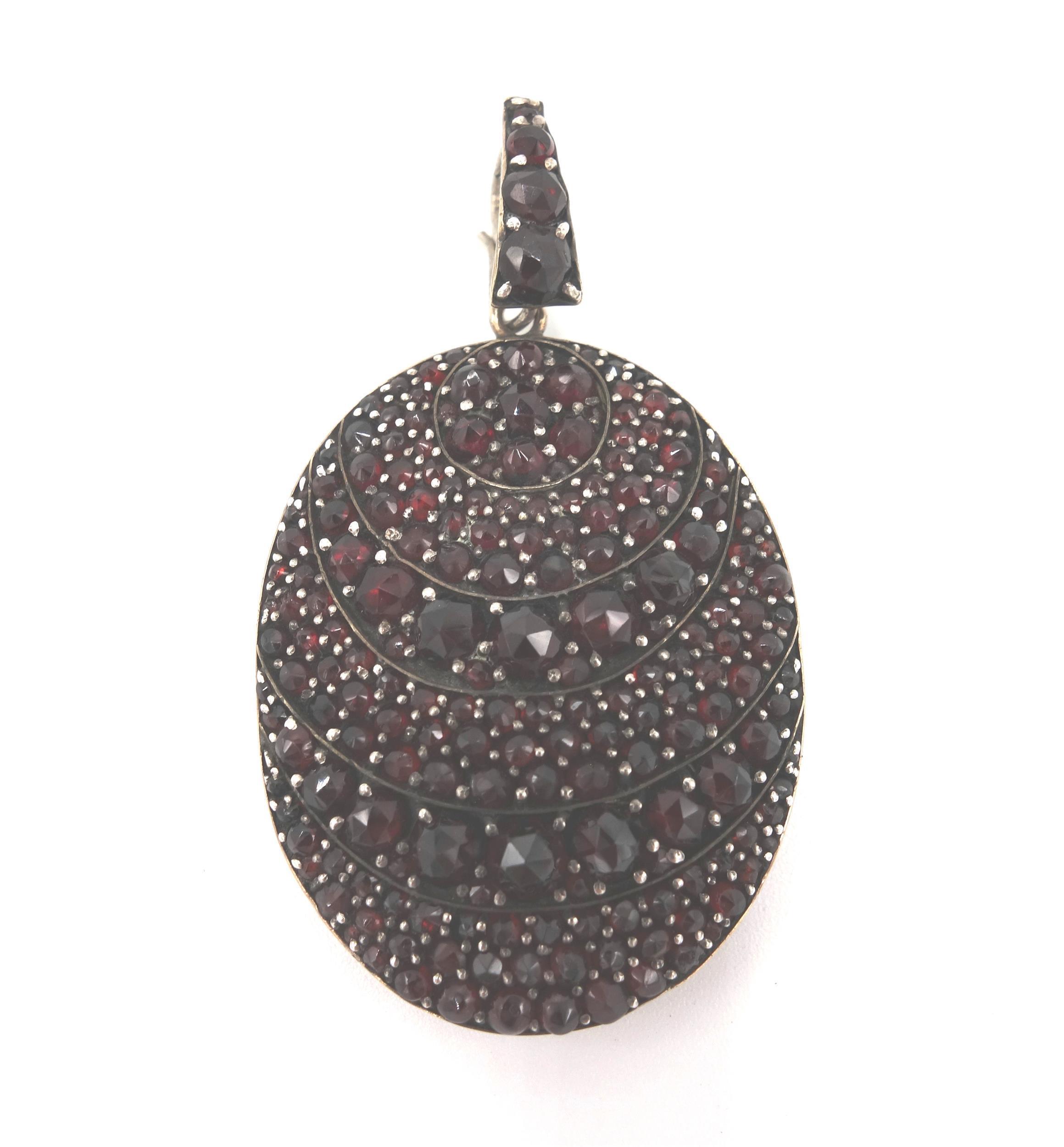 Silbermedaillon, Dekorseite mit böhmischen Granat, Rückseite mit Glasfläche für Bildchen oder Haarlocke, Böhmen 19. Jahrhundert