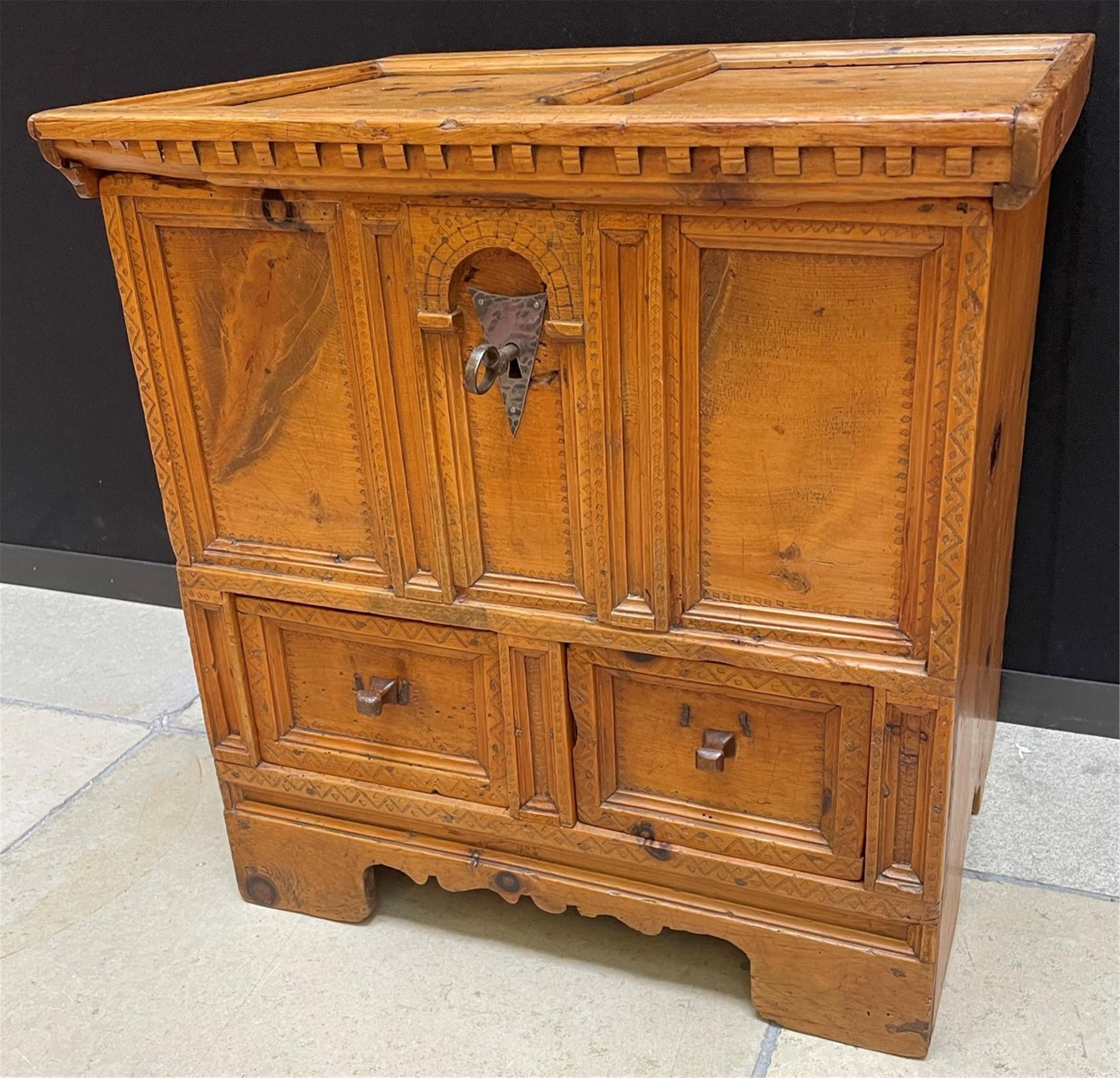 In dieser Form äußerst seltene Miniaturtruhe, ca. 54 x 42, Höhe ca. 56 cm, Tirol, Zirbenholz, 18. Jh., sehr guter Zustand.