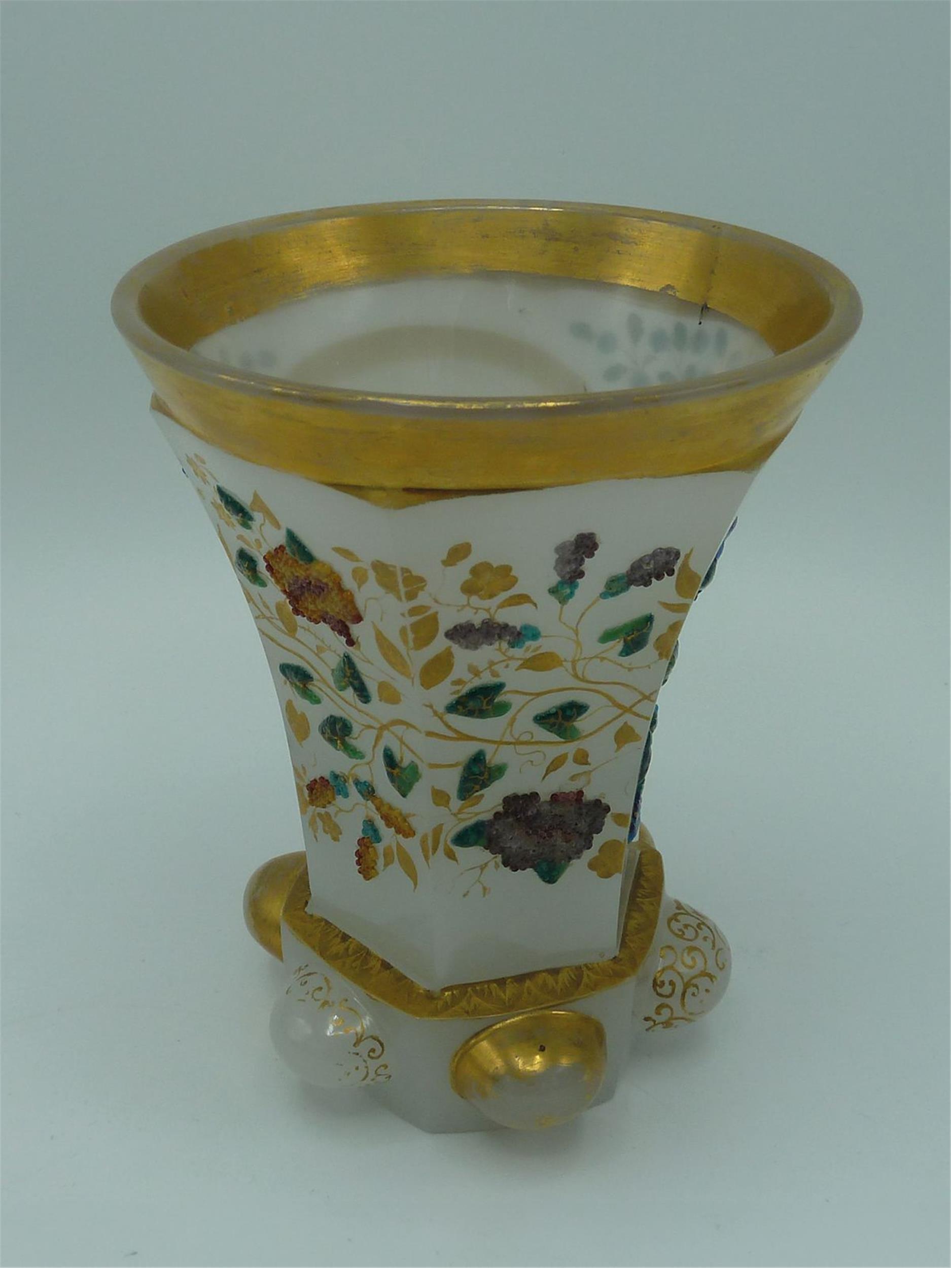 Sockelbecher, weißes Opalglas mit Goldmalerei, aufgeschmolzene farbige Glasperlen, Böhmen, zweites Viertel 19. Jahrhundert