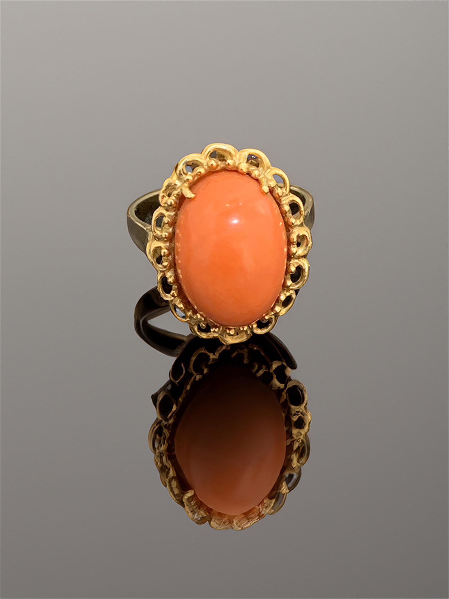 Dieser Fingerring aus 14-karätigem Gold (585er Feingehalt) mit einer ovalen Koralle stammt aus den 1960er Jahren und spiegelt den Schmuckstil der damaligen Zeit wider, der häufig durch kräftige Farben und auffällige Edelsteine bzw. Schmucksteine charakterisiert war.