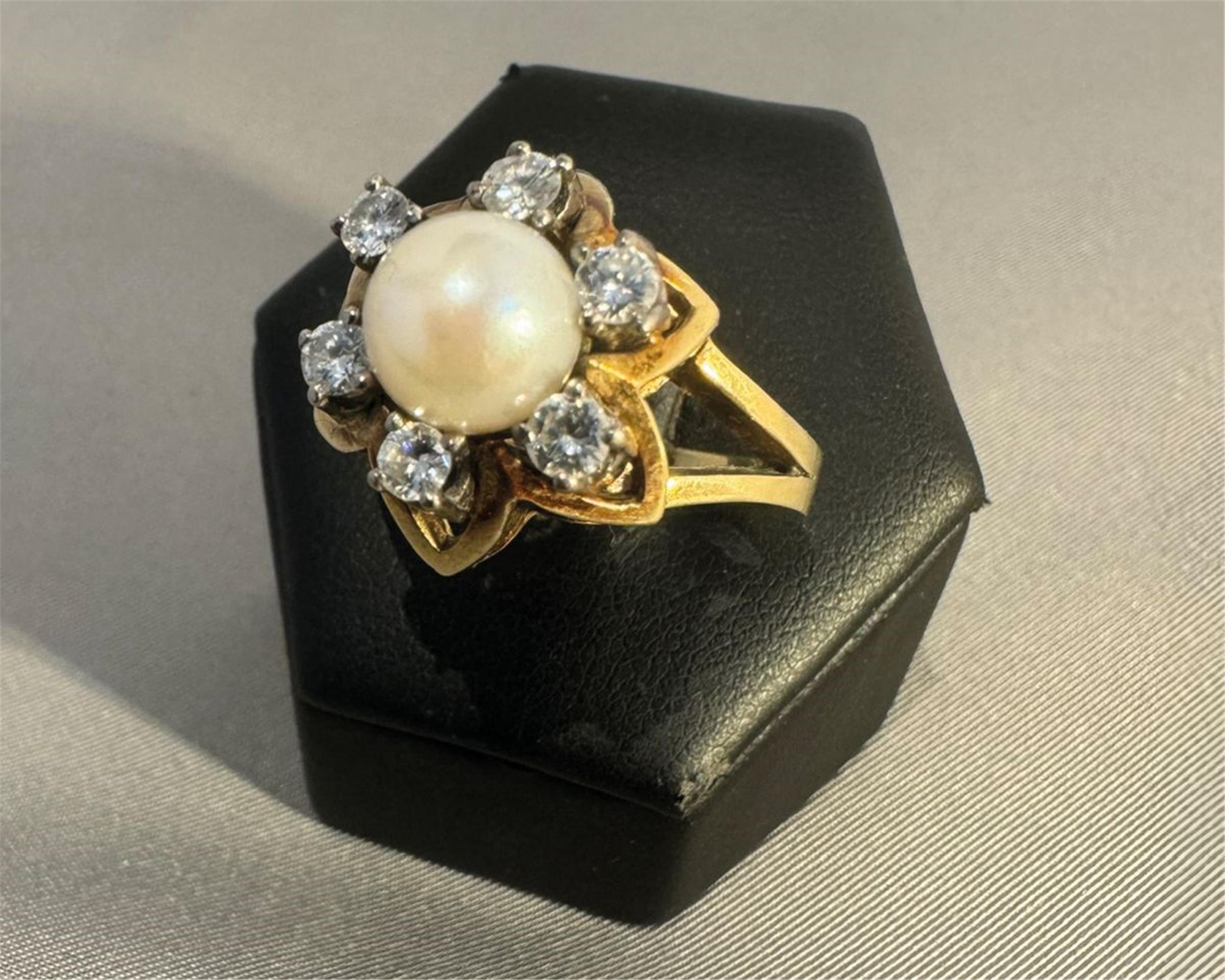 Ring, 14 Karat Gelbgold, 6 Brillanten, gesamt ca. 0,5 ct, Perle, 1960er Jahre