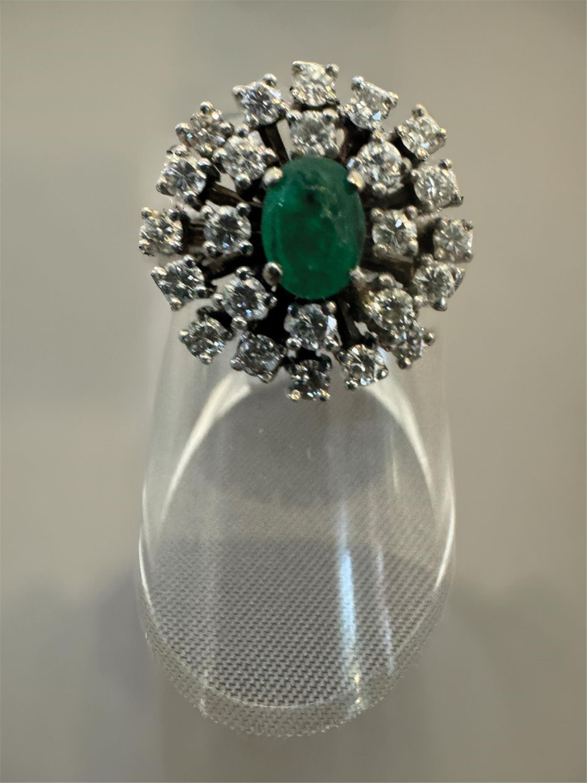 14 Karat Weißgold, Smaragd, 24 Brillanten, gesamt ca. o,70 ct, 1960er Jahre