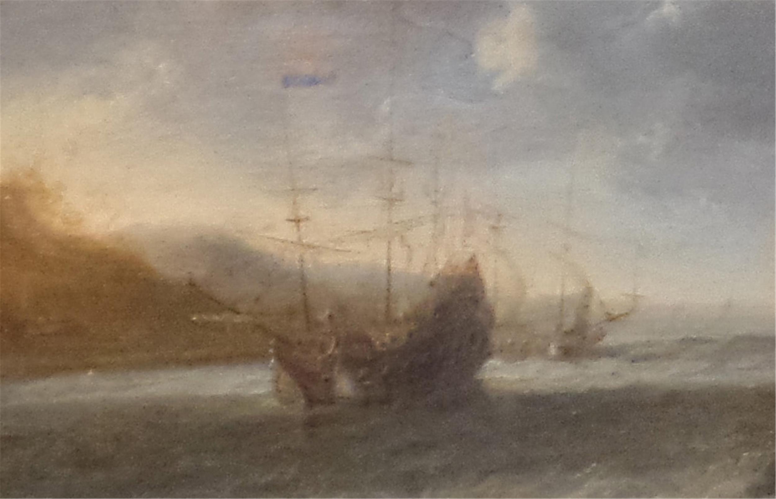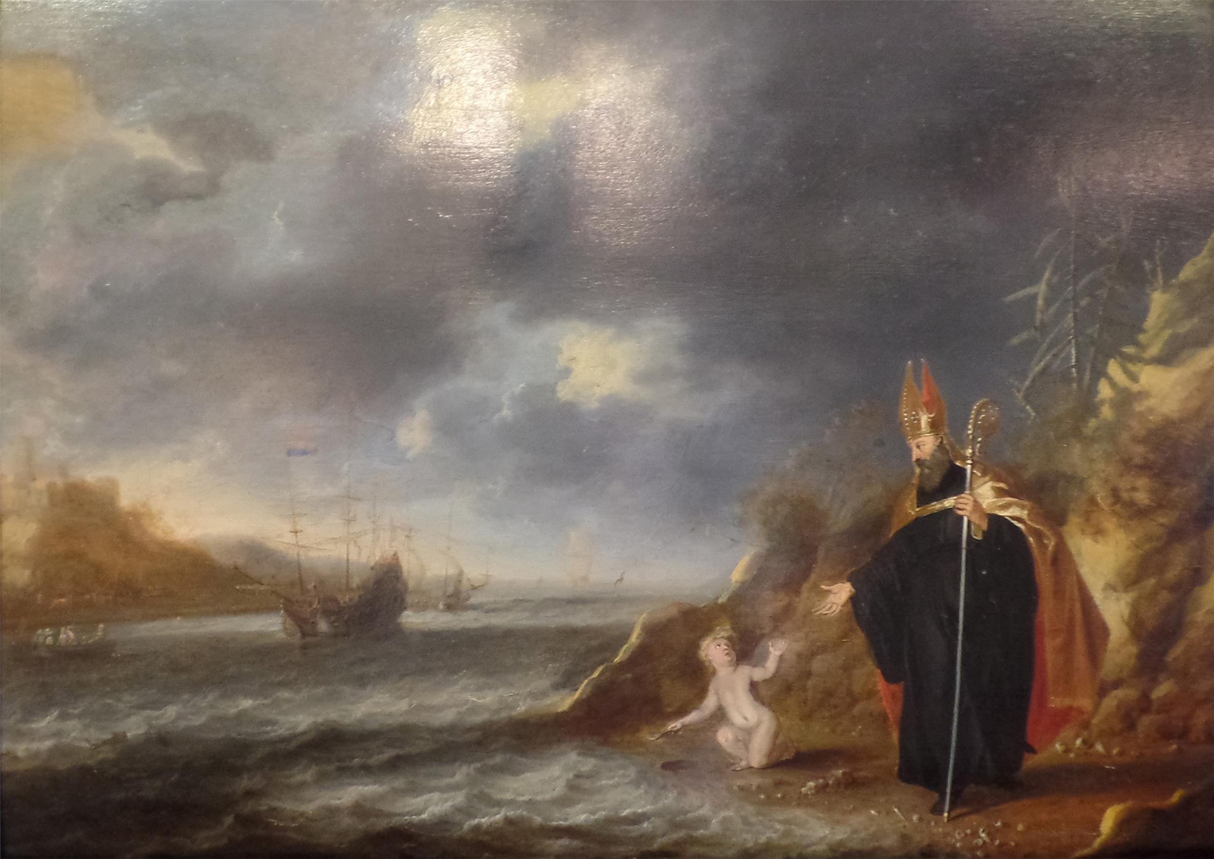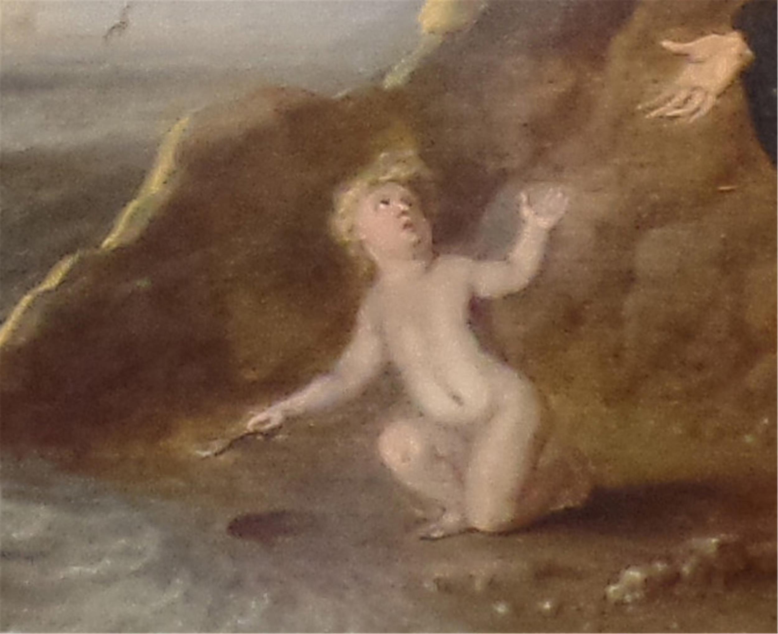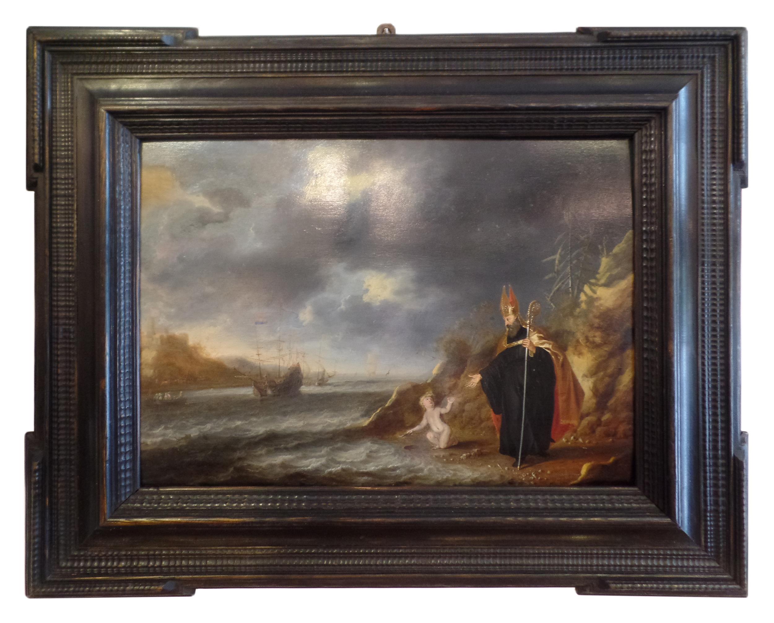Ölgemälde auf Eichenholztafel, gerahmt, um 1640 entstandenes Seestück des Bonaventura Peeters d.Ä. (1614 Antwerpen - 1652 Hoboken), die Figuren von Abraham Willemsen (ca. 1600 Antwerpen - 1672 ebda.), im Vordergrund die Legende des Heiligen Augustinus, dem ein unschuldiges Kind die Unergründlichkeit der Heiligen Dreifaltigkeit vor Augen führt, indem es mit dem Löffel das Meer (in die Schale) ausschöpft. Meisterliche Ausführung der stürmischen Küstenlandschaft samt detaillierter Darstellung von Vögeln, Fischen und zahlreichen Muscheln durch Peeters, der sogar den hölzernen Maluntergrund durch gewollte Auslassungen in seine malerische Komposition einbezieht. Exzellenter Zustand der Malschichte, nur geringste Restaurierungen. Eintragung in die Datenbank des Rijksbureau voor Kunsthistorische Dokumentatie in Den Haag bereits erfolgt.