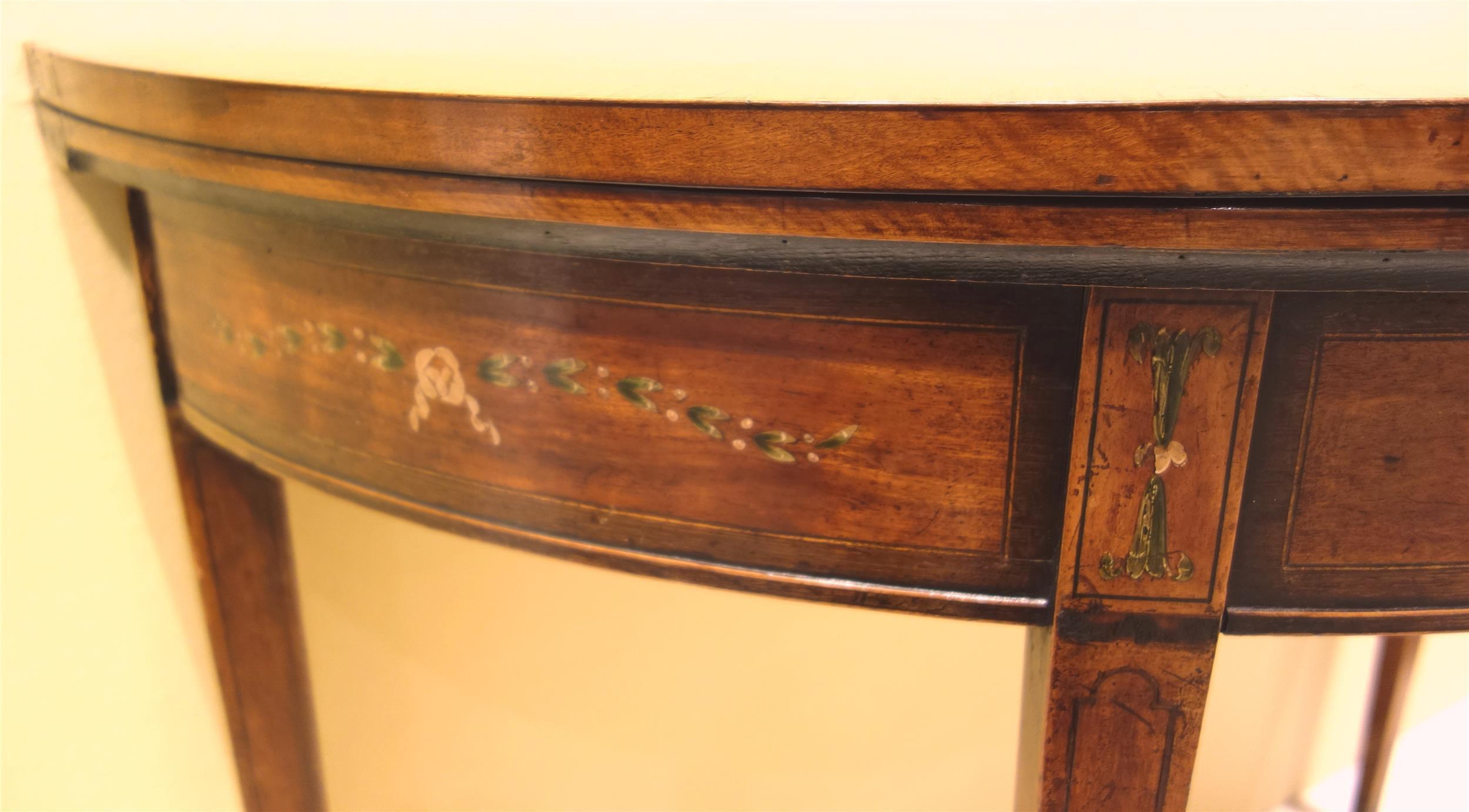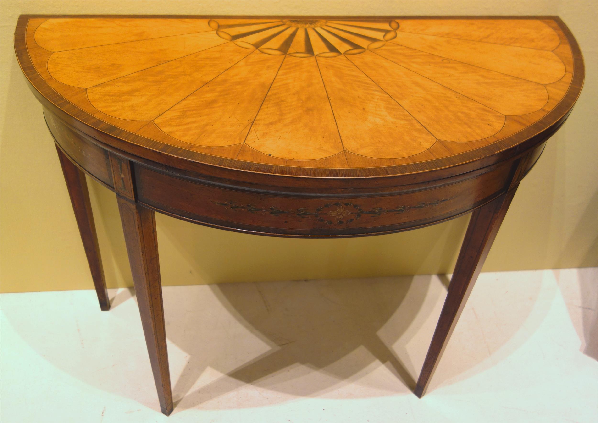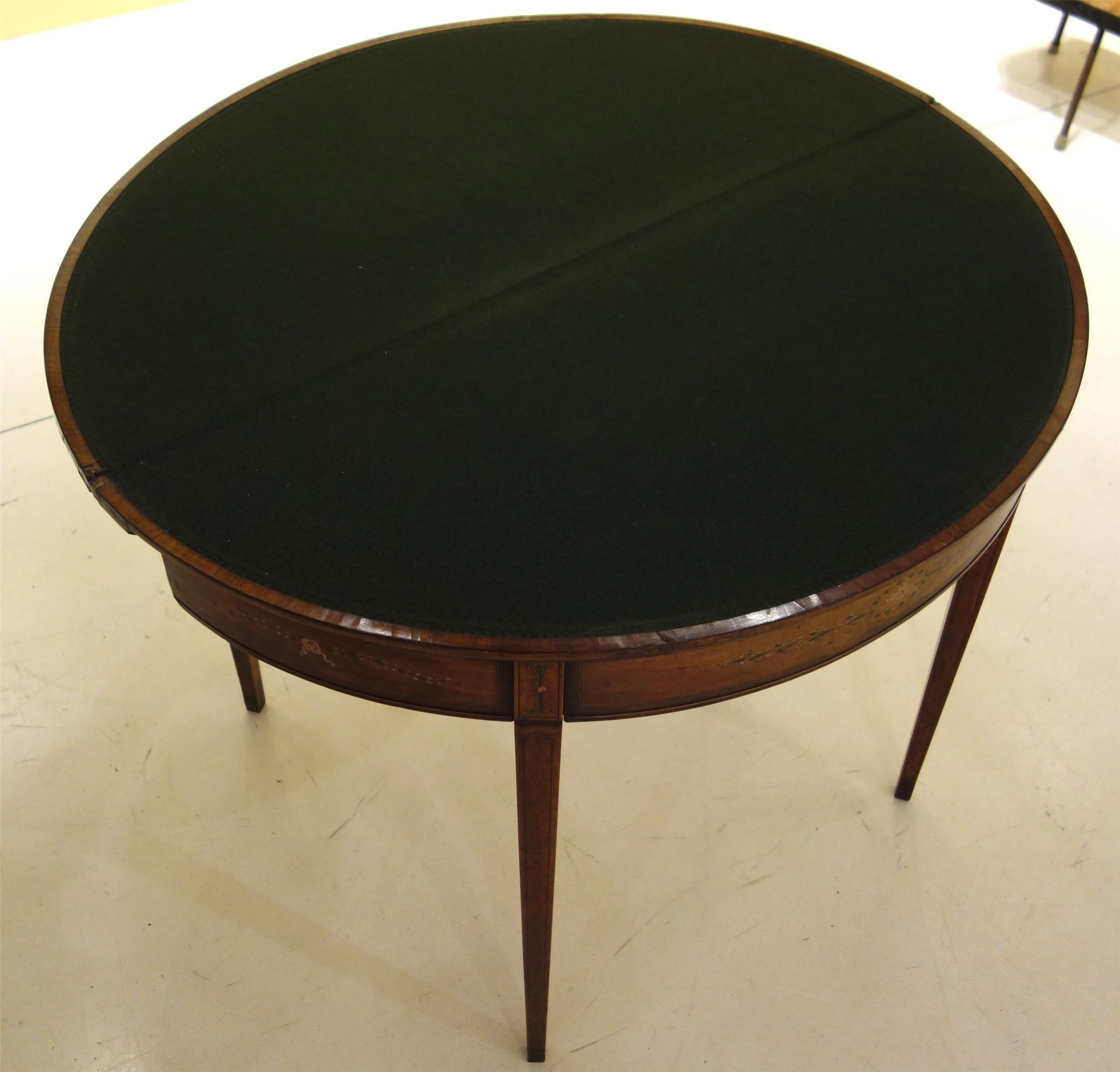Sheraton-Spieltisch, Zironen-, Oliven-, Rosen-, Ahorn- und Ebenholz mit farbiger Originalmalerei, Spielfläche alt mit Filz überzogen, England um 1790