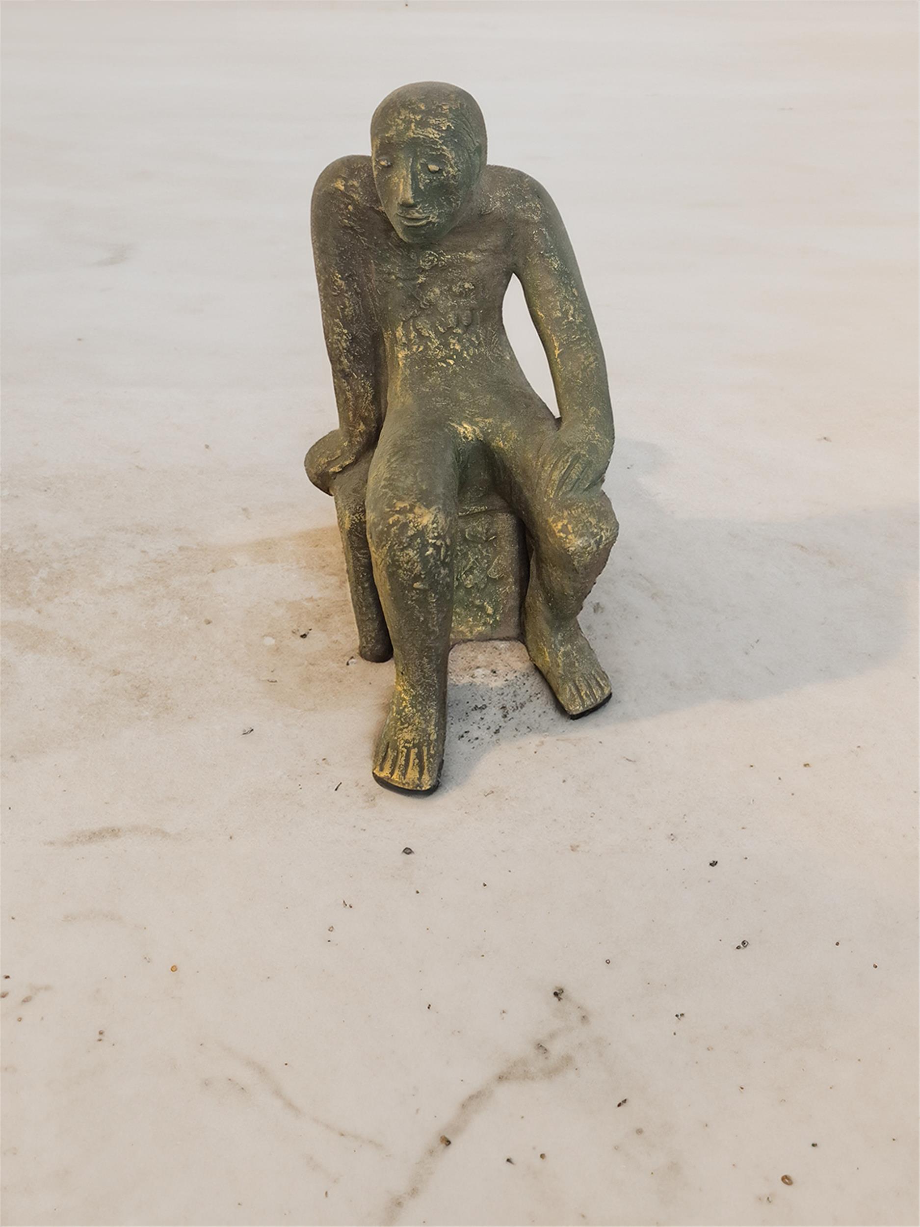 Auf einem niedrigen Block sitzt eine in sich versunkene Gestalt. Die Schultern sind leicht nach vorne gezogen, der Oberkörper neigt sich hinab, der Blick verliert sich nach unten. Die langen Arme hängen schwer herab, eine Hand stützt, die andere gleitet seitlich am Körper hinunter – als würde der Figur das eigene Gewicht plötzlich bewusst. In dieser ruhigen, beinahe tastenden Haltung verdichtet sich ein Moment der Nachdenklichkeit, vielleicht auch der Müdigkeit nach einem langen Tag.
