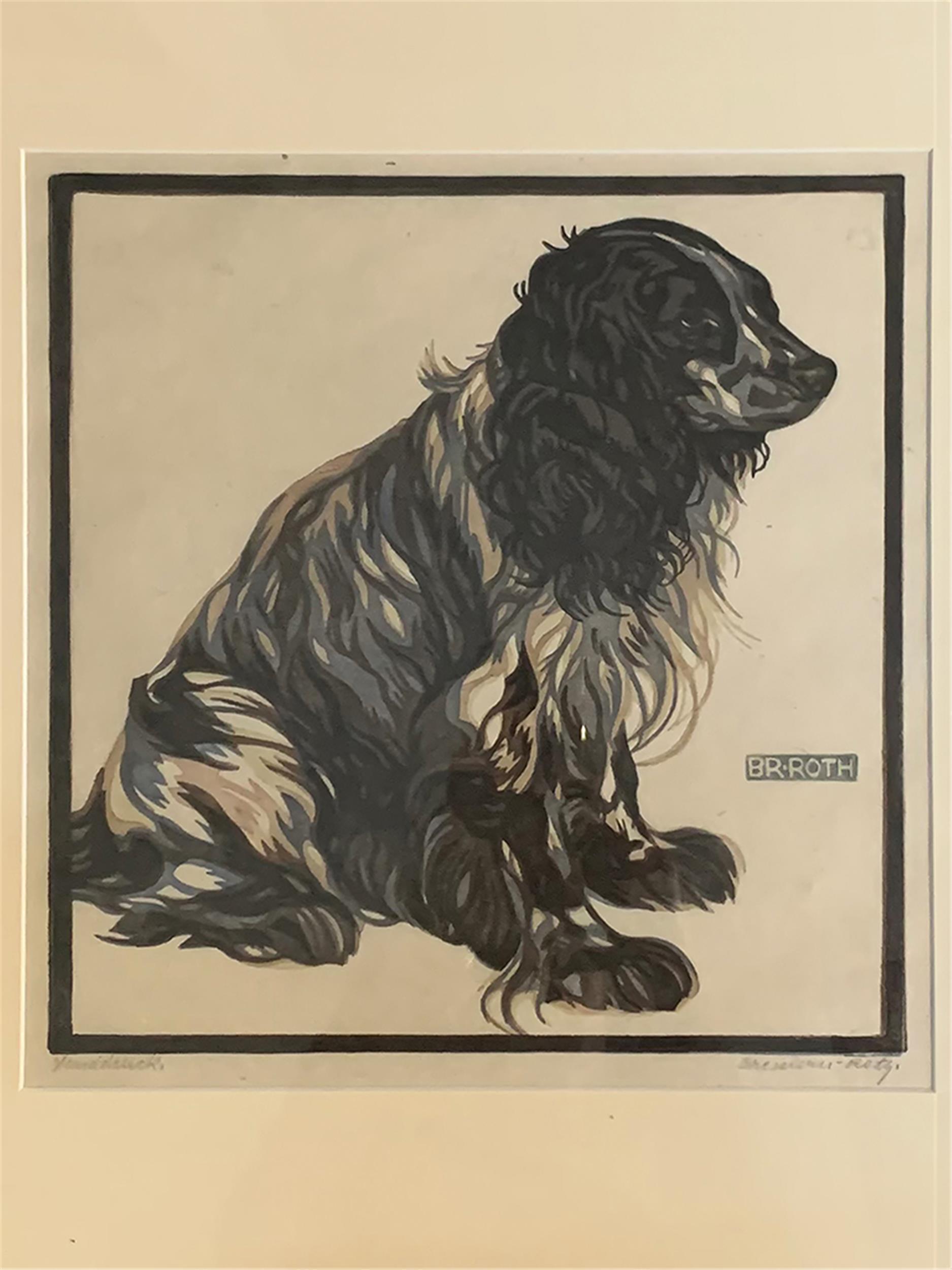 Der Farblinolschnitt "Spaniel" (Werksverzeichnis Nummer WVD 115) aus dem Jahr 1923, signiert von Norbertine Bresslern-Roth) ist ein weiteres Beispiel für die hochgeschätzten Tierdarstellungen dieser österreichischen Künstlerin.