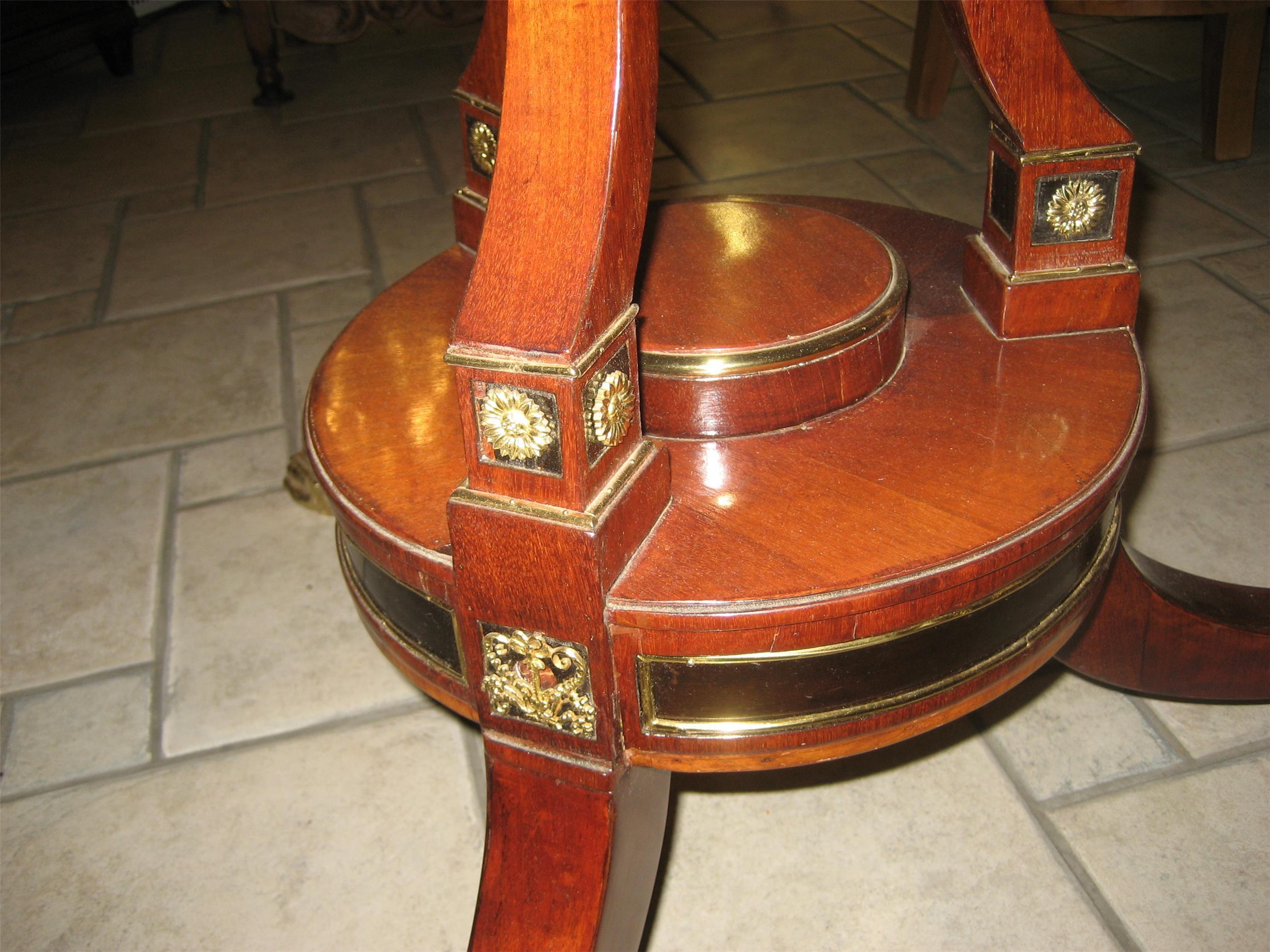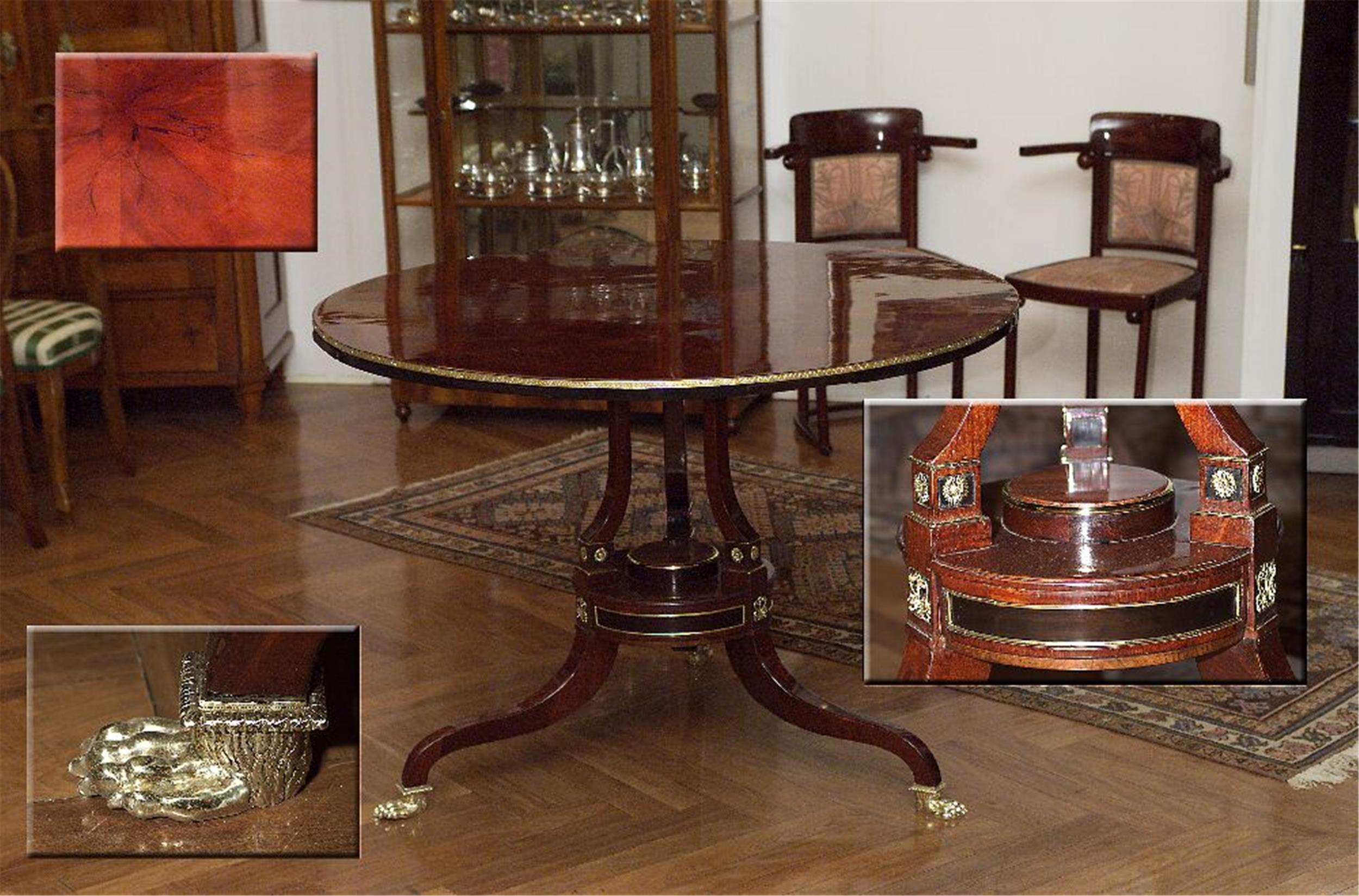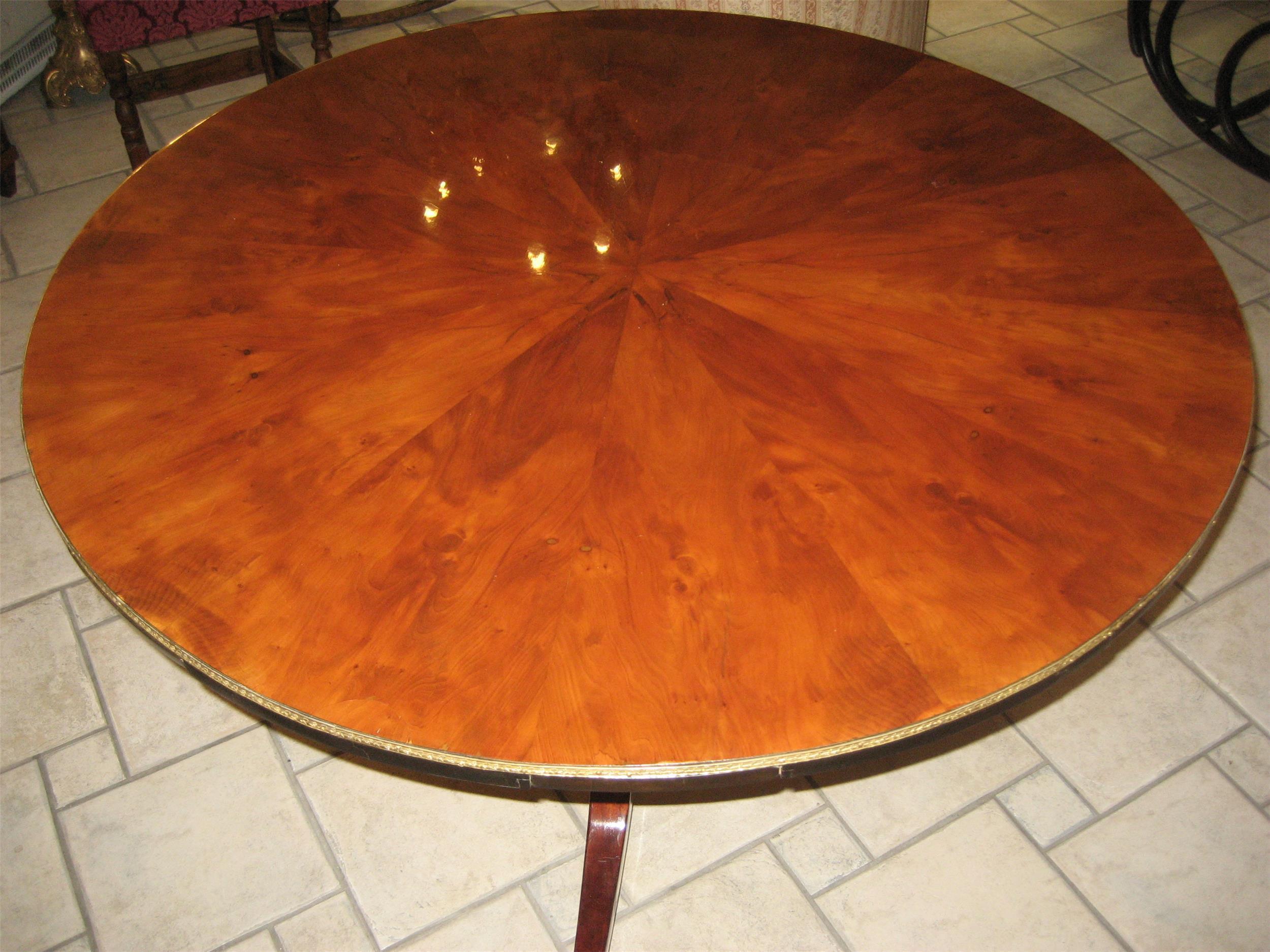 Dieser außergewöhnliche Biedermeier-Salontisch aus Wien um 1825 fasziniert durch seine klare Formensprache und sein besonders ansprechendes Nussbaum-Furnierbild, das sich in einer radialen – beinahe blütenartigen – Struktur über die gesamte runde Tischplatte erstreckt.