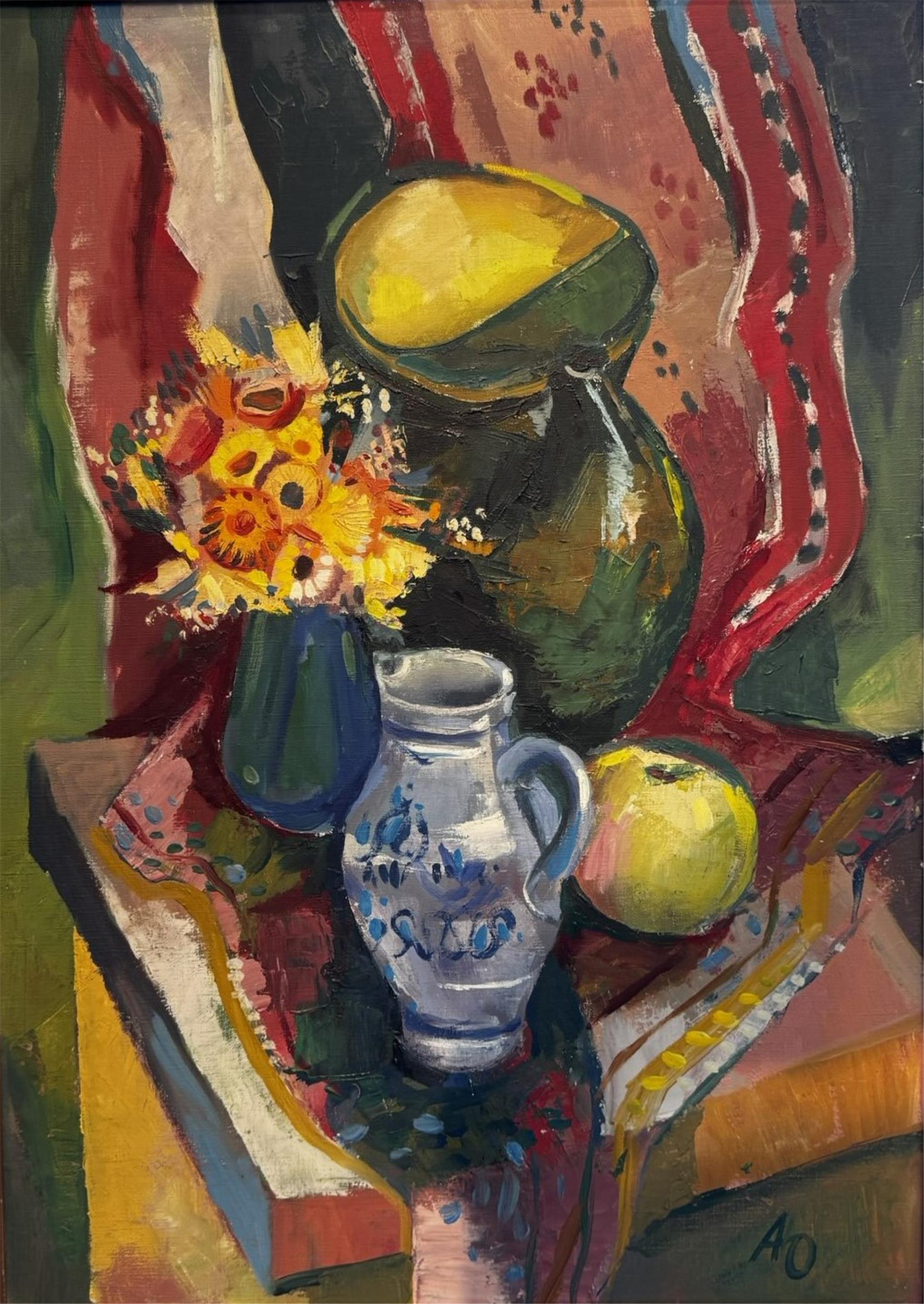 Ölgemälde auf Leinwand, Sillleben mit Apfel und Blumenstrauß, monogrammiert Adolf Osterider (1924 – 2019).